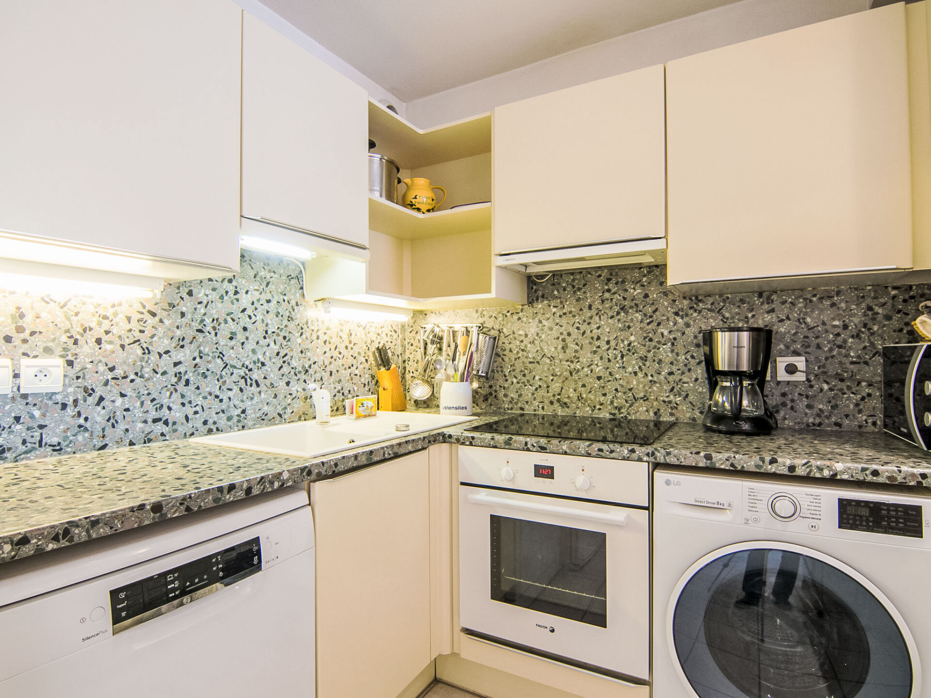 Appartement 3-kamers 72 m2 op de 3e verdieping. Woon-/eetkamer met 1 2-pers divanbed (1 x 160 cm, lengte 190 cm), TV, elektrische verwarming en air-conditioning. Uitgang naar het terras. 1 kamer met 1 2-pers bed (1 x 140 cm, lengte 190 cm). 1 kamer met 2 bedden (90 cm, lengte 190 cm). Open keuken (oven, afwasmachine, 4 keramische glas kookplaten, broodrooster, waterkoker, magnetron, diepvriezer, elektrische koffiemachine). Badkamer, aparte WC. Terras. Ter beschikking: wasmachine. Internet (Internet (WiFi), gratis). Parkeerplaats nr. 27. Niet rokers woning. Rookmelders.