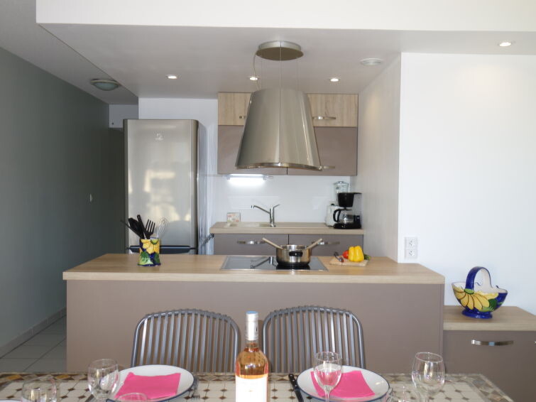 Appartement 2-kamers 48 m2 op de 1e verdieping. Woon-/eetkamer met 1 2-pers divanbed (140 cm, lengte 195 cm), TV. 1 kamer met 1 2-pers bed (140 cm, lengte 190 cm). Cabine met 1 x 2 stapelbedden (90 cm, lengte 180 cm). Kookhoek (afwasmachine, 3 keramische glas kookplaten, diepvriezer, combimagnetron). Badkamer, aparte WC. Elektrische verwarming. Terras 6 m2, op het westen gelegen. Terrasmeubelen. Ter beschikking: wasmachine. Internet (Internet (WiFi), extra). Garage, hoogte 185 cm, breedte 245 cm. Niet rokers woning. Rookmelders. In plaats van een afgesloten slaapkamer bevinden sommige slaapgedeeltes zich in een open ruimte (galerij, nis, etc.). Aanbod door een particulier volgens art. 155, IV van CGI.