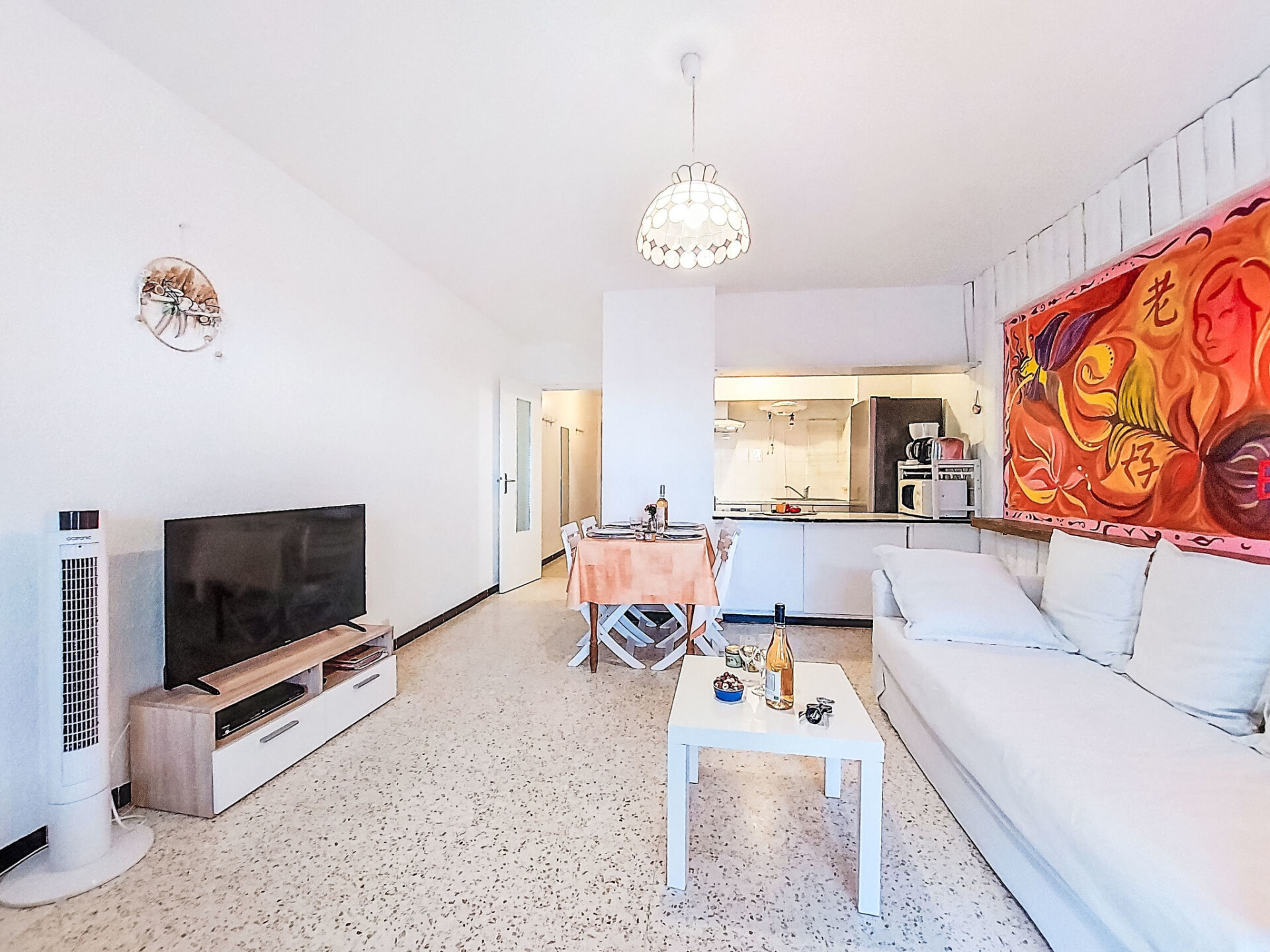 Appartement 2-kamers 48 m2 op de 4e verdieping. Woon-/eetkamer met 1 2-pers divanbed (145 cm, lengte 200 cm), TV. 1 kamer met 1 2-pers bed (140 cm, lengte 180 cm). Kookhoek (oven, afwasmachine, 4 keramische glas kookplaten, magnetron). Douche/WC. Terras 10 m2, overdekt, op het zuiden gelegen. Terrasmeubelen. Beperkt uitzicht op zee. Ter beschikking: Internet (WiFi, extra). Geen parkeerplaats. Maximaal 1 huisdier/hond toegestaan. Rookmelders.