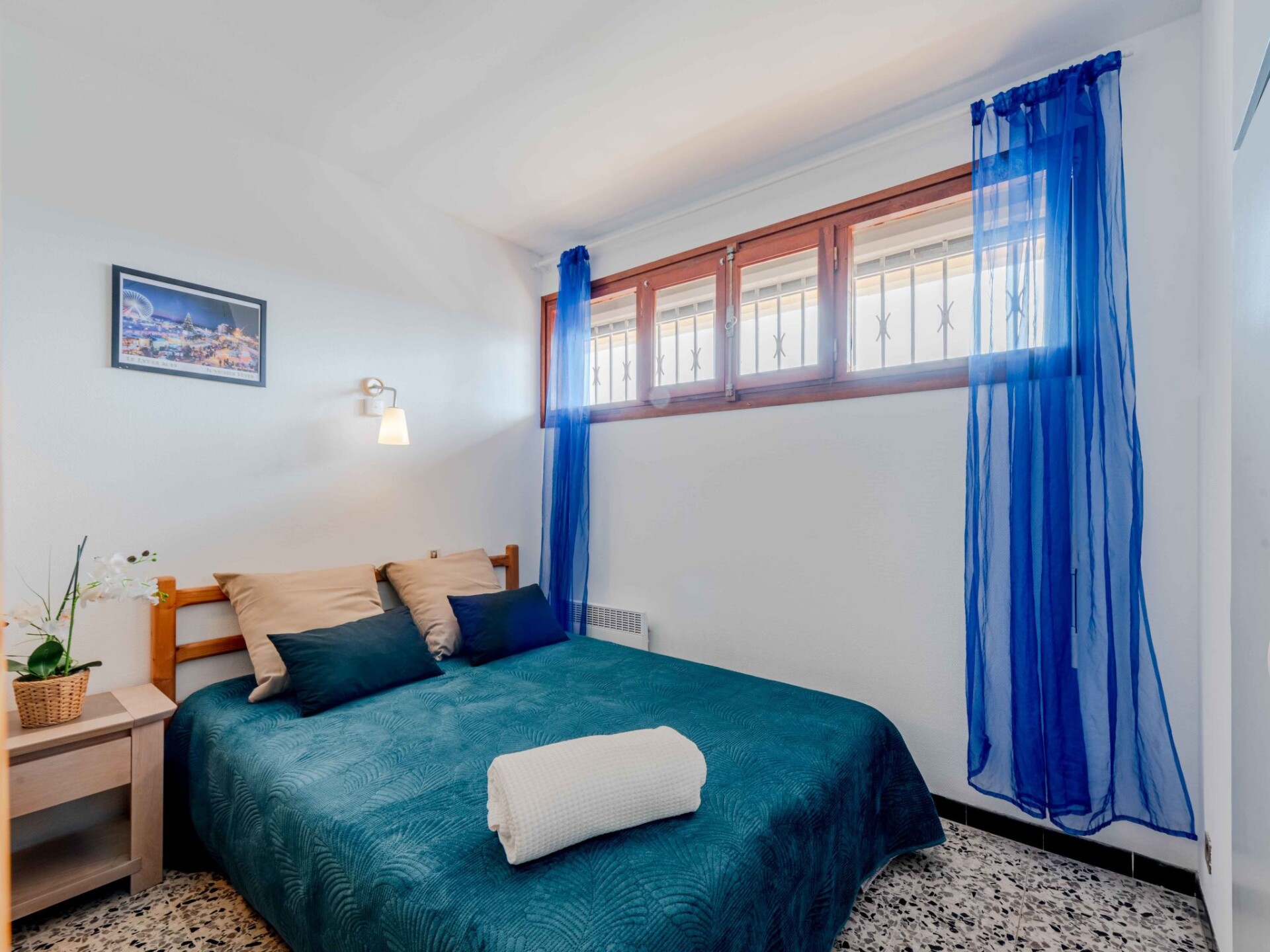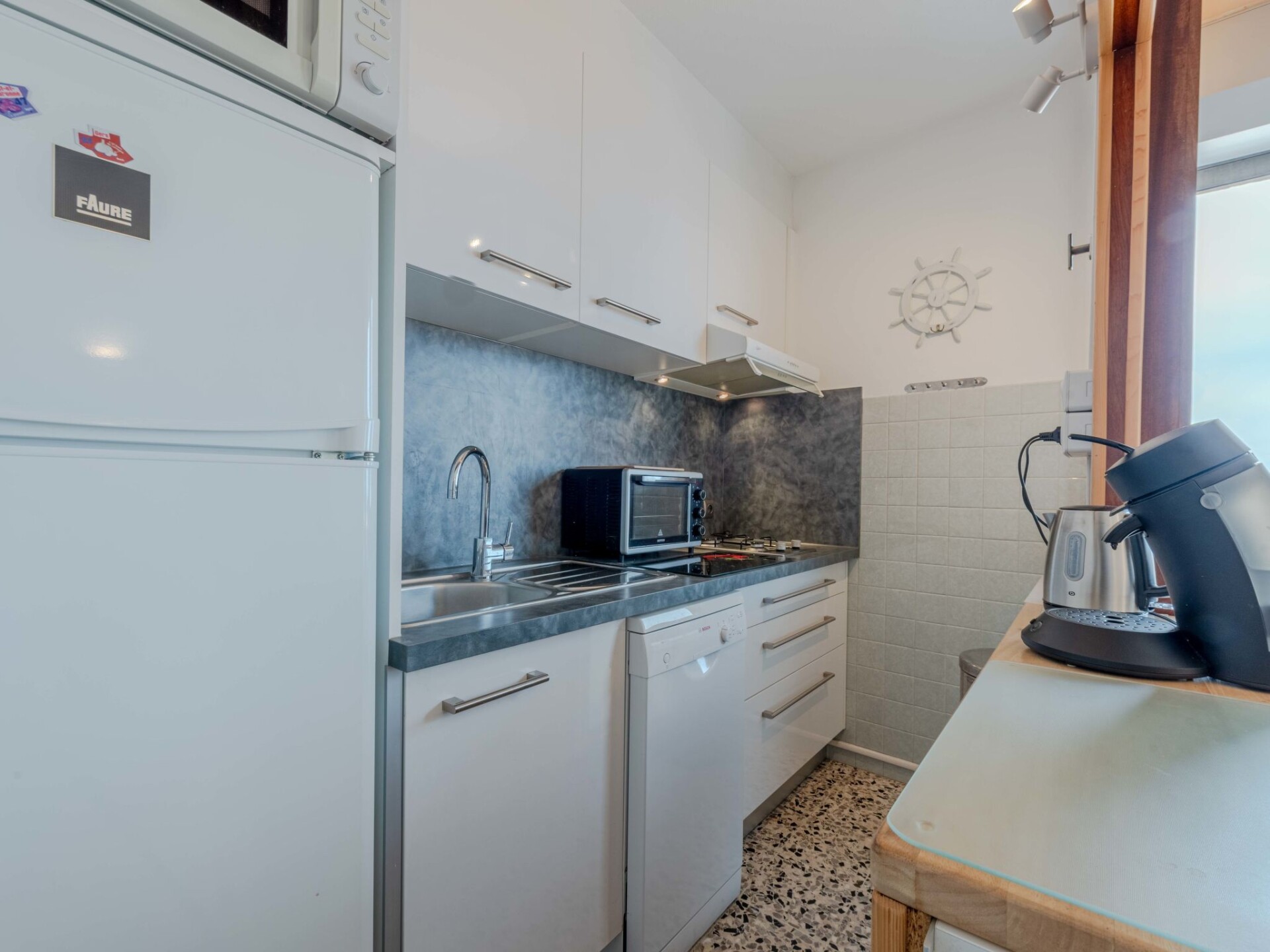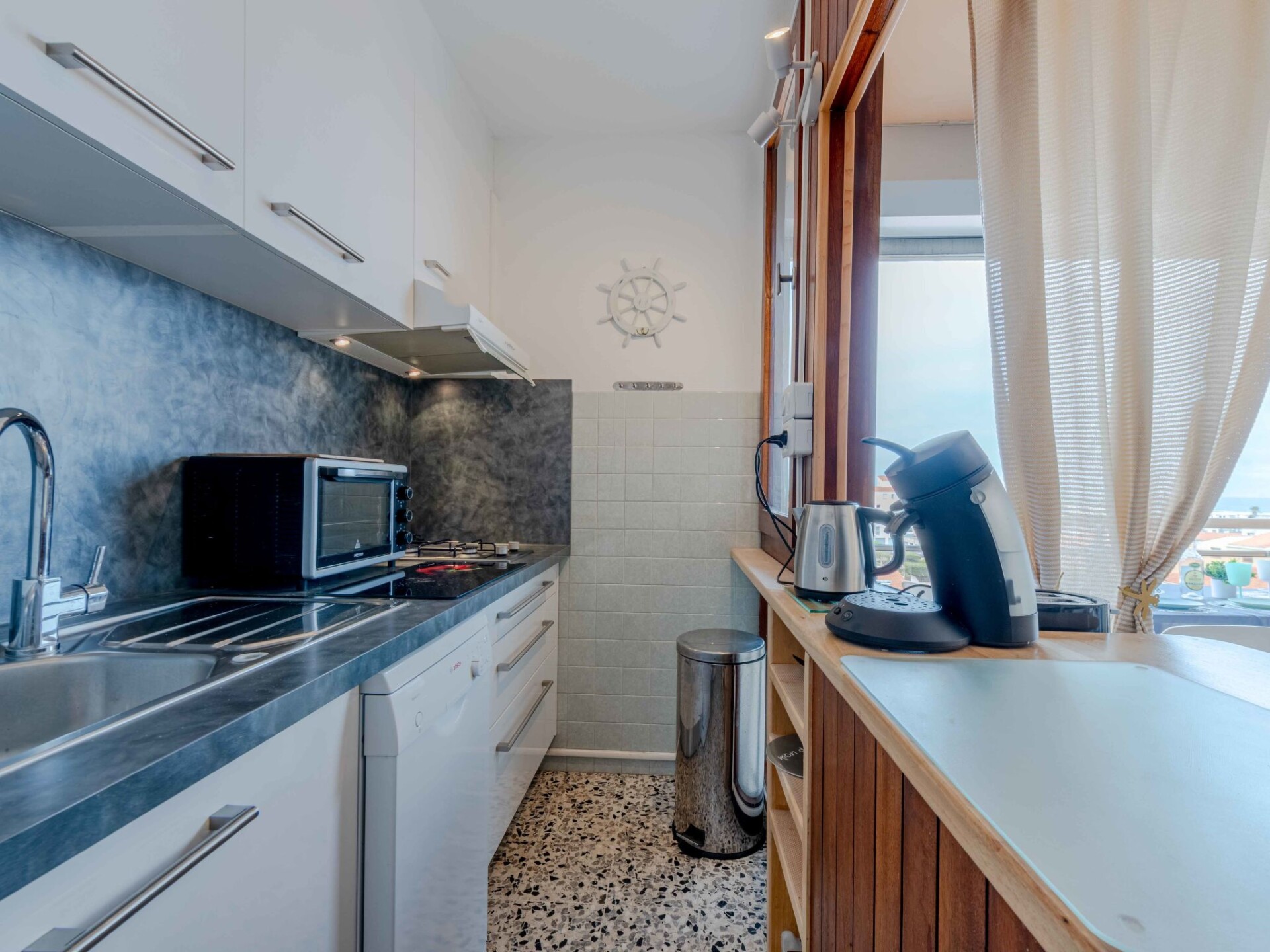 Appartement 2-kamers 40 m2 op de 5e verdieping, op het noorden gelegen. Woon-/eetkamer met 1 2-pers divanbed (1 x 140 cm, lengte 190 cm), TV (Flatscreen TV), elektrische kachel. Uitgang naar het balkon. 1 kamer met 1 x 2 stapelbedden (90 cm, lengte 190 cm), 1 2-pers bed (1 x 140 cm, lengte 190 cm), elektrische kachel. Open keuken (2-pits kookplaat, mini-oven, oven, afwasmachine, broodrooster, waterkoker, magnetron, elektrische koffiemachine). Douche/WC. Elektrische verwarming. Balkonmeubilair. Zijdelings uitzicht op zee en de bergen. Ter beschikking: wasmachine. Parkeerplaats (omheind). Rookmelders. Aanbod door een particulier volgens art. 155, IV van CGI.