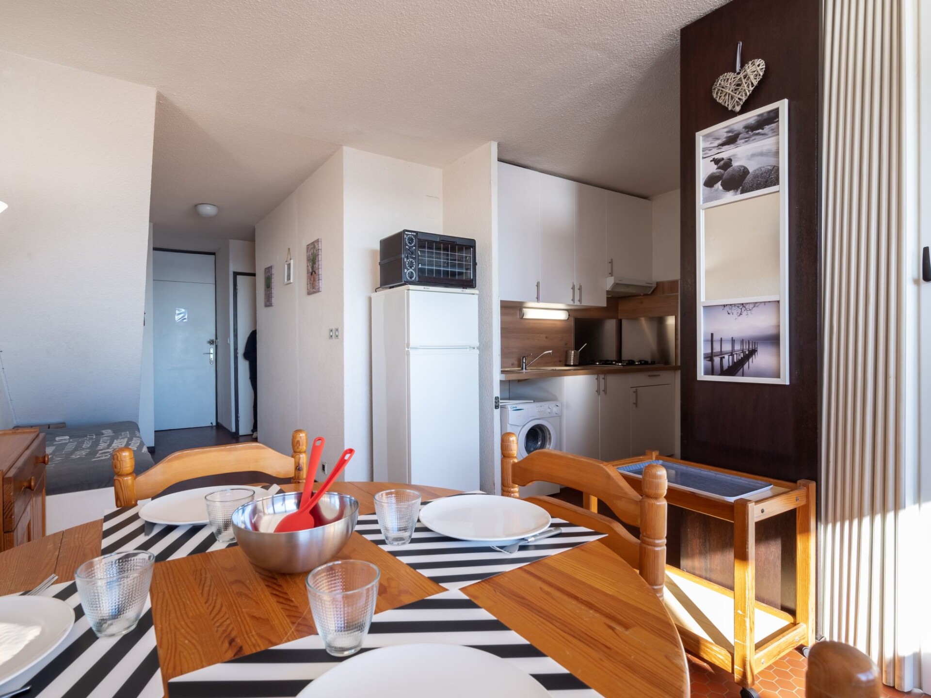 Appartement 1-kamer 45 m2 op de 6e verdieping. Woon-/eetkamer met gordijn met 1 2-pers divanbed (1 x 140 cm, lengte 190 cm), 1 uitschuifbaar bed (2 pers. 2 x 80 cm, lengte 190 cm), TV (Flatscreen TV). Uitgang naar het terras. Kookhoek (4-pits kookplaat, mini-oven, broodrooster, magnetron, elektrische koffiemachine). Zitbad, aparte WC. Elektrische verwarming. Terras 10 m2, op het oosten gelegen. Terrasmeubelen. Zeer mooi uitzicht op zee. Ter beschikking: wasmachine. Internet (Internet (WiFi), extra). Parkeerplaats. Rookmelders. Aanbod door een particulier volgens art. 155, IV van CGI.