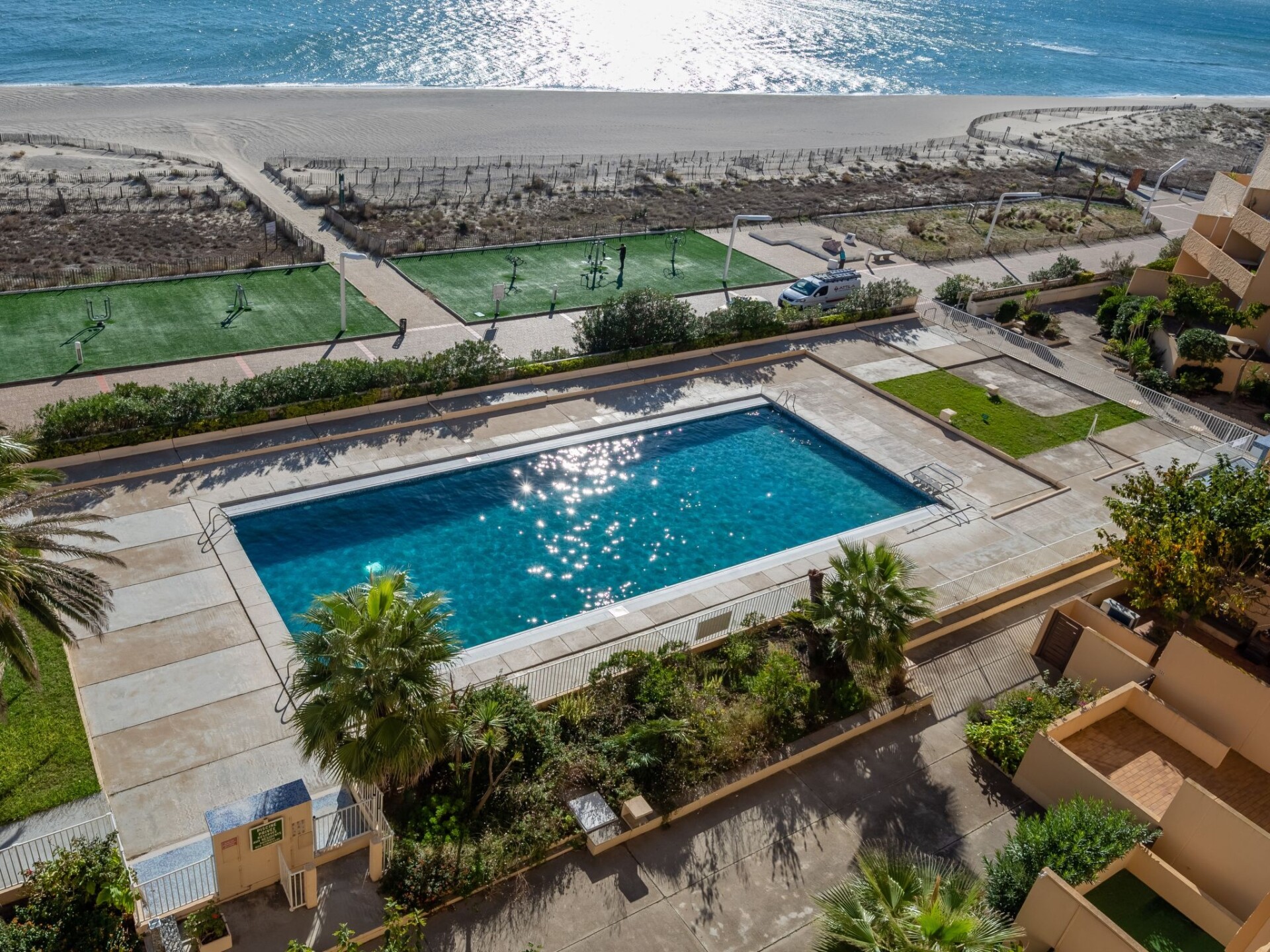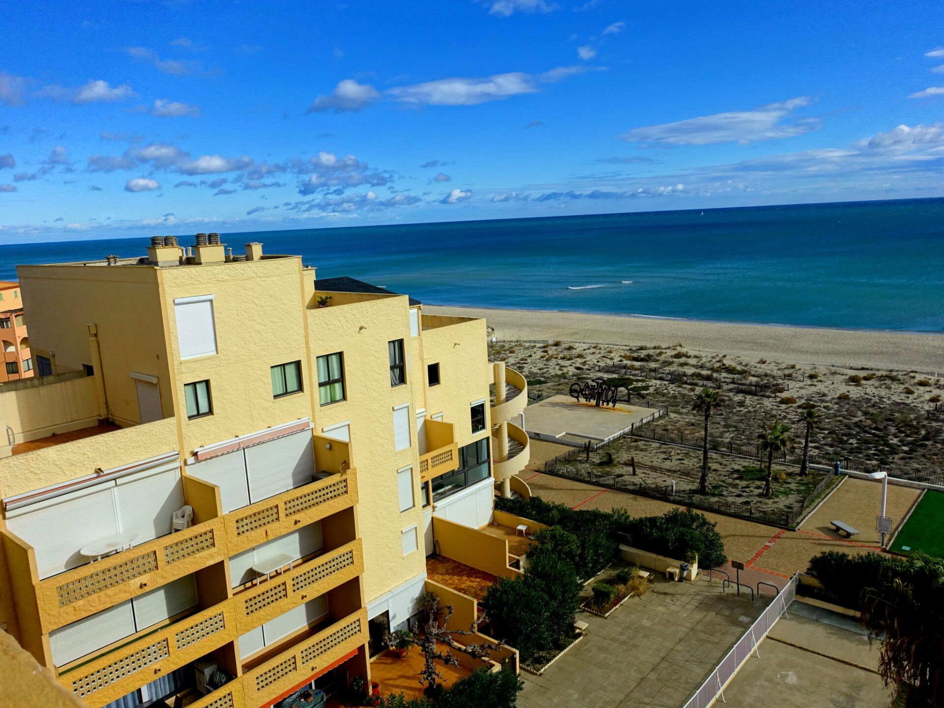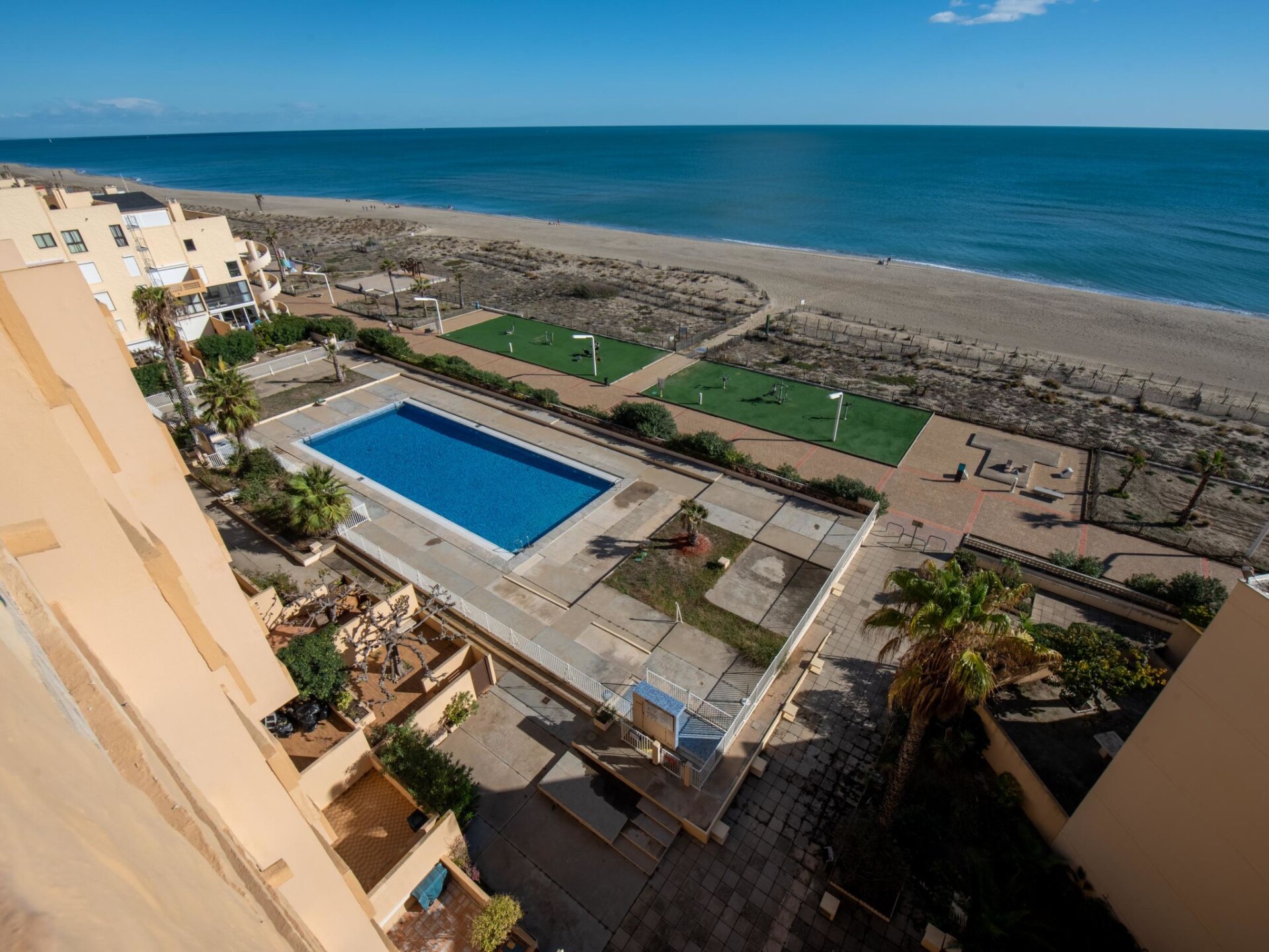 Residentie "Les Argonautes", van 7 verdiepingen. In de wijk La Grande Plage, 50 m van zee, 2.5 km van het meer, 50 m van het strand, directe toegang tot het strand. Voor medegebruik: openluchtzwembad hoekig (25 x 11 m, 150 - 220 cm diepte, seizoensgebonden beschikbaarheid: 01.Jun. - 30.Sep.). In het complex: lift. Parkeerplaats. Winkel, levensmiddelenwinkel 80 m, supermarkt 5 km, winkelcentrum, restaurant, bar, bakkerij, café 80 m, voetgangersgebied 50 m, fietsverhuur 80 m, bushalte "Lydia" 100 m, treinstation "Perpignan" 22 km, zandstrand 50 m, duikschool 5 km, openluchtzwembad 7 km, fKK-strand 10 km. Jachthaven 7 km, surfschool 2 km, zeilschool 3 km, tennis 3 km, tennishal 3 km, midgetgolf 2.5 km, manege 12 km. Attracties in de buurt: Aqualand Port Leucate 5 km, Réserve Africaine de Sigean 41 km, Parcours Aventure 5 km, cinéma 1.4 km, Téleski nautique site des dosses 5 km, Spot de windsurf 4 km. Bekende meren kunnen gemakkelijk worden bereikt: Etang de Leucate ou Salses 3 km, Lac de Villeneuve de La Raho 34 km. Wandelgebied Sentier du guetteur 8 km, La forteresse de salses 15 km, Sentier du littoral Collioure 40 km. Animatie in het hoogseizoen.