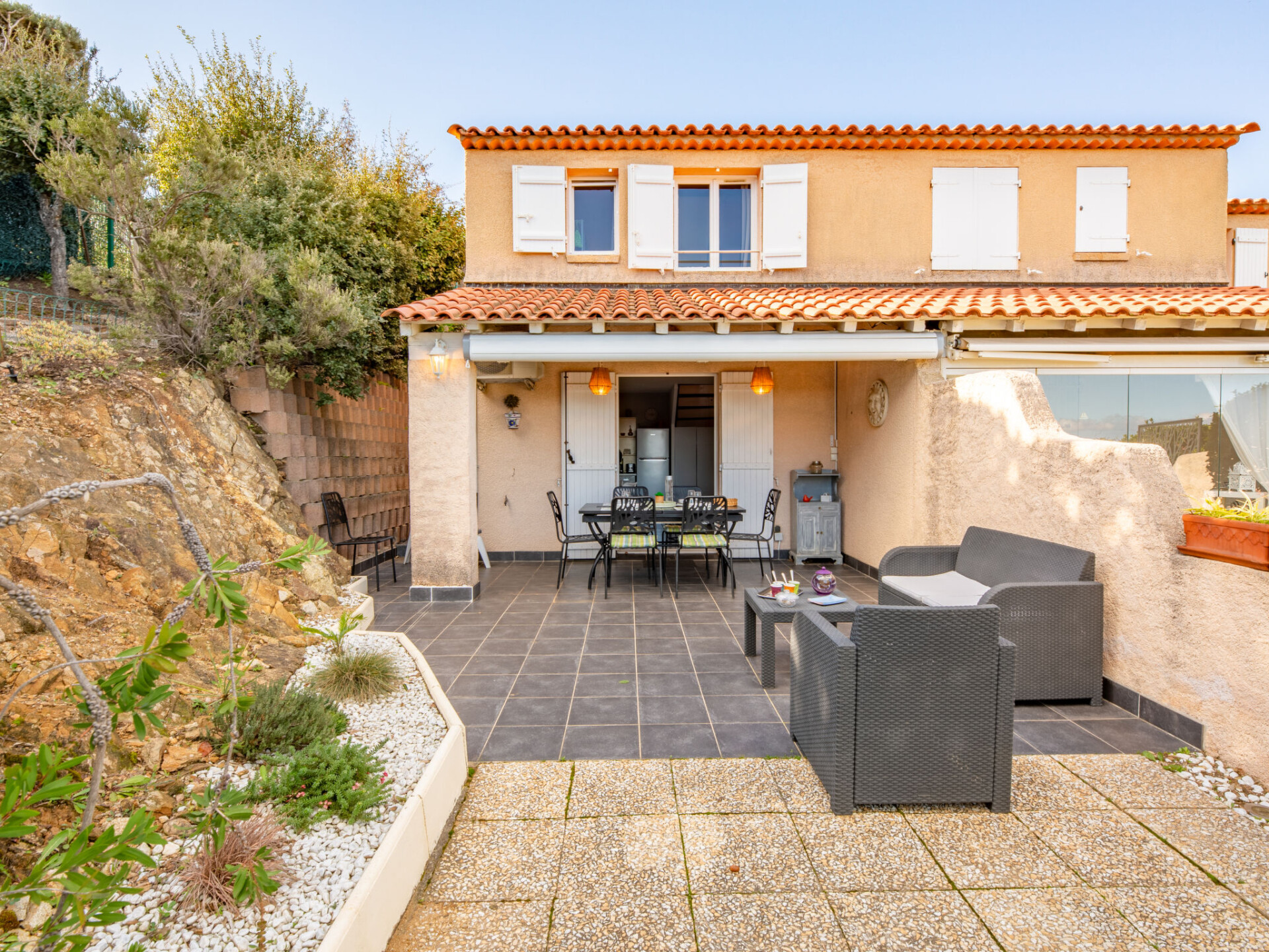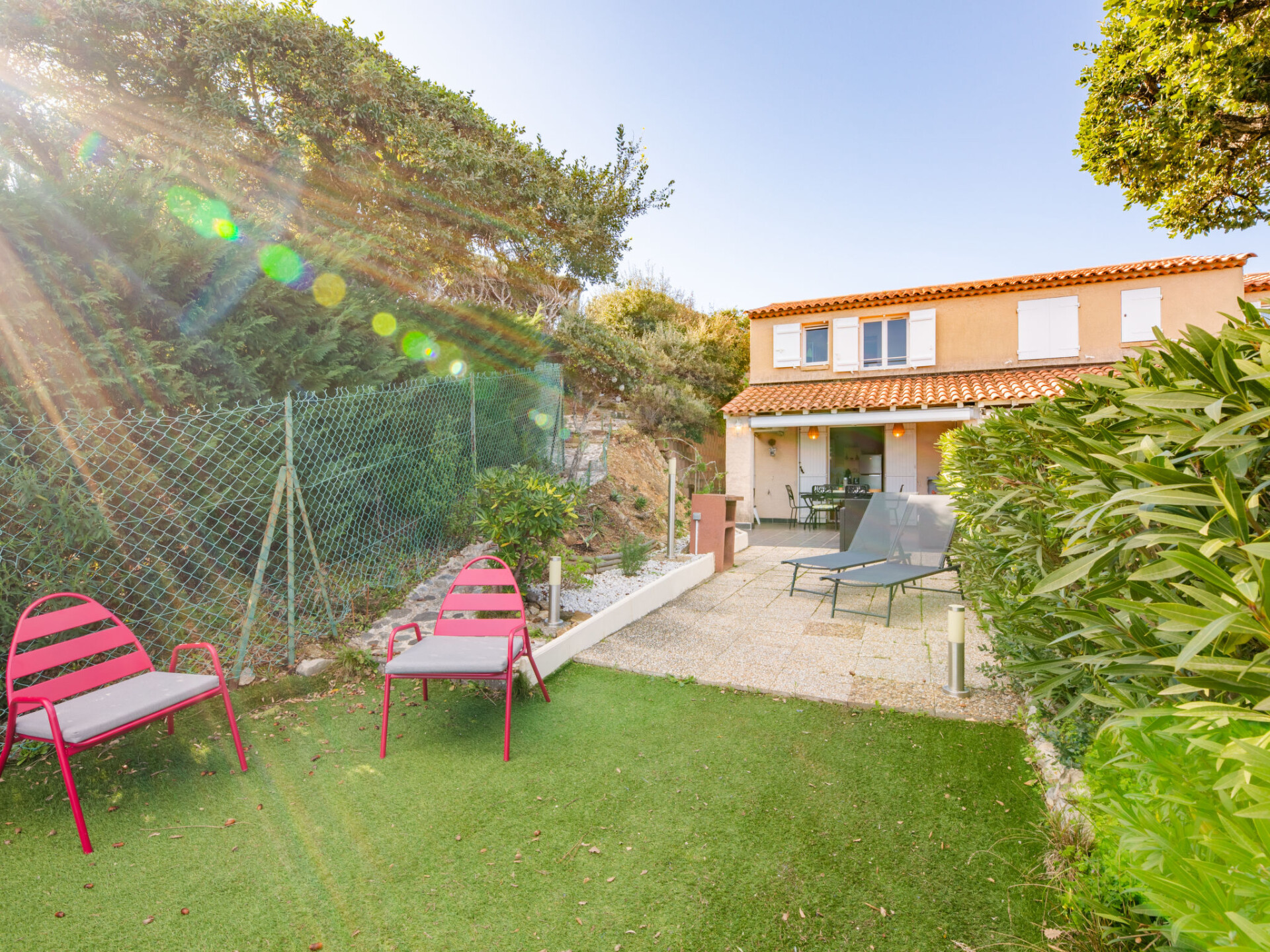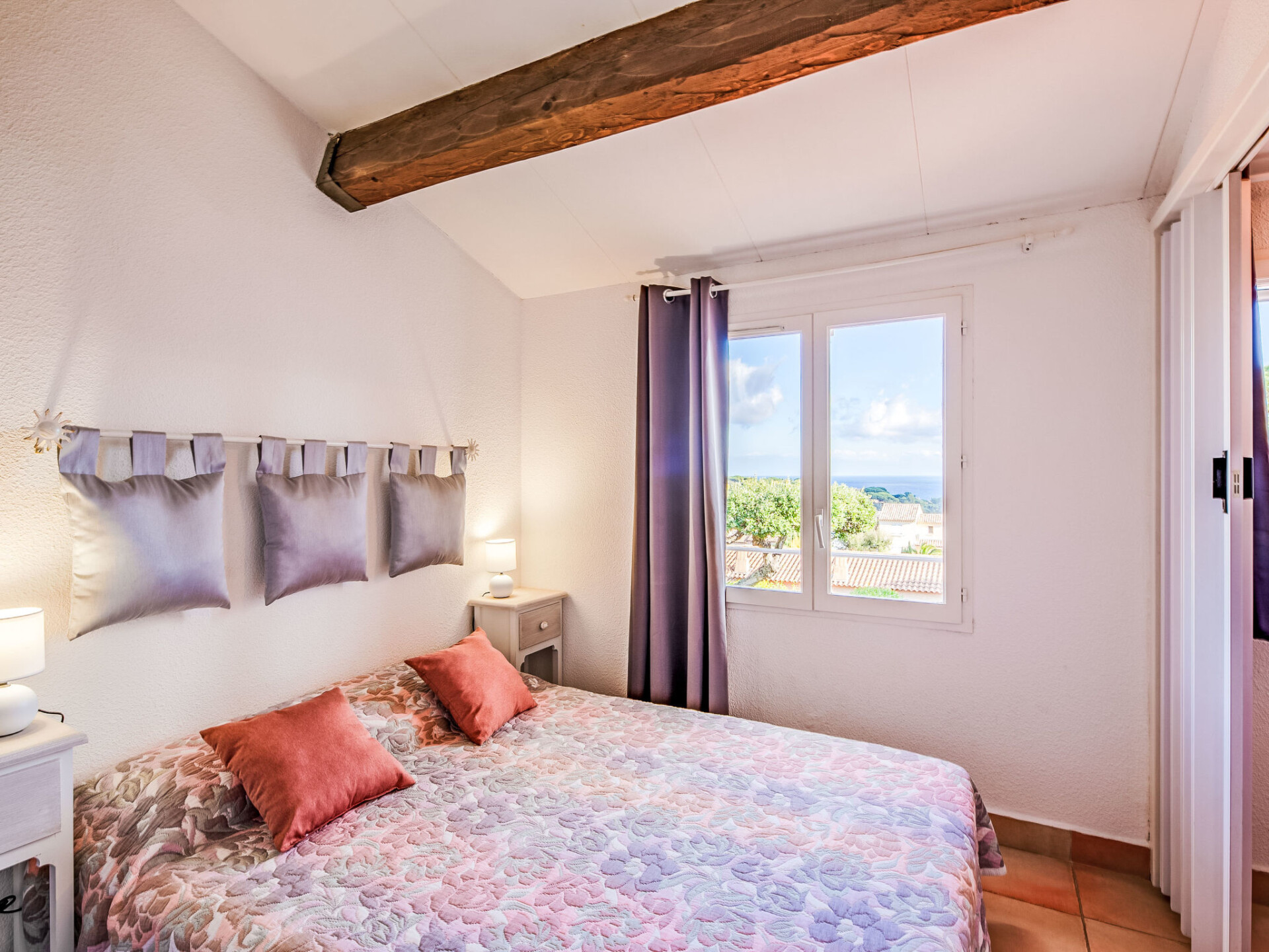 Huis in een rij 2-kamers 36 m2, op het zuiden gelegen. Gezellig ingericht: woon-/eetkamer met 1 2-pers divanbed (1 x 130 cm, lengte 190 cm), TV (Flatscreen TV), elektrische kachel. Uitgang naar het terras, naar de zitplaats in de tuin. Open keuken (mini-oven, afwasmachine, 2 keramische glas kookplaten, broodrooster, waterkoker, diepvriezer, elektrische koffiemachine). Bovenverdieping: (steile trap), 1 kleine kamer met 1 2-pers bed (1 x 140 cm, lengte 190 cm). Kleine cabine 7 m2 met 1 x 2 stapelbedden (90 cm, lengte 190 cm). Douche/WC. Elektrische verwarming, air-conditioning. Terras 45 m2. Terrasmeubelen. Uitzicht op zee. Ter beschikking: wasmachine, strijkijzer, haardroger. Internet (Internet (WiFi), gratis). Parkeerplaats nr. 45. Niet rokers woning. Rookmelders. Aanbod door een particulier volgens art. 155, IV van CGI. 83115005401DP