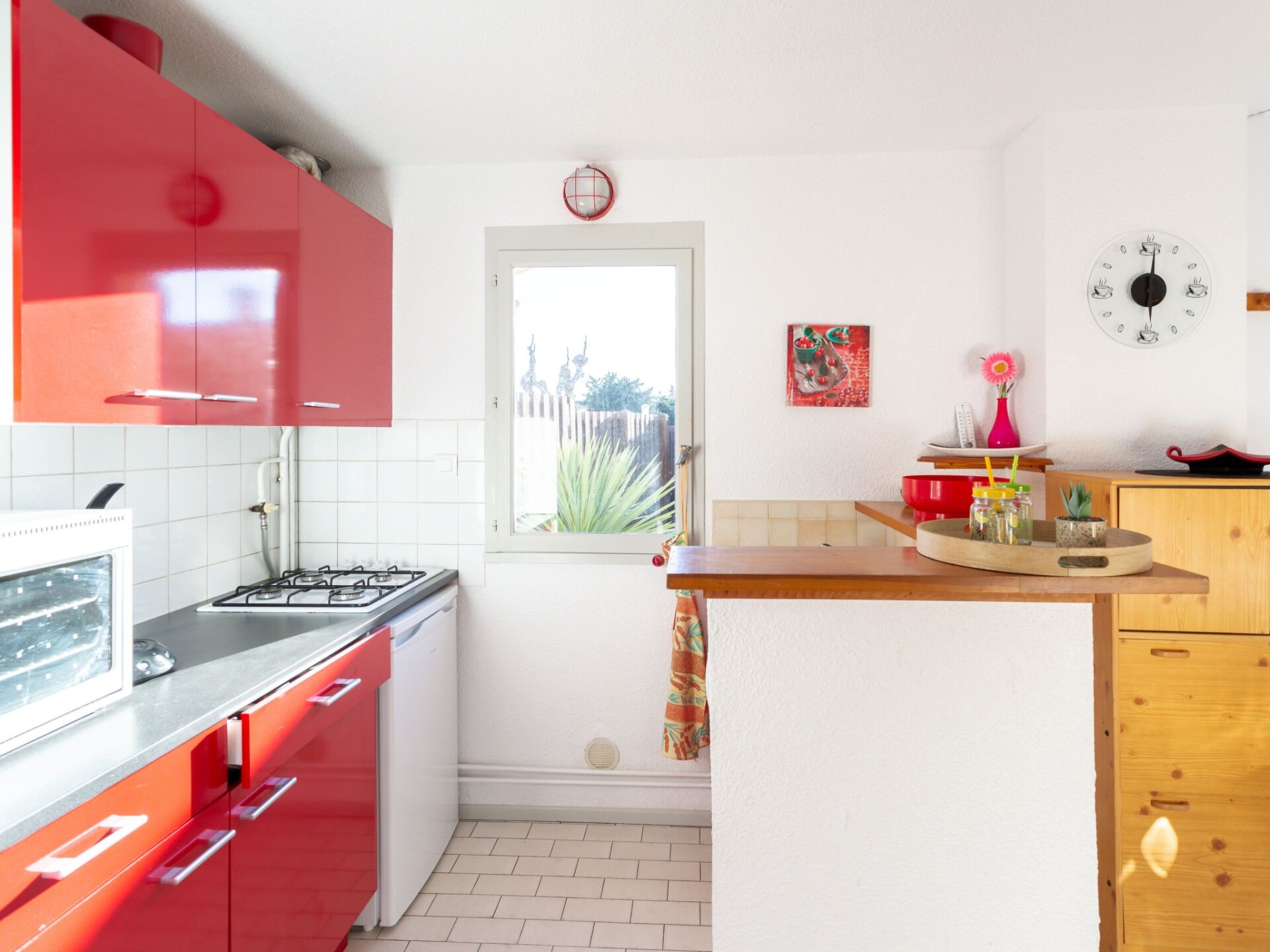 Huis in een rij 3-kamers 40 m2 op 2 verdiepingen. Woon-/eetkamer met 1 2-pers divanbed (140 cm, lengte 190 cm), TV (Flatscreen TV). Uitgang naar het terras. Open keuken (4-pits kookplaat, oven, waterkoker, magnetron, diepvriezer, elektrische koffiemachine). Bovenverdieping: 1 kamer met 1 x 2 stapelbedden (90 cm, lengte 190 cm). 1 kamer met 1 2-pers bed (140 cm, lengte 190 cm). Badkamer, aparte WC. Groot terras 30 m2, kleine zithoek in de tuin 10 m2. Terrasmeubelen. Ter beschikking: wasmachine. Internet (Internet (WiFi), extra). Parkeerplaats nr. 68. Geschikt voor families. Rookvrij huis. Rookmelders. Aanbod door een particulier volgens art. 155, IV van CGI. FR7450.15.4