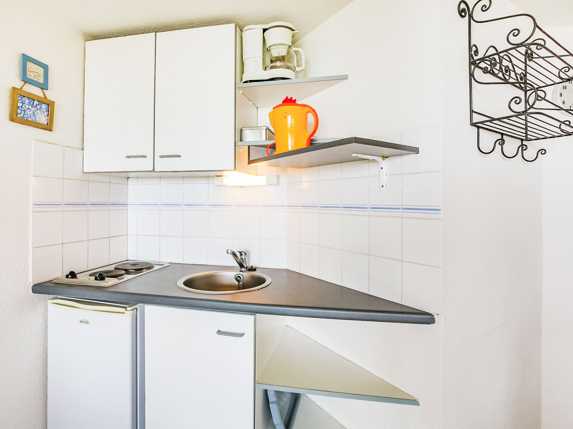 Studio 1-kamer 37 m2 op 2 verdiepingen op de 3e verdieping. Woon-/eetkamer met 1 2-pers divanbed (120 cm, lengte 190 cm), TV (Flatscreen TV). Uitgang naar het terras. Kookhoek (2-pits kookplaat, mini-oven, magnetron). Douche, aparte WC. Elektrische verwarming. Bovenverdieping: galerij, hoogte van het plafond 180 - 280 cm met 1 2-pers divanbed (130 cm, lengte 190 cm). Terras 6 m2, op het oosten gelegen. Terrasmeubelen. Mooi uitzicht op zee en het zwembad. Ter beschikking: Internet (Internet (WiFi), extra). Parkeerplaats. Rookmelders. In plaats van een afgesloten slaapkamer bevinden sommige slaapgedeeltes zich in een open ruimte (galerij, nis, etc.).