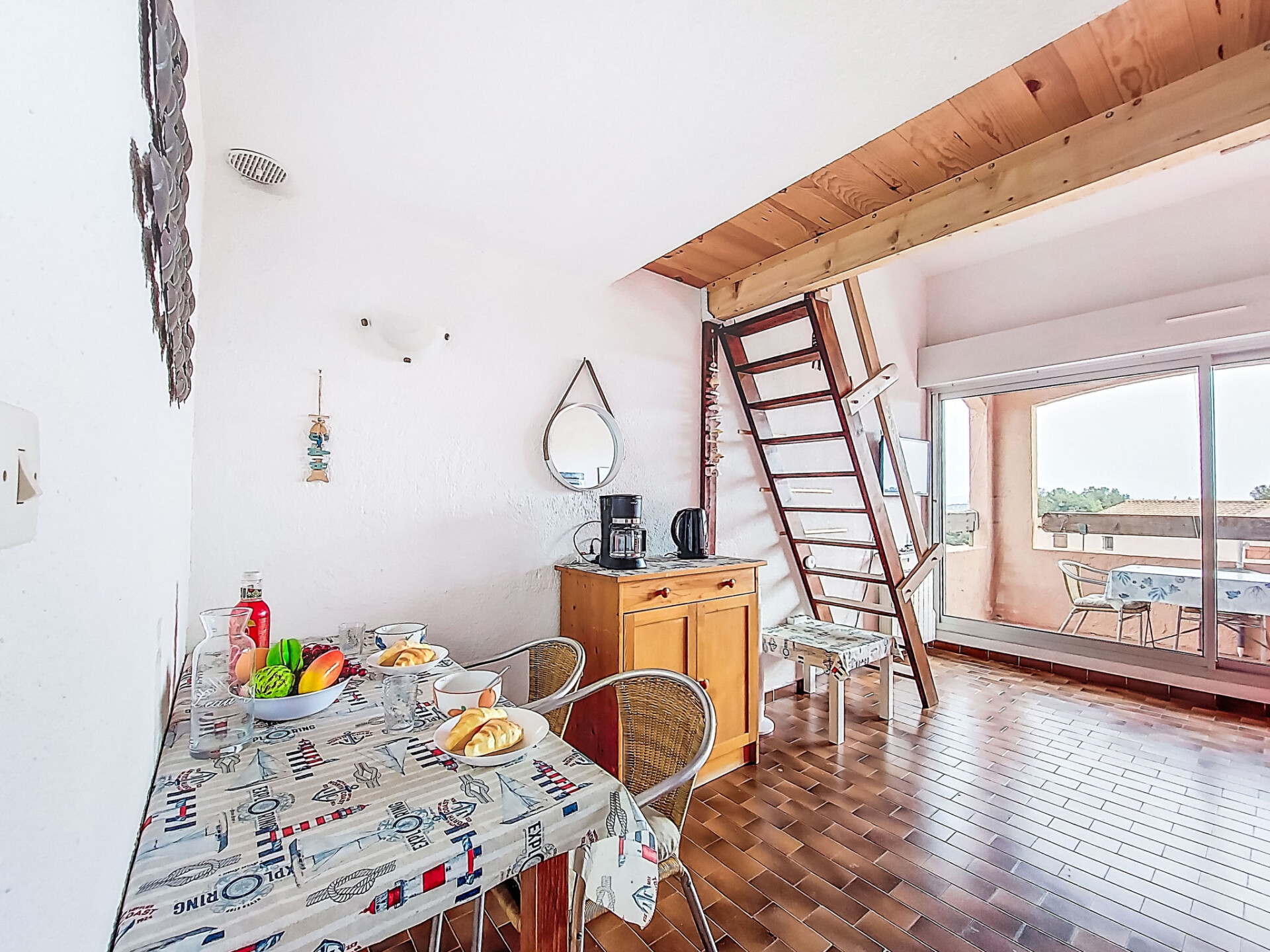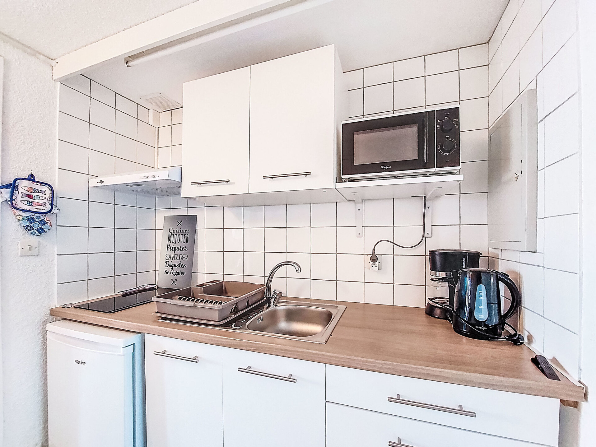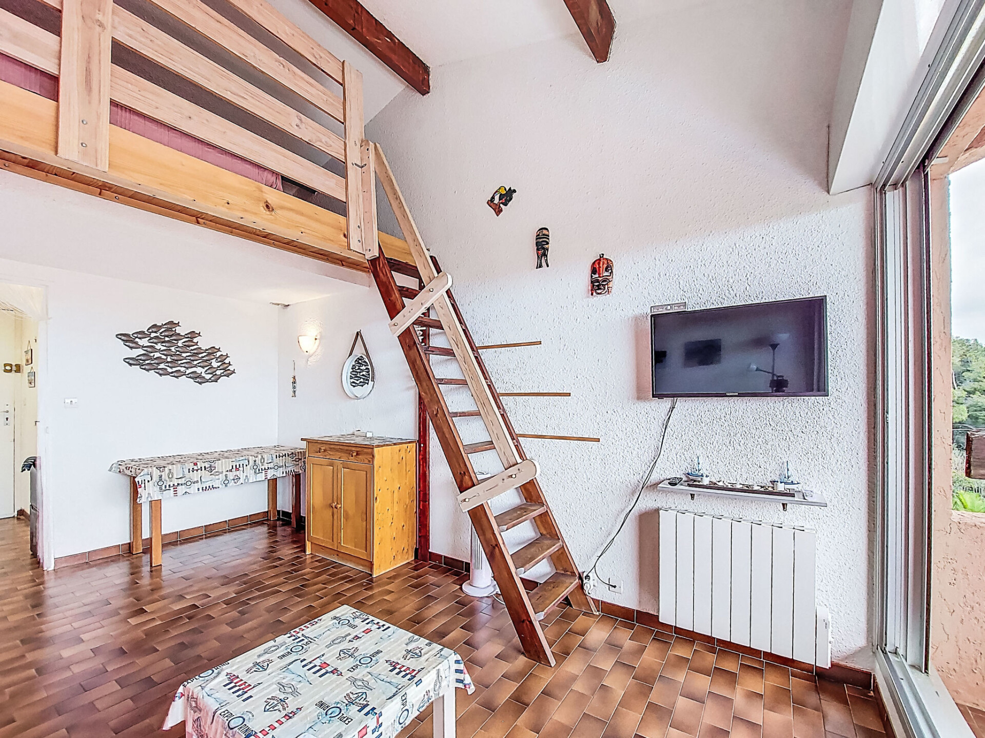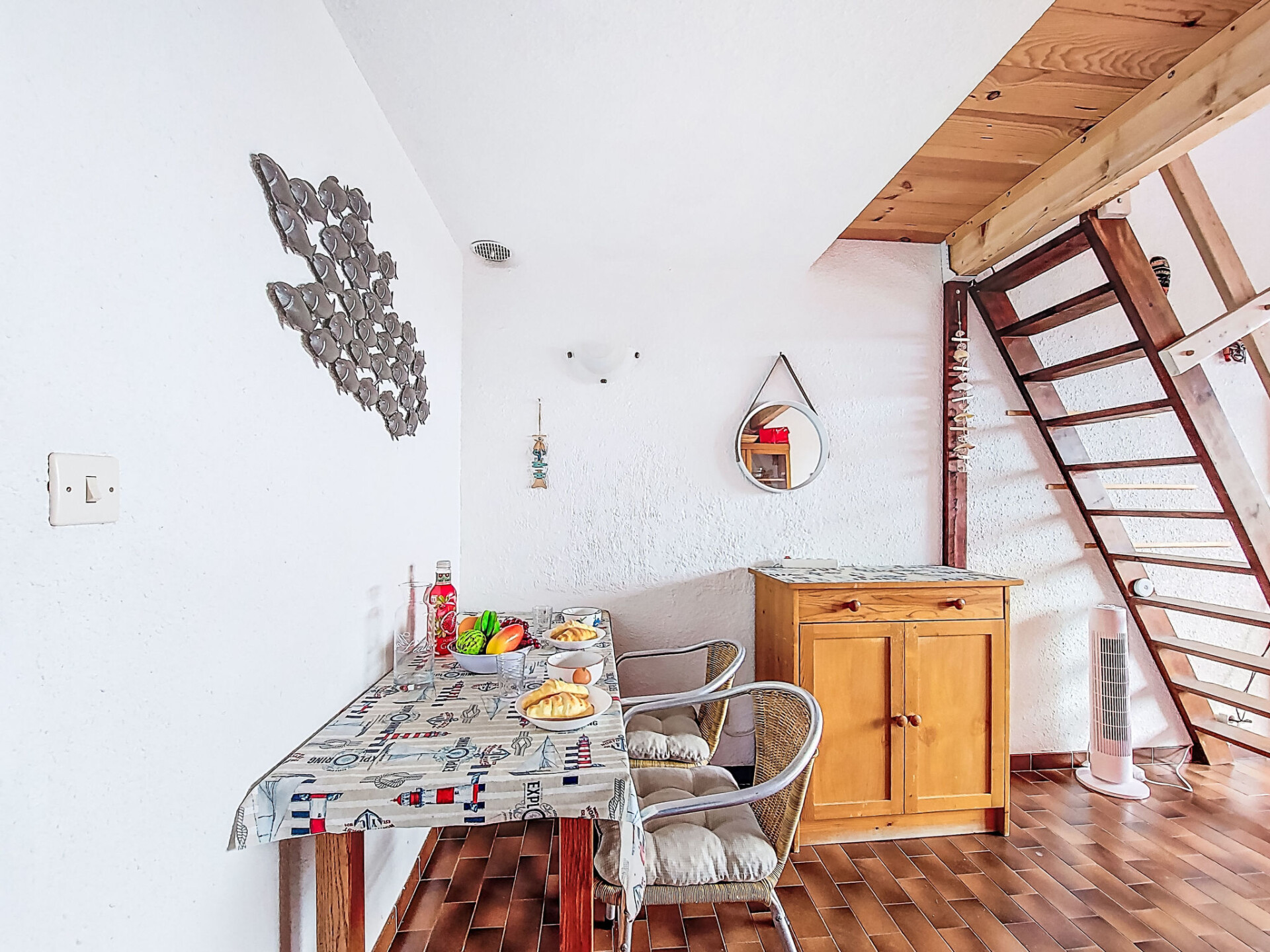 Studio 1-kamer 28 m2 op 2 verdiepingen op de 1e verdieping. Eenvoudig en doelmatig ingericht: woon-/eetkamer met 1 2-pers divanbed (130 cm, lengte 190 cm), TV en ventilator. Uitgang naar het terras. Kookhoek in de hal (2 keramische glas kookplaten, waterkoker, magnetron, elektrische koffiemachine). Bad/WC. Elektrische verwarming. Bovenverdieping: (steile trap) open galerij met afgeschuinde daken, hoogte van het plafond 65 - 140 cm met 1 2-pers bed (140 cm, lengte 190 cm), ventilator. Terras 6 m2, overdekt, op het zuidoosten gelegen. Terrasmeubelen. Uitzicht op zee. Ter beschikking: Internet (WiFi, extra). Parkeerplaats nr. 63. TV alleen FR. Rookmelders. 83009 000020 RR