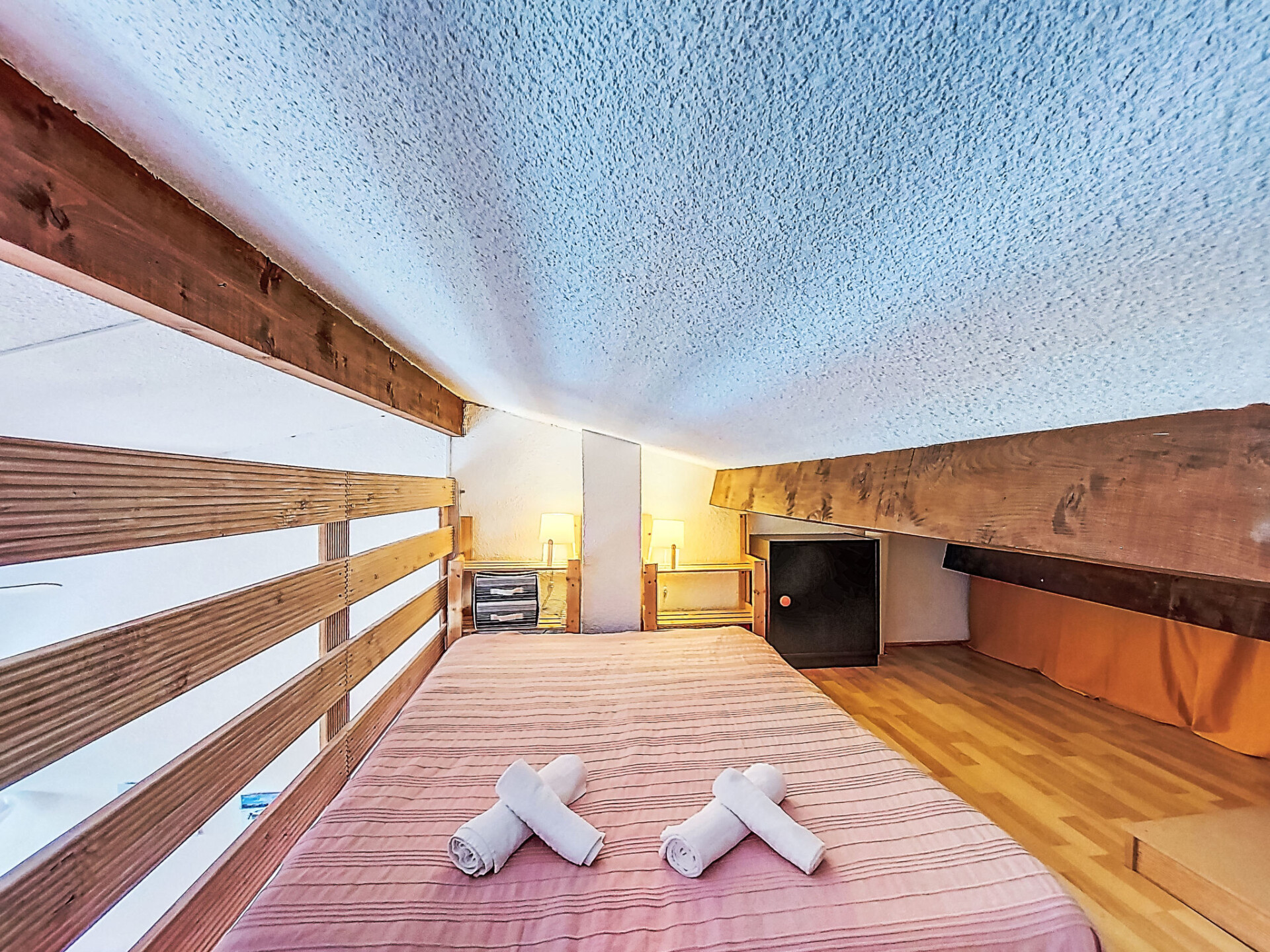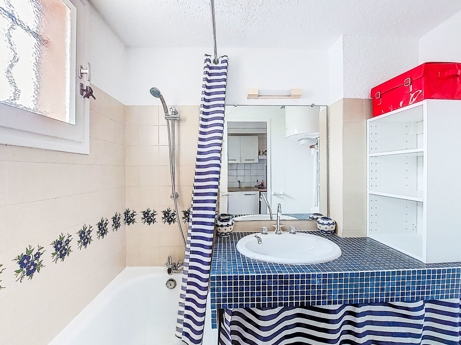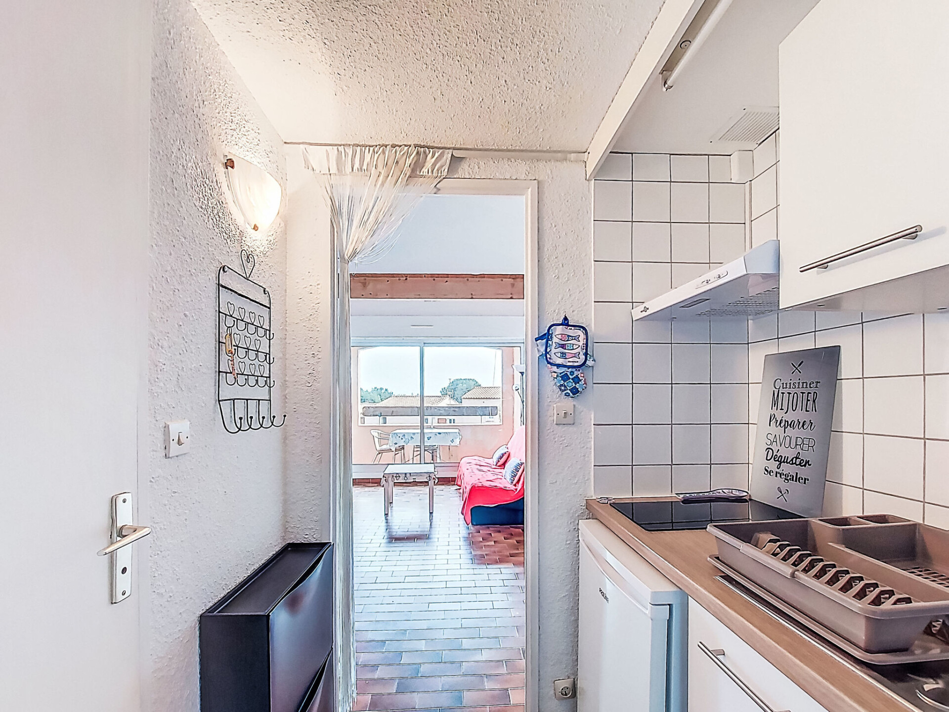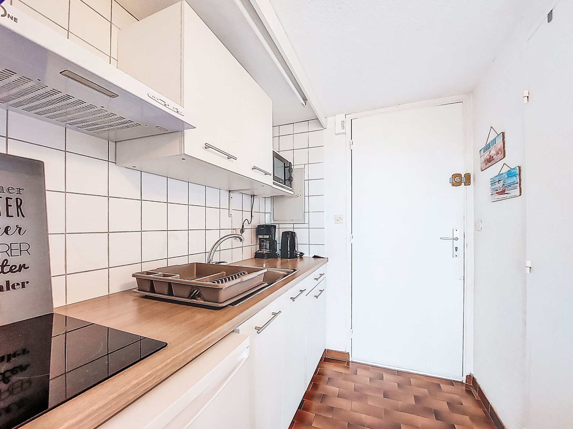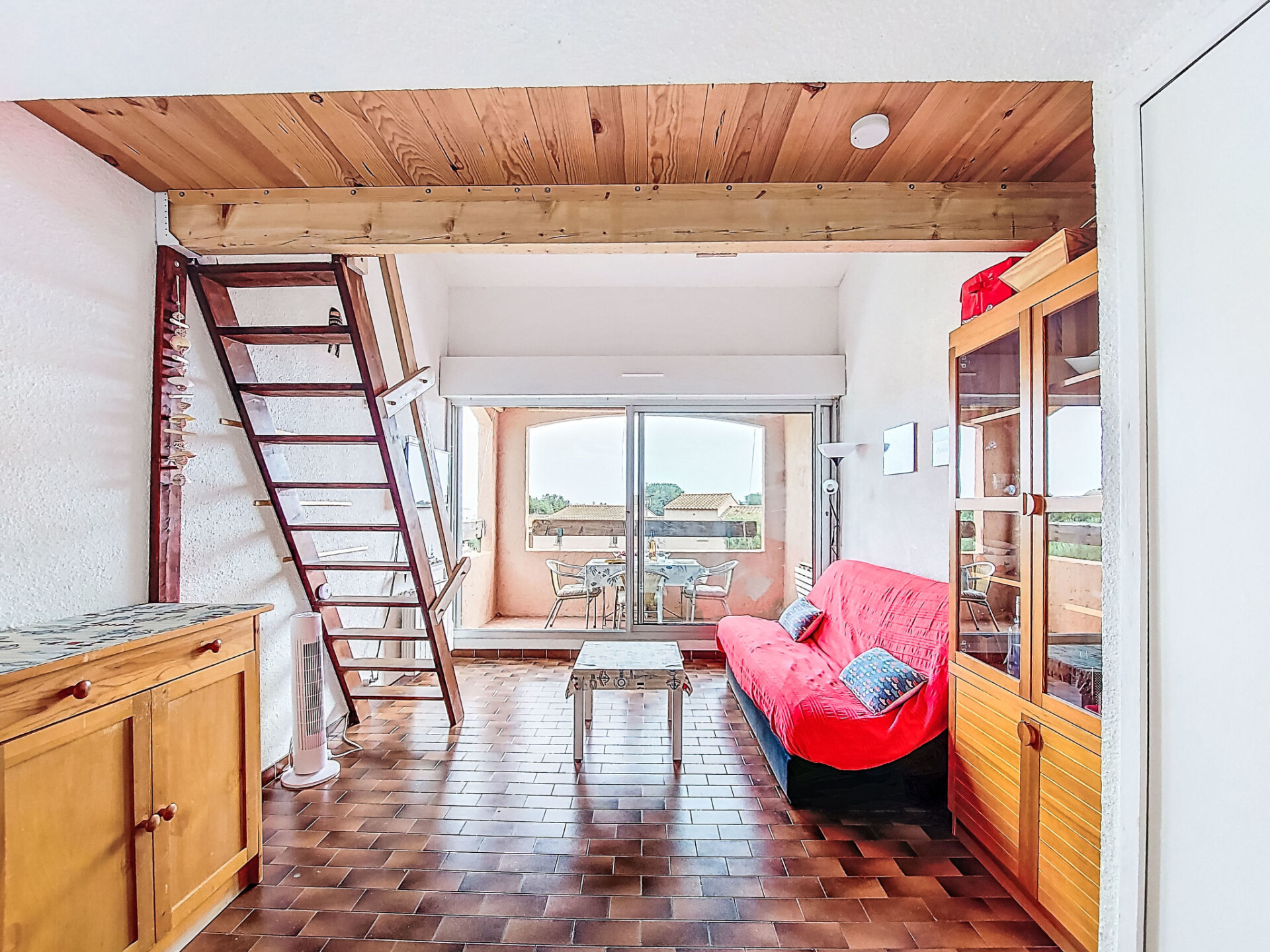 Studio 1-kamer 28 m2 op 2 verdiepingen op de 1e verdieping. Eenvoudig en doelmatig ingericht: woon-/eetkamer met 1 2-pers divanbed (130 cm, lengte 190 cm), TV en ventilator. Uitgang naar het terras. Kookhoek in de hal (2 keramische glas kookplaten, waterkoker, magnetron, elektrische koffiemachine). Bad/WC. Elektrische verwarming. Bovenverdieping: (steile trap) open galerij met afgeschuinde daken, hoogte van het plafond 65 - 140 cm met 1 2-pers bed (140 cm, lengte 190 cm), ventilator. Terras 6 m2, overdekt, op het zuidoosten gelegen. Terrasmeubelen. Uitzicht op zee. Ter beschikking: Internet (WiFi, extra). Parkeerplaats nr. 63. TV alleen FR. Rookmelders. 83009 000020 RR