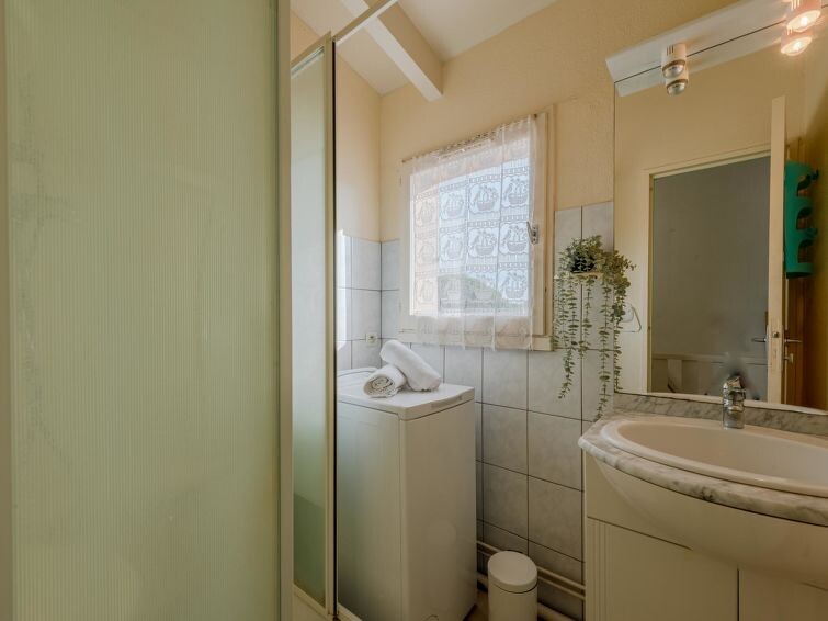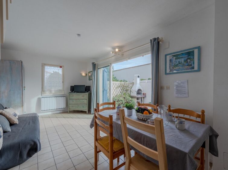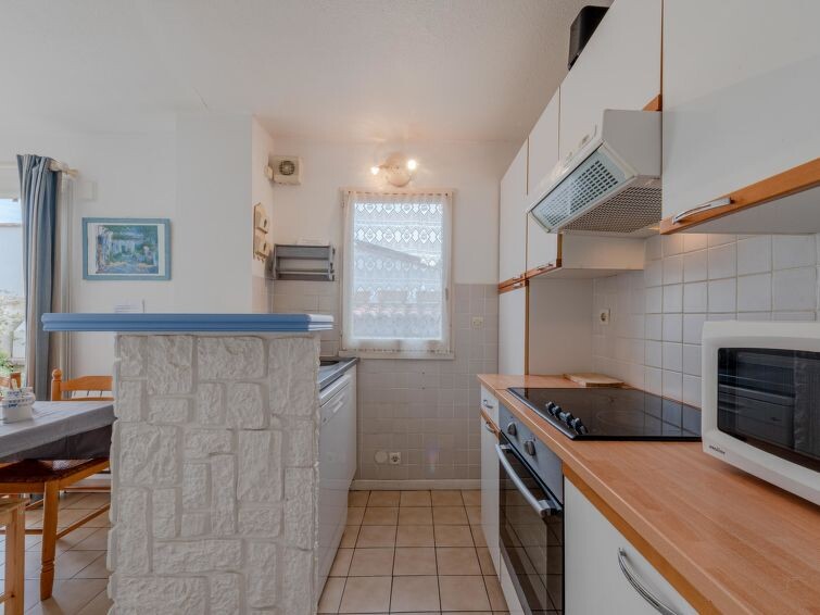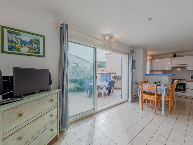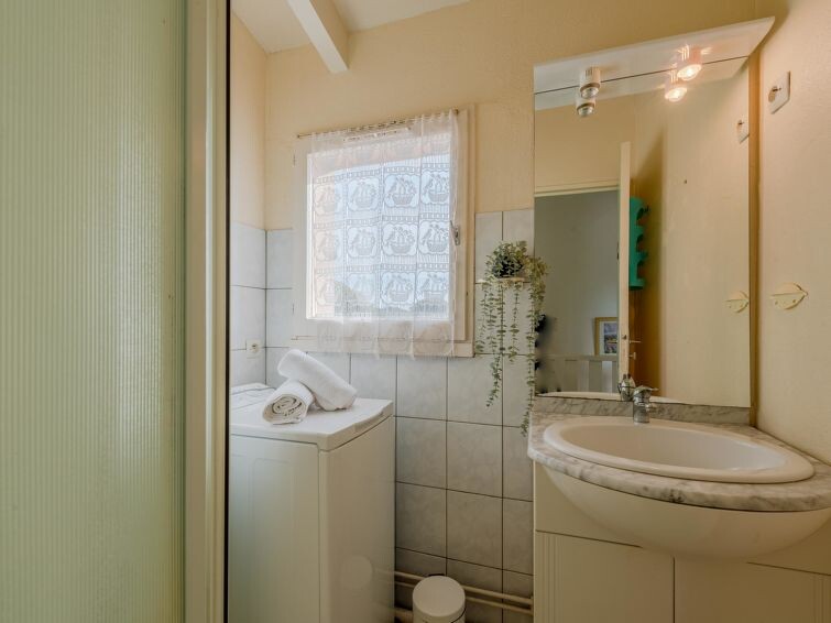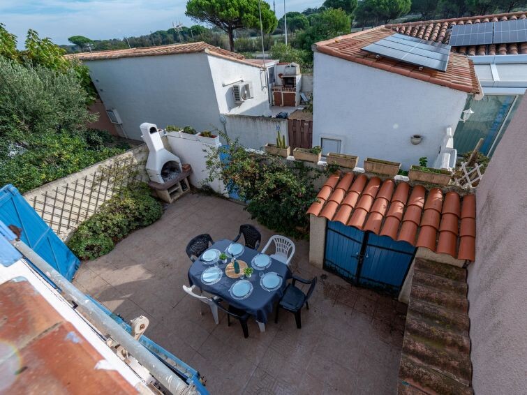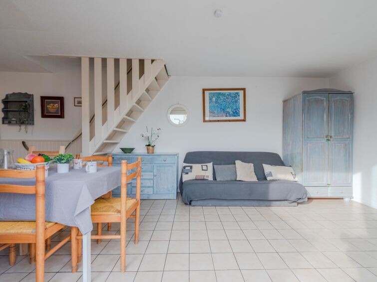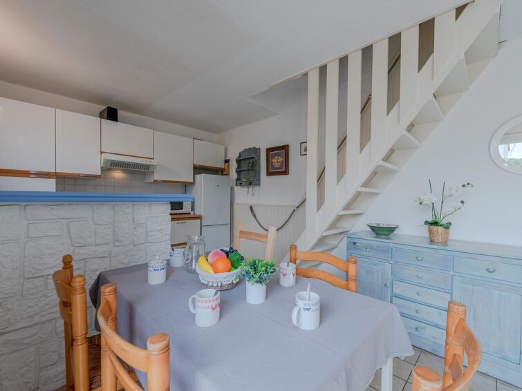 Huis in een rij 3-kamers 50 m2 op 2 verdiepingen. Woon-/eetkamer met 1 divanbed, TV en DVD. Uitgang naar het terras. Kookhoek (4-pits kookplaat, oven, afwasmachine, magnetron). Verwarming. Bovenverdieping: 1 kamer met 1 2-pers bed (1 x 140 cm). 1 kamer met 1 x 2 stapelbedden (80 cm). Douche, aparte WC. Terras 25 m2, op het oosten gelegen. Terrasmeubelen, barbecue. Ter beschikking: wasmachine. Internet (Internet (WiFi), extra). Parkeerplaats. Maximaal 1 huisdier/hond toegestaan. Rookmelders.