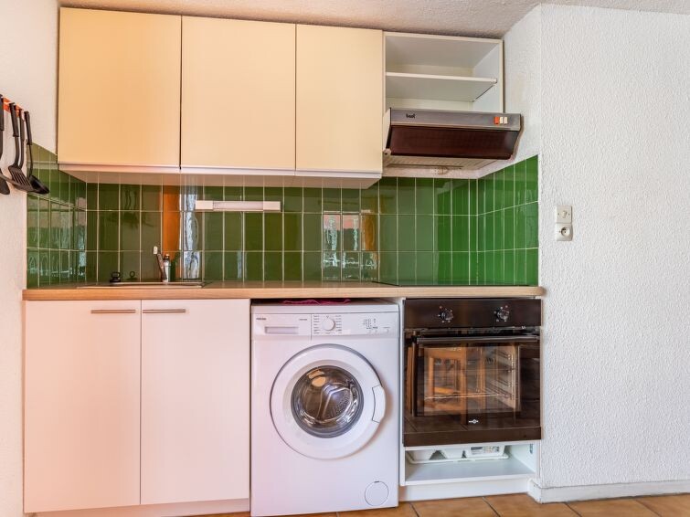 Huis in een rij 2-kamers 35 m2 op 2 verdiepingen. Woon-/eetkamer met TV (Flatscreen TV). 1 kamer met 1 2-pers bed (1 x 140 cm). Kookhoek (oven, 4 keramische glas kookplaten, magnetron, elektrische koffiemachine). Bad/WC. Geen verwarmingsmogelijkheid. Bovenverdieping: (steile trap) galerij met afgeschuinde daken, hoogte van het plafond 100 - 180 cm met 2 bedden (90 cm, lengte 190 cm), TV (Flatscreen TV). Terras 20 m2, op het westen gelegen. Terrasmeubelen, barbecue. Ter beschikking: wasmachine. Internet (Internet (WiFi), extra). Parkeerplaats. Maximaal 1 huisdier/hond toegestaan. Rookmelders. In plaats van een afgesloten slaapkamer bevinden sommige slaapgedeeltes zich in een open ruimte (galerij, nis, etc.).