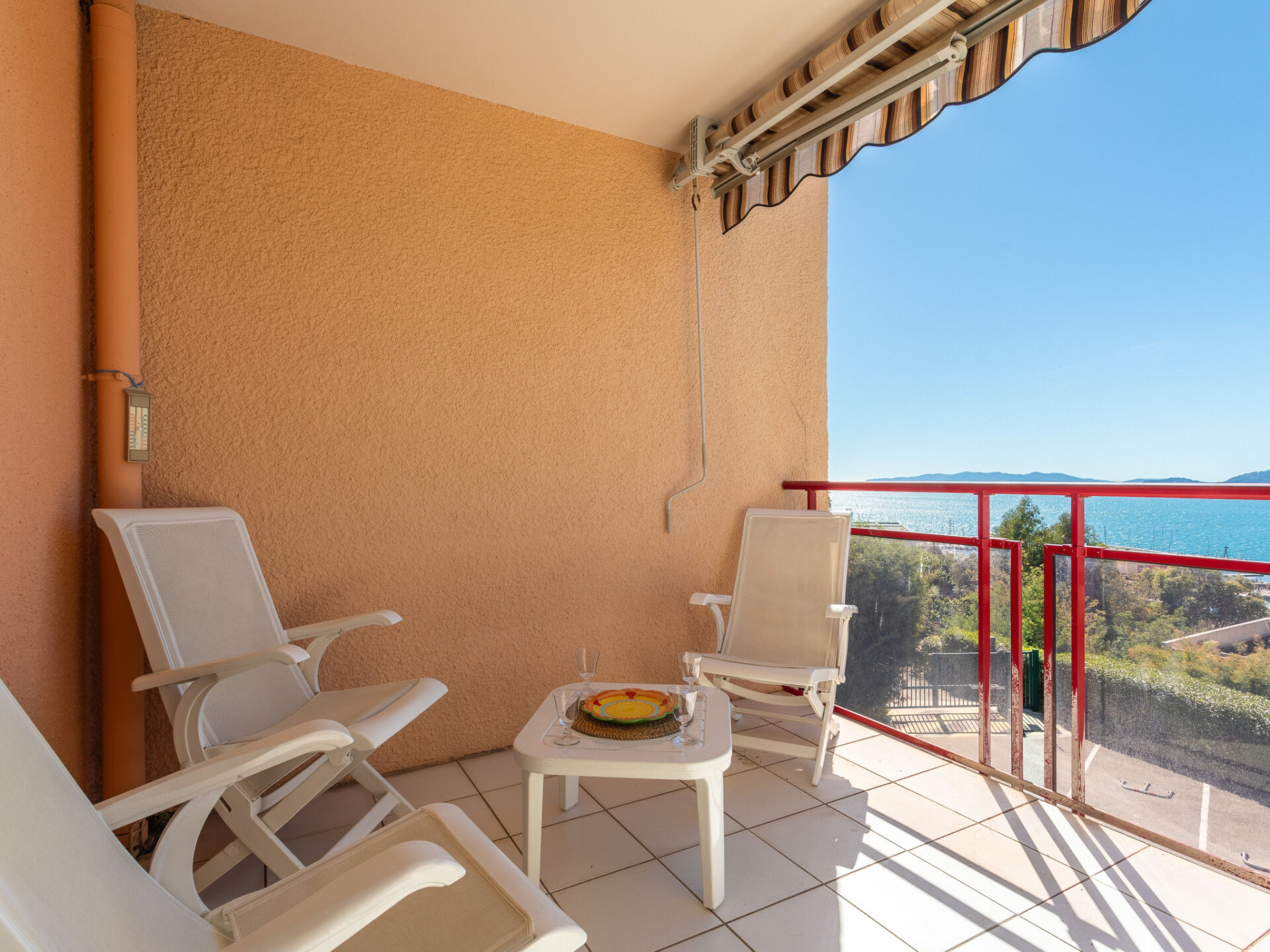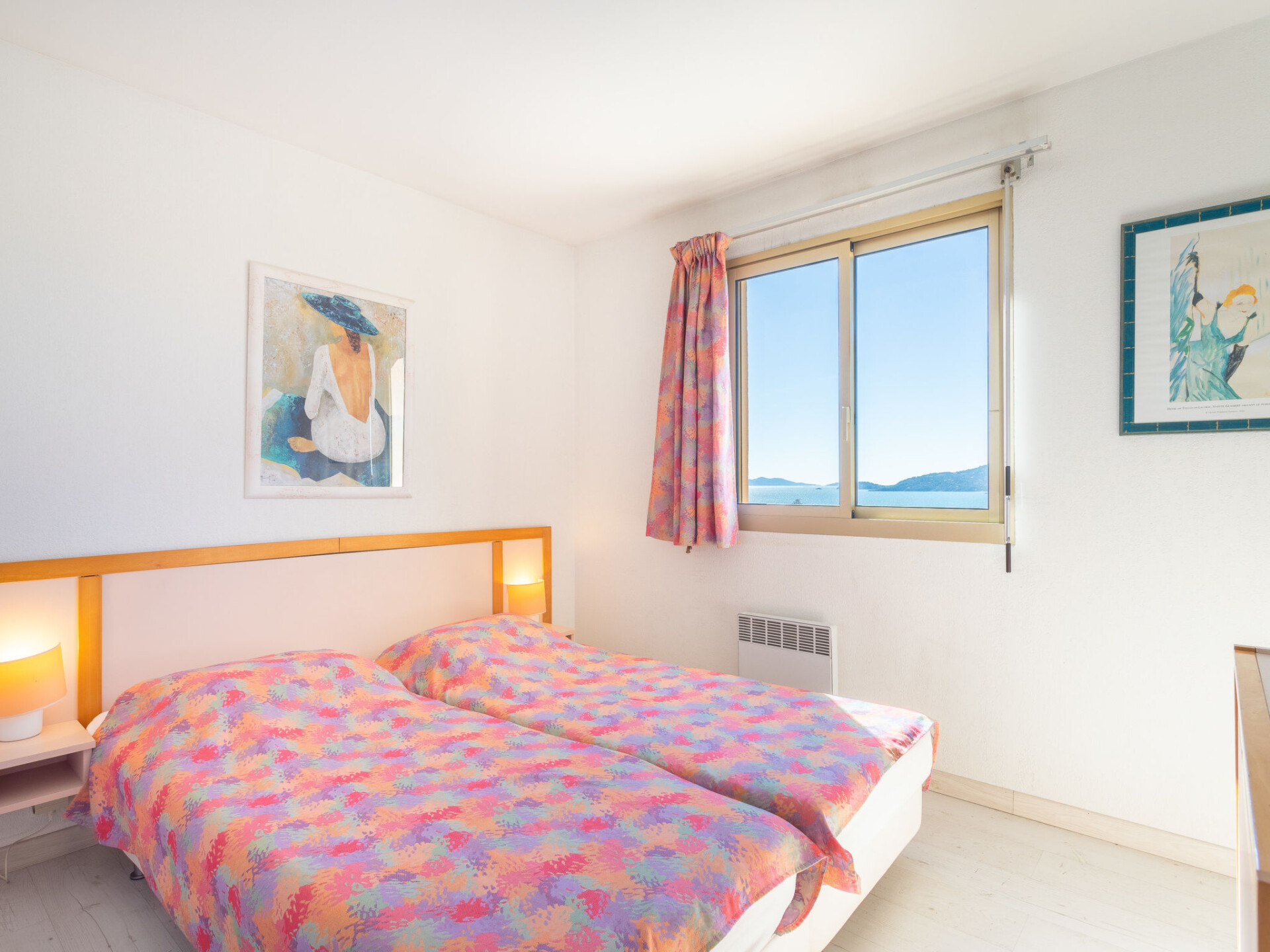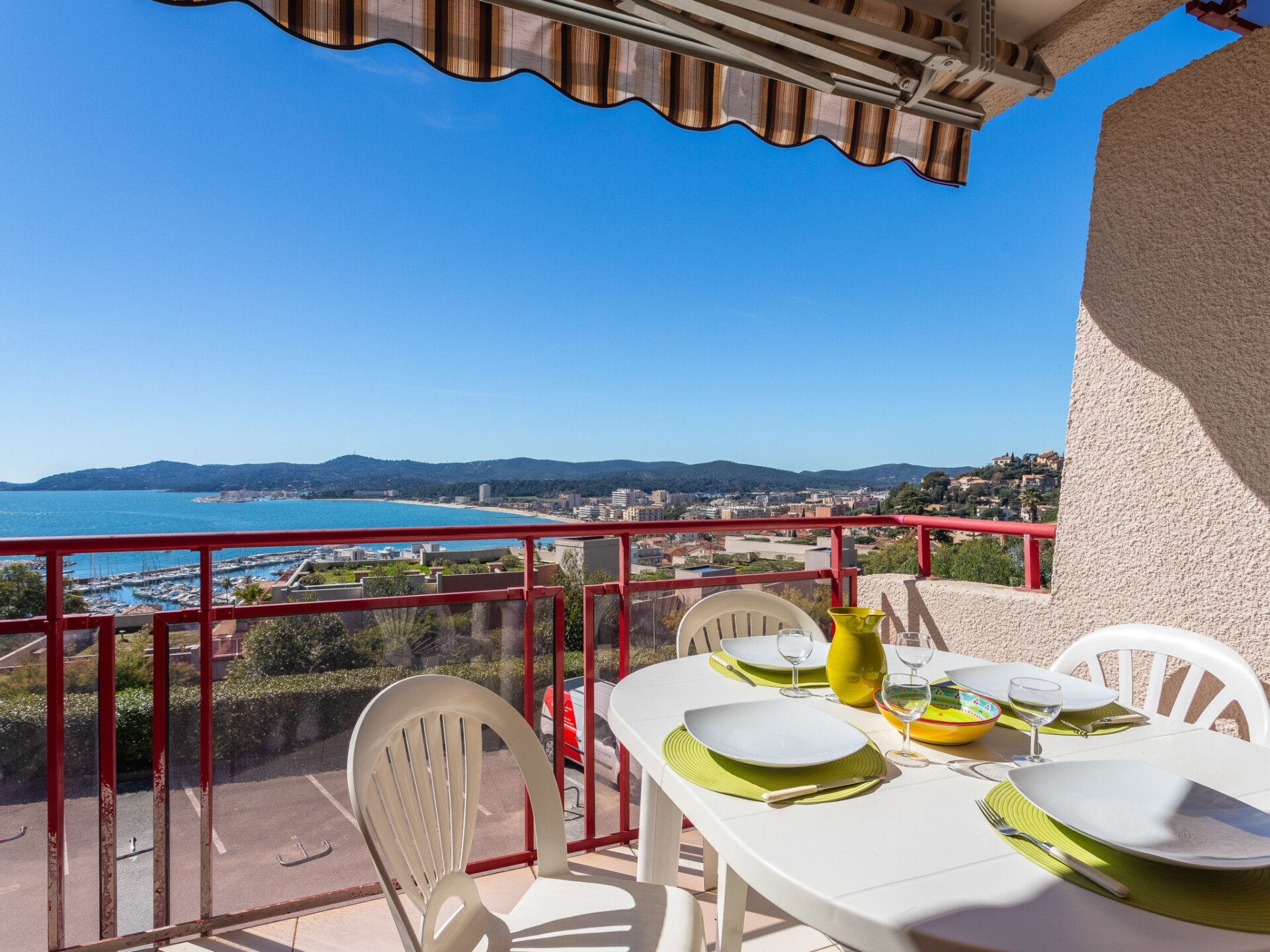 Appartement 3-kamers 60 m2 op de 2e verdieping. Doelmatig en mooi ingericht: woon-/eetkamer met eettafel en TV (Flatscreen TV). Uitgang naar het terras. 1 kamer met 1 2-pers bed (160 cm, lengte 200 cm). 1 kamer met 2 bedden (90 cm, lengte 190 cm). Keuken (oven, afwasmachine, 3 inductiekookplaten, broodrooster, waterkoker, magnetron, diepvriezer, elektrische koffiemachine). Badkamer, aparte WC. Elektrische verwarming. Balkon 10 m2, op het zuiden gelegen. Balkonmeubilair. Zeer mooi uitzicht op zee en de baai. Ter beschikking: wasmachine, strijkijzer, haardroger. Internet (WiFi, extra). Parkeerplaats nr. 11. Maximaal 1 huisdier/hond toegestaan. TV alleen FR. Rookmelders. Aanbod door een particulier volgens art. 155, IV van CGI. 83070 000043 AP