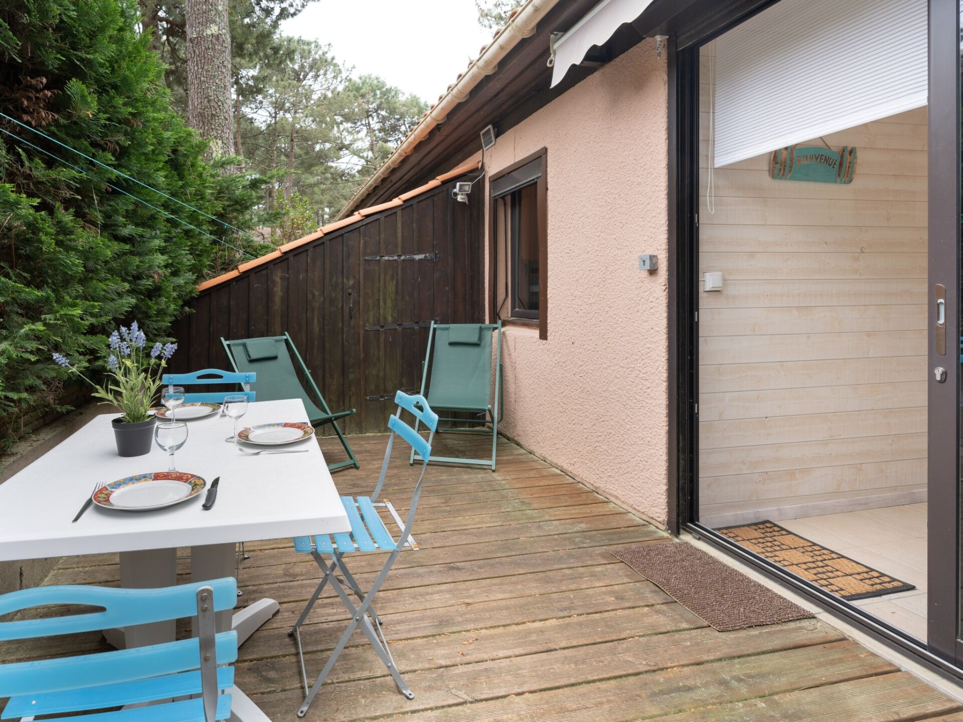 Residentie "Les Pins". In de wijk Domaine de l'Aubarède, aan de rand van de plaats, 1.7 km van het centrum van de Lacanau Océan, 2 km van zee, 6 km van het meer, in het bos. Voor medegebruik: kinderspeelplaats, parkeerplaats. Winkel 1.7 km, restaurant 1.7 km, centrum te voet bereikbaar in 12 minuten, bushalte "Marie Curie" 1.2 km. Golfterrein (18 holes) 2 km, tennis 1.5 km, manege 3 km, fietspad 100 m, kinderspeelplaats 20 m. Attracties in de buurt: Bordeaux 60 km, Dune du Pyla 70 km, Saint Emilion 70 km.