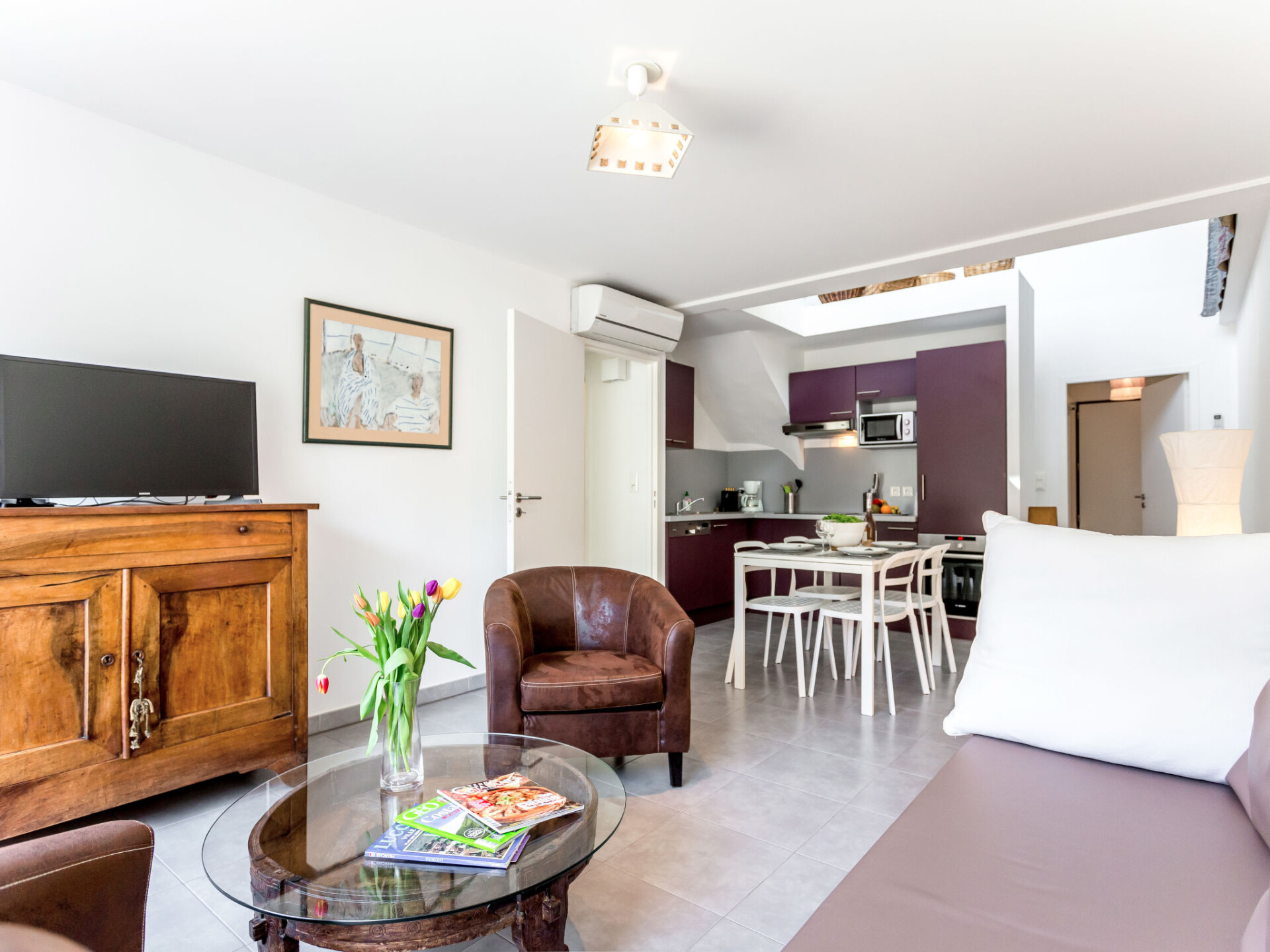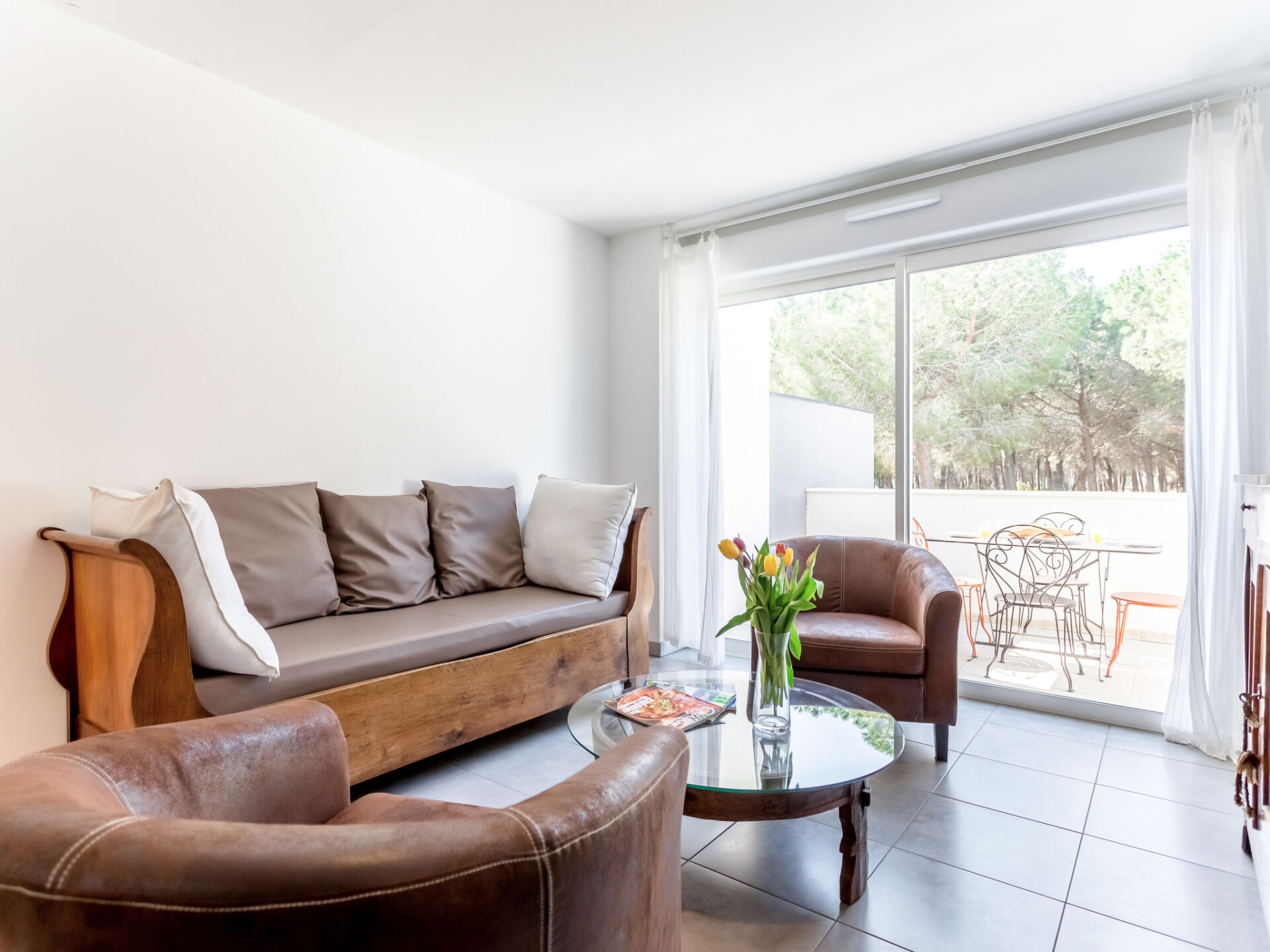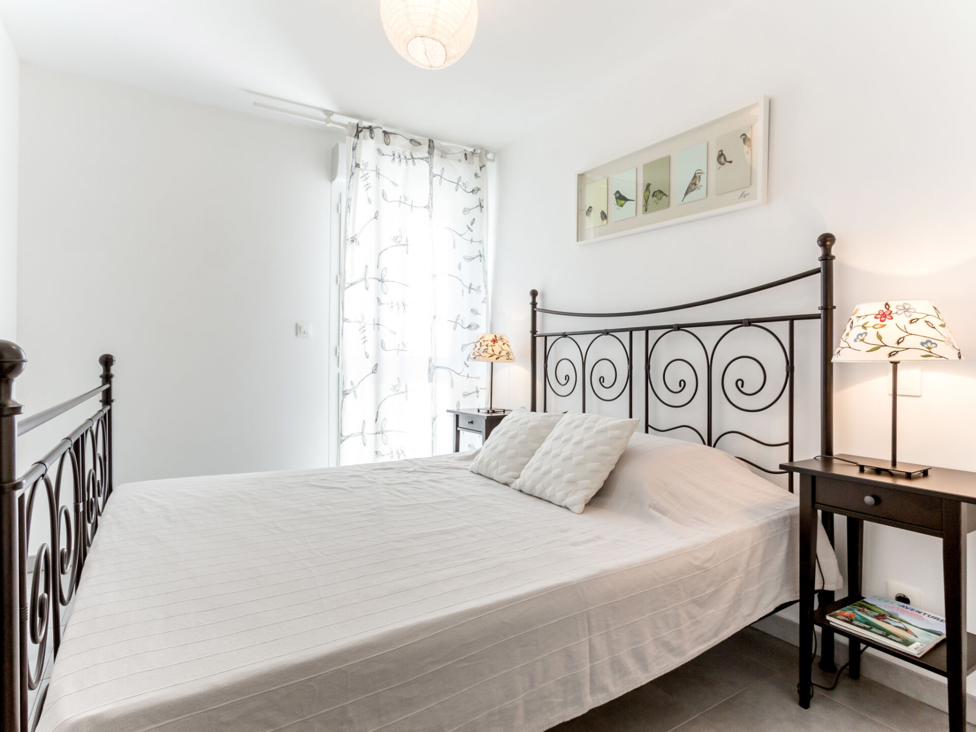 "Les Pins Parasols", appartement 3-kamers 60 m2 op 2 verdiepingen op de 1e verdieping. Licht, modern ingericht: Bovenverdieping: (buitentrap) woon-/eetkamer met eettafel en Sat-TV. Uitgang naar het balkon. 1 kamer met 1 2-pers bed (160 cm). 1 kamer met 2 bedden (90 cm). Open keuken (oven, afwasmachine, 4 keramische glas kookplaten, broodrooster, waterkoker, magnetron, elektrische koffiemachine). Douche, aparte WC. Elektrische verwarming, air-conditioning. Balkon, terras 29 m2. Balkonmeubilair, ligstoelen (2). Ter beschikking: wasmachine, kinderstoel, kinderbed. Internet (Internet (WiFi), gratis). Parkeerplaats, garage op het terrein. Niet rokers woning.