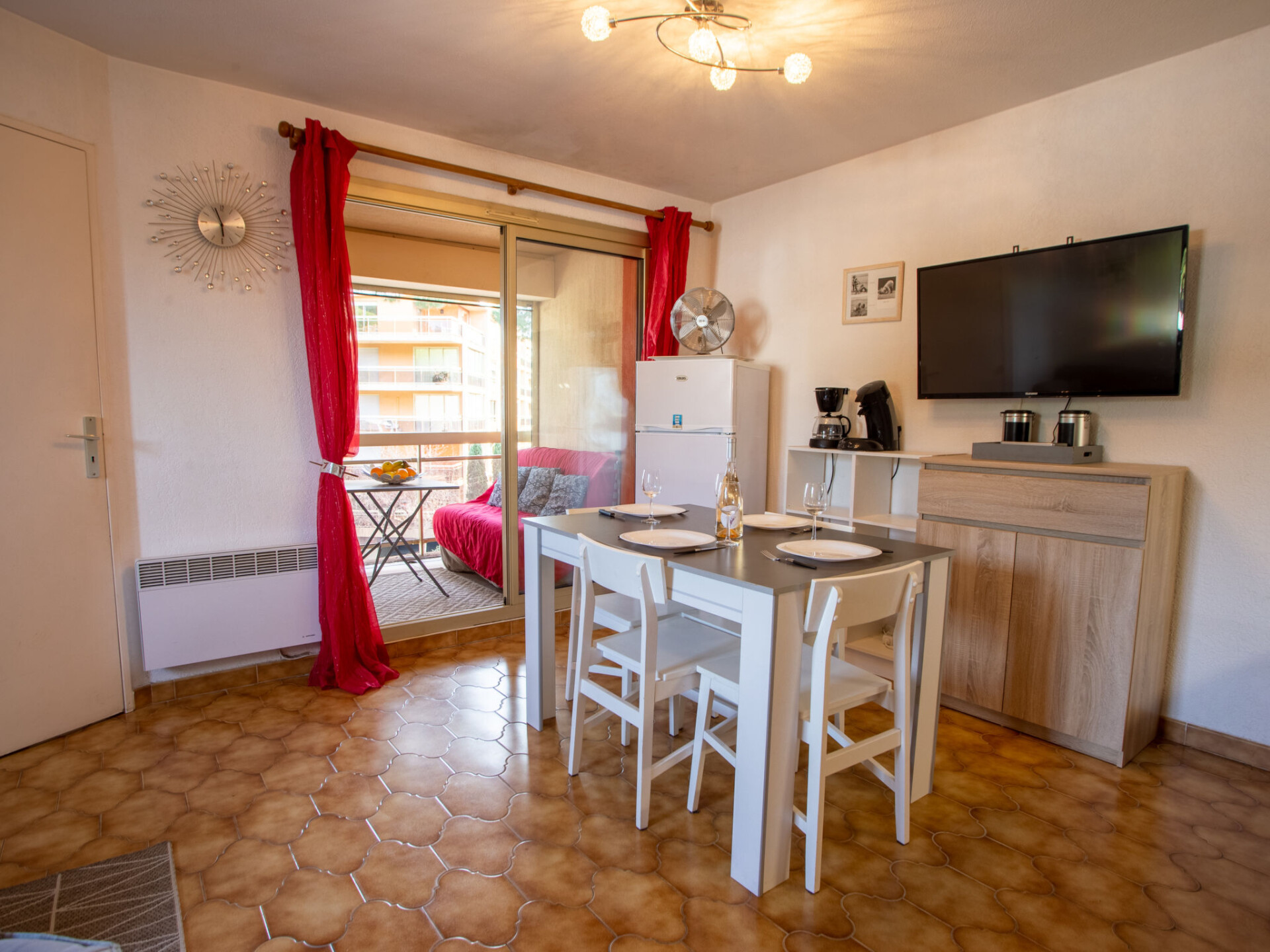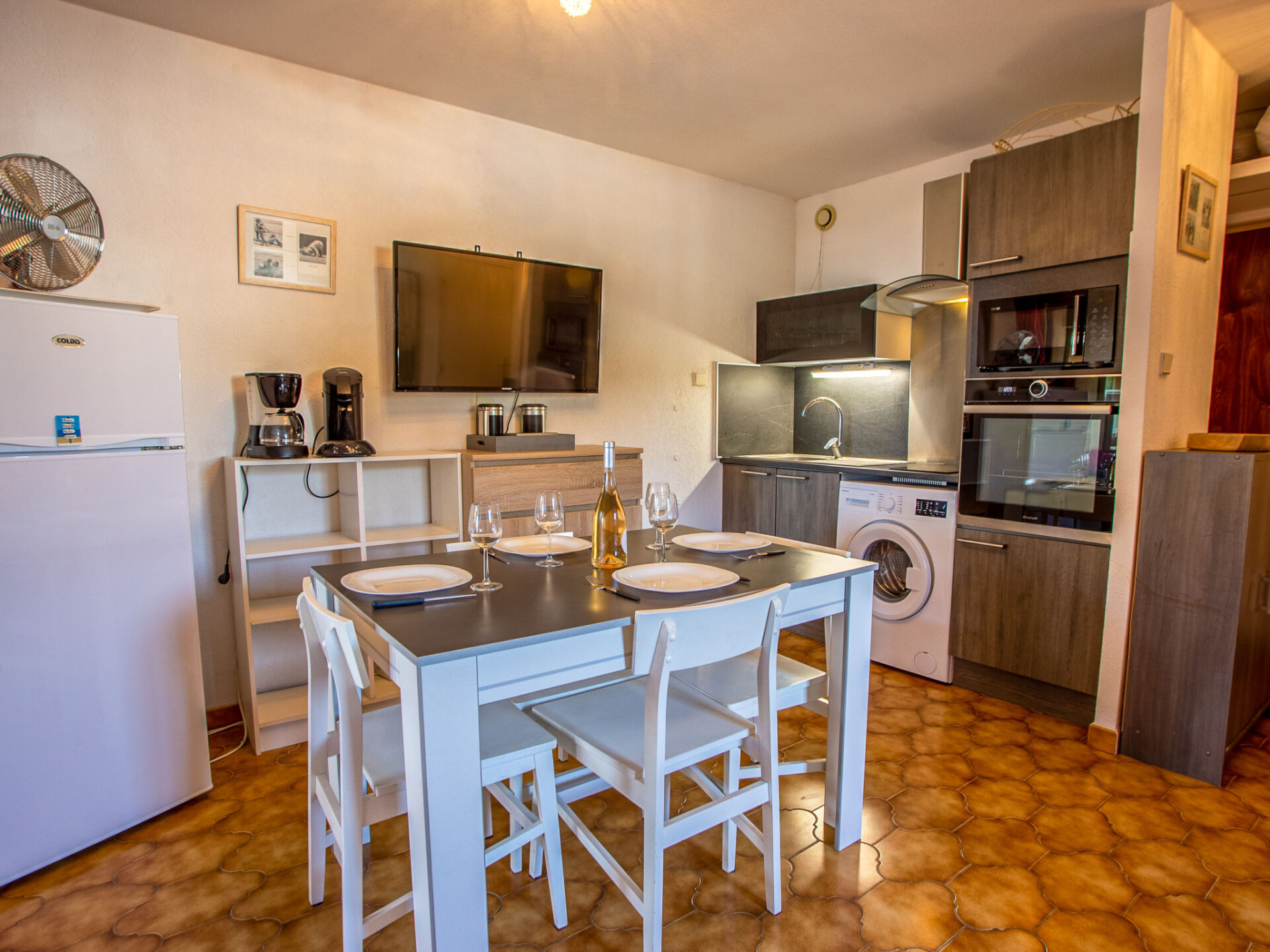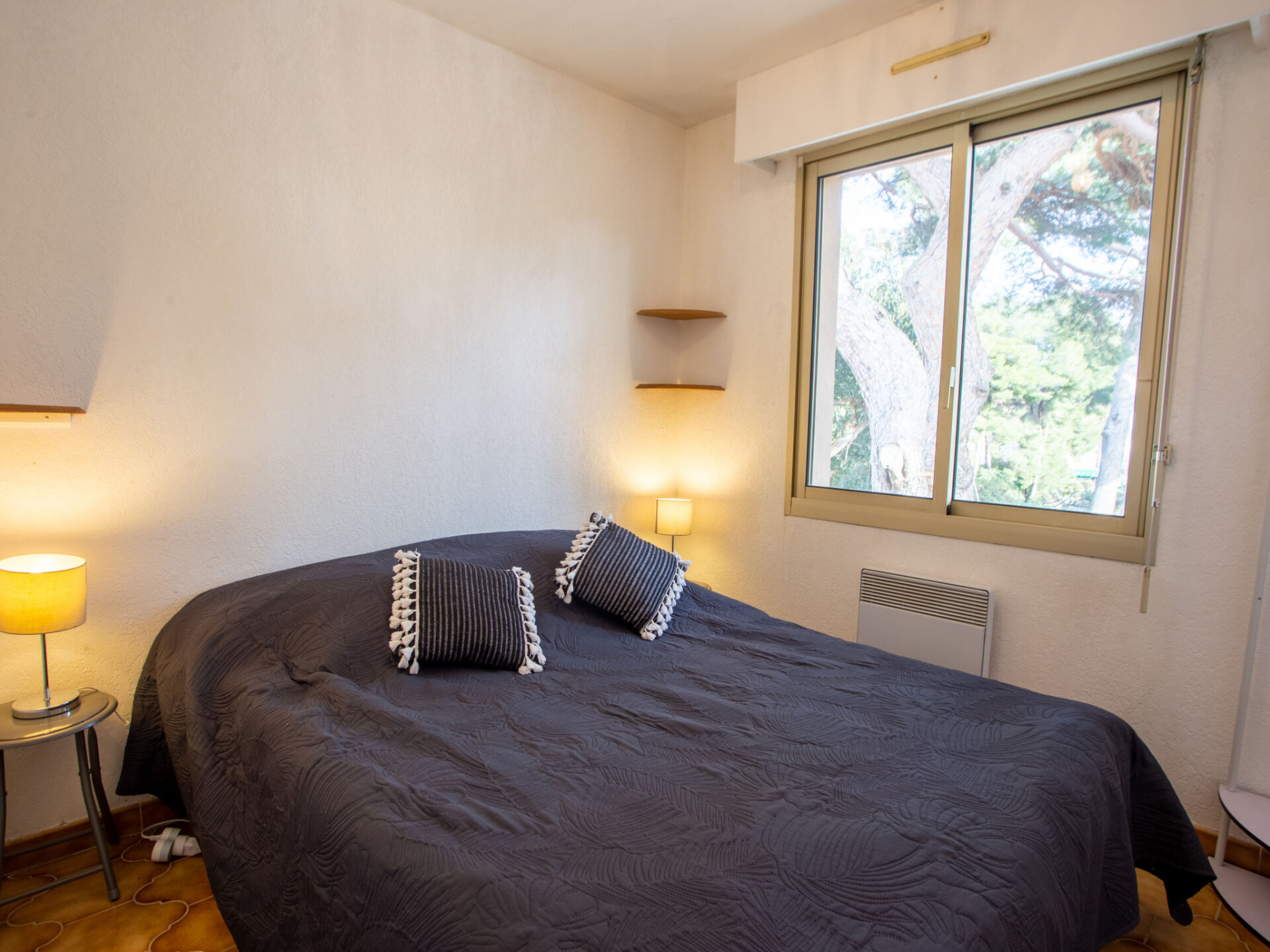 Appartement 2-kamers 33 m2 op de 2e verdieping. Comfortabel en mooi ingericht: woon-/eetkamer met 1 divanbed (160 cm, lengte 190 cm), TV (Flatscreen TV). Uitgang naar het balkon. 1 kamer met 1 2-pers bed (140 cm, lengte 190 cm), ventilator. Open keuken (oven, 2 inductiekookplaten, broodrooster, magnetron, elektrische koffiemachine). Douche, aparte WC. Elektrische verwarming. Balkon 10 m2. Balkonmeubilair. Beperkt uitzicht op zee. Ter beschikking: wasmachine. Internet (Internet (WiFi), extra). Parkeerplaats nr. 50. TV alleen FR. Rookmelders.