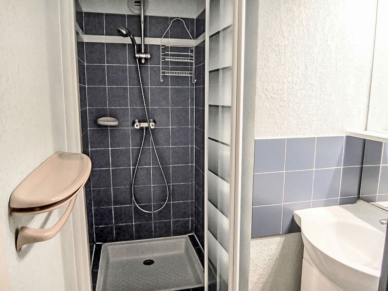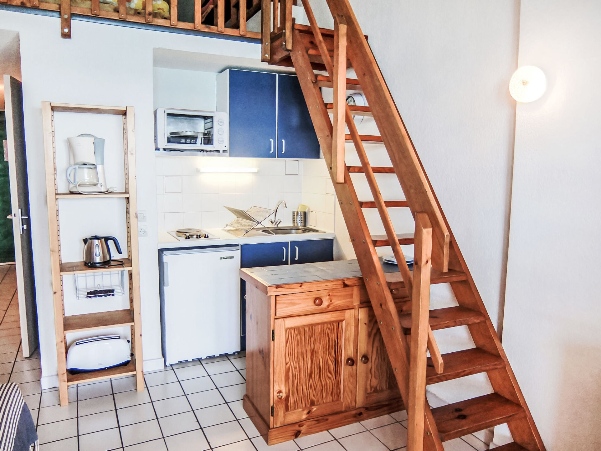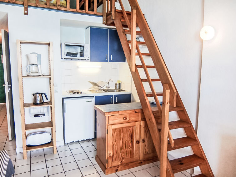 Appartement 2-kamers 25 m2 op 2 verdiepingen op de 2e verdieping. Woon-/eetkamer met TV (Flatscreen TV). Uitgang naar het balkon. 1 kleine kamer met 1 2-pers divanbed (140 cm, lengte 190 cm). Kookhoek (2-pits kookplaat, mini-oven, broodrooster, waterkoker, elektrische koffiemachine). Douche, aparte WC. Bovenverdieping: (steile trap) galerij met 2 bedden. Balkon 6 m2, op het oosten gelegen. Mooi uitzicht op zee. Rookmelders. In plaats van een afgesloten slaapkamer bevinden sommige slaapgedeeltes zich in een open ruimte (galerij, nis, etc.). 660530235137