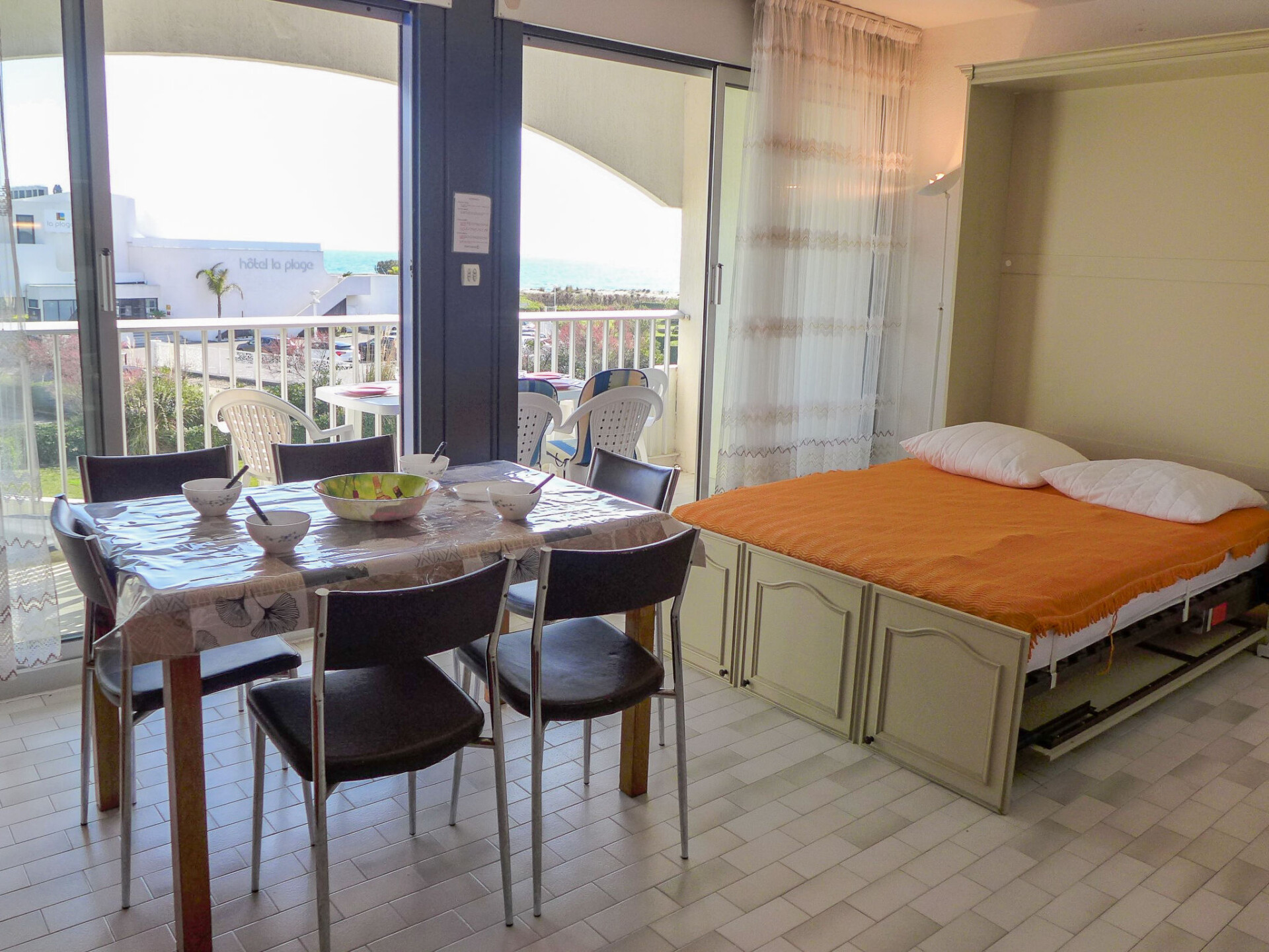 Residentie "Les Terrasses de la Mer", van 4 verdiepingen. In de wijk Point Zéro, 2 km van het centrum, 50 m van zee, 30 m van het strand, directe toegang tot het strand. In het complex: lift. Openbare parkeerplaatsen 50 m in de straat extra. Winkel 1 km, restaurant 500 m, bushalte "Ponant" 100 m, zandstrand 20 m, openluchtzwembad 700 m, overdekt zwembad 1 km, thermaalbad "Thalasso Spa" 1.2 km. Jachthaven 2.5 km, golfterrein (18 holes) 1.5 km, zeilschool 2.5 km, tennis 1 km, manege 3.9 km. Attracties in de buurt: Le Seaquarium du Grau Du Roi 10 km, Les Remparts d'Aigues Mortes 12 km, Les Saintes Maries de la Mer 40 km. Vliegveld in de buurt 20 km van het huis. Vergelijkbare accommodaties kunnen worden geboekt.