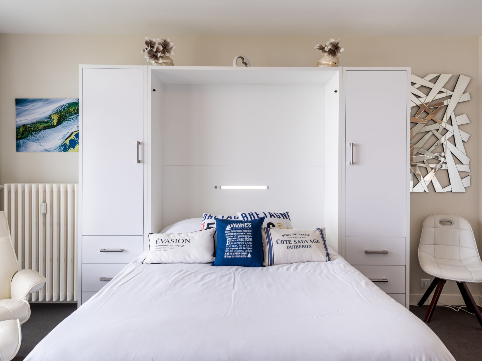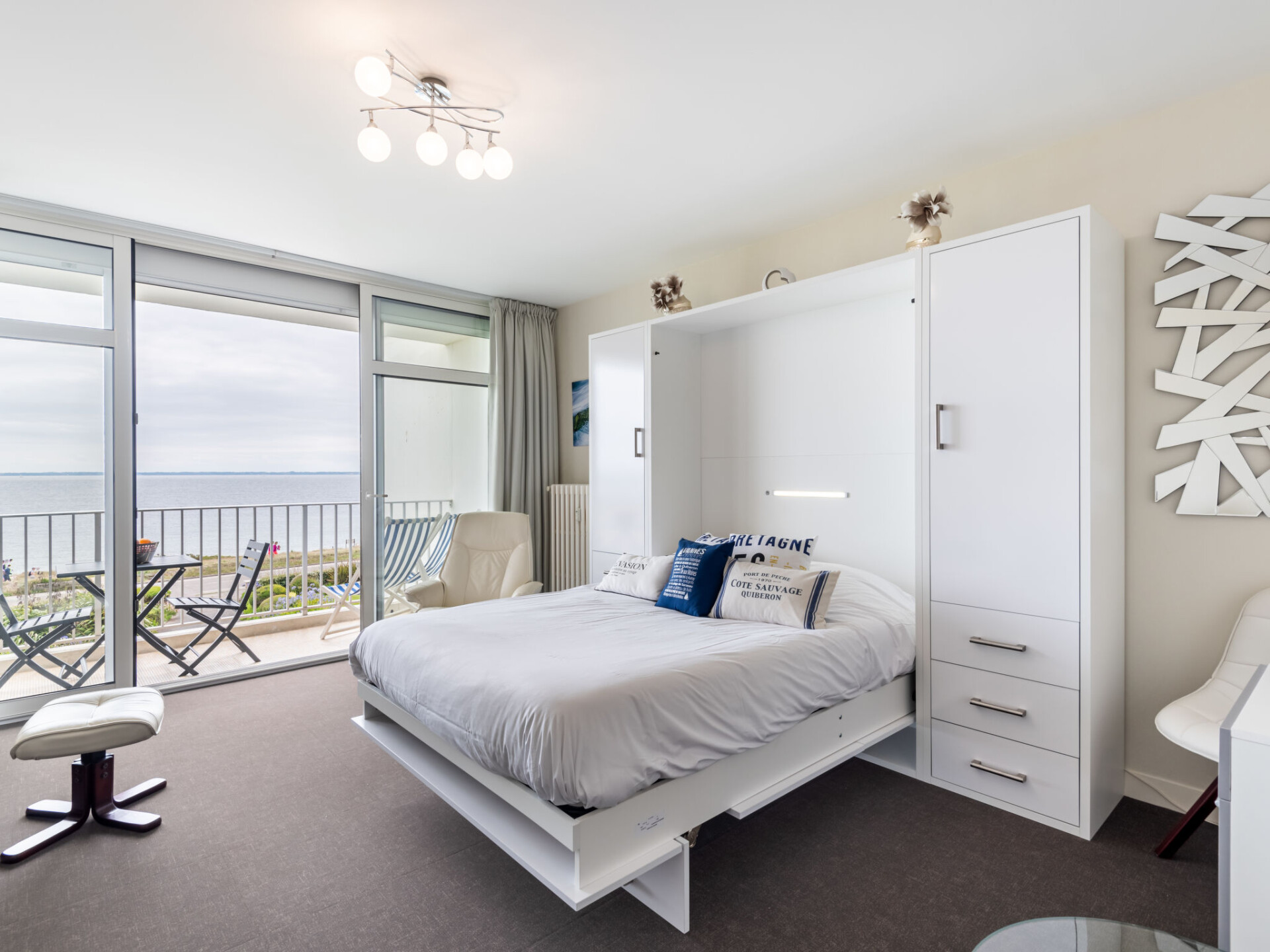 Quiberon: Kleine residentie "Les Trois Iles", van 2 verdiepingen. In de plaats, 2 km van het centrum van Quiberon, rustige ligging, 20 m van zee, 30 m van het strand. Parkeerplaats. Winkel 1.5 km, levensmiddelenwinkel 2 km, supermarkt 2.4 km, restaurant 2 km, bushalte 200 m, treinstation "Quiberon" 2.5 km, veerboot "Port Maria" 2.5 km, zandstrand "Plage du Conguel" 600 m, thermaalbad "Thalassothérapie de Quiberon" 200 m. Jachthaven 3 km, golfterrein (9 holes) 500 m, zeilschool 3 km. Attracties in de buurt: Presqu'ile de Quiberon et côte sauvage 3 km, Gare maritime les iles Houat, Hoedic. 3 km, Les alignements de Carnac 26 km, Auray et le port de St Goustan 33 km, Vannes 48 km, Lorient 63 km. De sleuteloverdracht vindt plaats bij het agentschap Interhome in Quiberon, 2 km.
