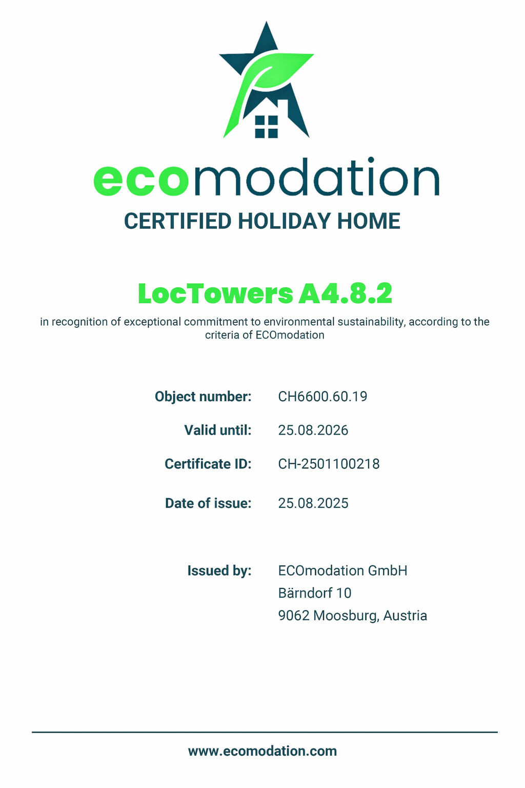 "LocTowers A4.8.2", appartement 4-kamers 101 m2 op de 8e verdieping. Ruim en licht, zeer comfortabel en modern ingericht: open woon-/eetkamer met eettafel, Kabel-TV en Digitale TV. Uitgang naar het balkon. 1 kamer met 1 2-pers bed (2 x 80 cm, lengte 200 cm), douche/WC. Uitgang naar het balkon. 1 kamer met 2 bedden (80 cm, lengte 200 cm). 1 kamer met 1 x 2 stapelbedden (80 cm, lengte 200 cm). Open keuken (oven, afwasmachine, 4 keramische glas kookplaten, broodrooster, waterkoker, diepvriezer, elektrische koffiemachine, pads voor de koffiemachine (Delizio) extra, raclette oven, fondue Set (kaas)). Bad/WC. Vloerverwarming. Parketvloeren. Balkon 10 m2, op het westen gelegen en op het zuiden gelegen balkon 3 m2, op het westen gelegen en op het noorden gelegen. Balkonmeubilair. Panoramazicht op de bergen en de plaats. Ter beschikking: wasmachine, droger, strijkijzer, kinderstoel, kinderbed (extra), haardroger. Internet (Internet (WiFi), gratis). Niet rokers woning. Maximaal 1 huisdier/hond toegestaan. NL-00007186