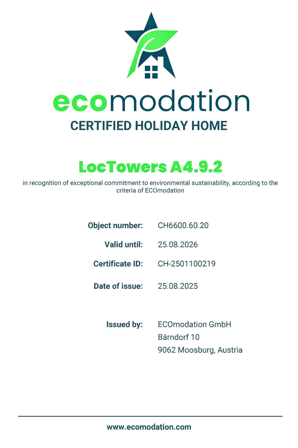 "LocTowers A4.9.2", appartement 4-kamers 101 m2 op de 9e verdieping. Ruim en licht, zeer comfortabel en modern ingericht: open woon-/eetkamer met eettafel, Kabel-TV en Digitale TV. Uitgang naar het balkon. 1 kamer met 1 2-pers bed (2 x 80 cm, lengte 200 cm), douche/WC. Uitgang naar het balkon. 1 kamer met 2 bedden (80 cm, lengte 200 cm). 1 kamer met 1 x 2 stapelbedden (80 cm, lengte 200 cm). Open keuken (oven, afwasmachine, 4 keramische glas kookplaten, broodrooster, waterkoker, diepvriezer, elektrische koffiemachine, pads voor de koffiemachine (Delizio) extra, raclette oven, fondue Set (kaas)). Bad/WC. Vloerverwarming. Parketvloeren. Balkon 10 m2, op het westen gelegen en op het zuiden gelegen balkon 3 m2, op het westen gelegen en op het noorden gelegen. Balkonmeubilair. Panoramazicht op de bergen en de plaats. Ter beschikking: wasmachine, droger, strijkijzer, kinderstoel, kinderbed (extra), haardroger. Internet (Internet (WiFi), gratis). Niet rokers woning. Maximaal 1 huisdier/hond toegestaan. Boekingen zijn alleen voor vakantiedoeleinden toegestaan. NL-00007187
