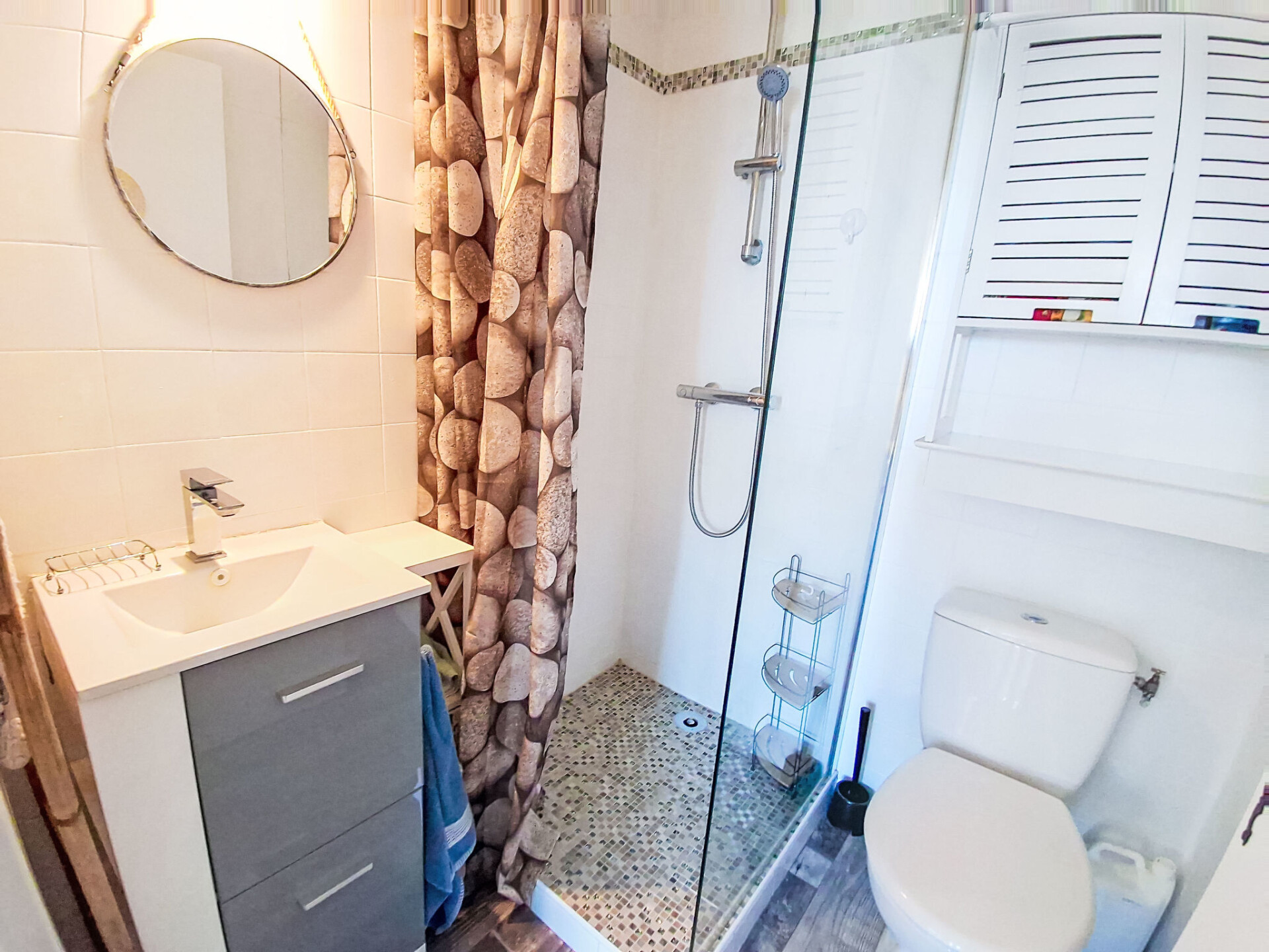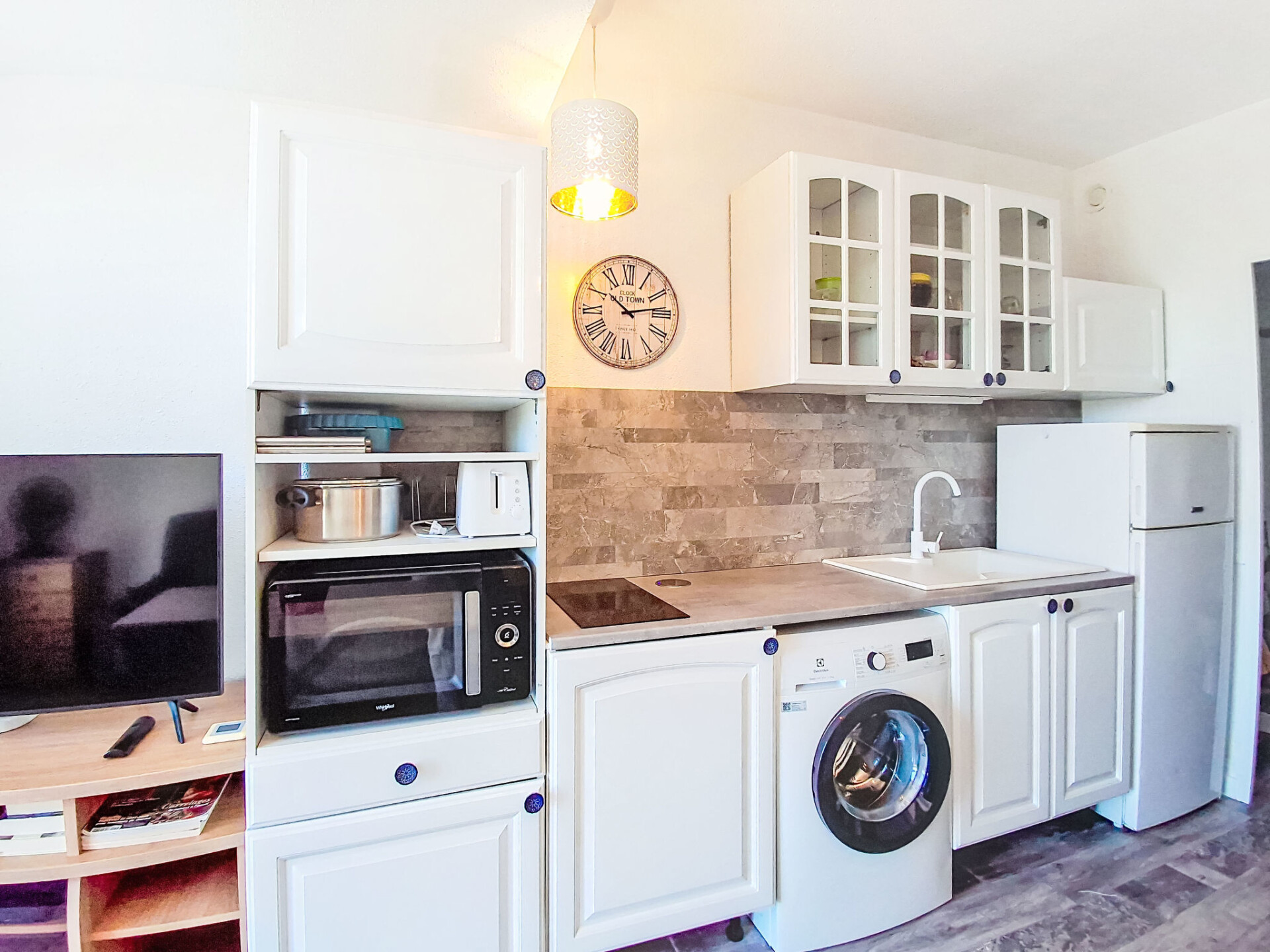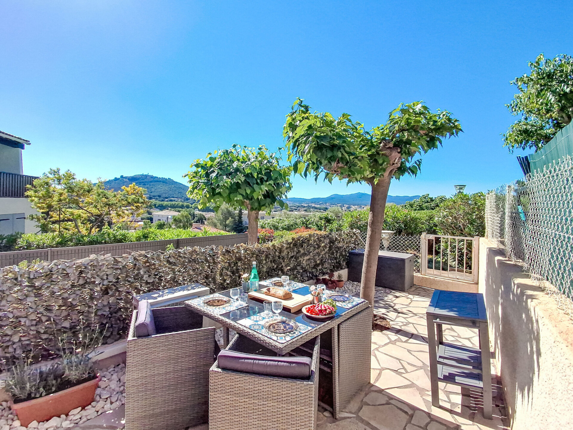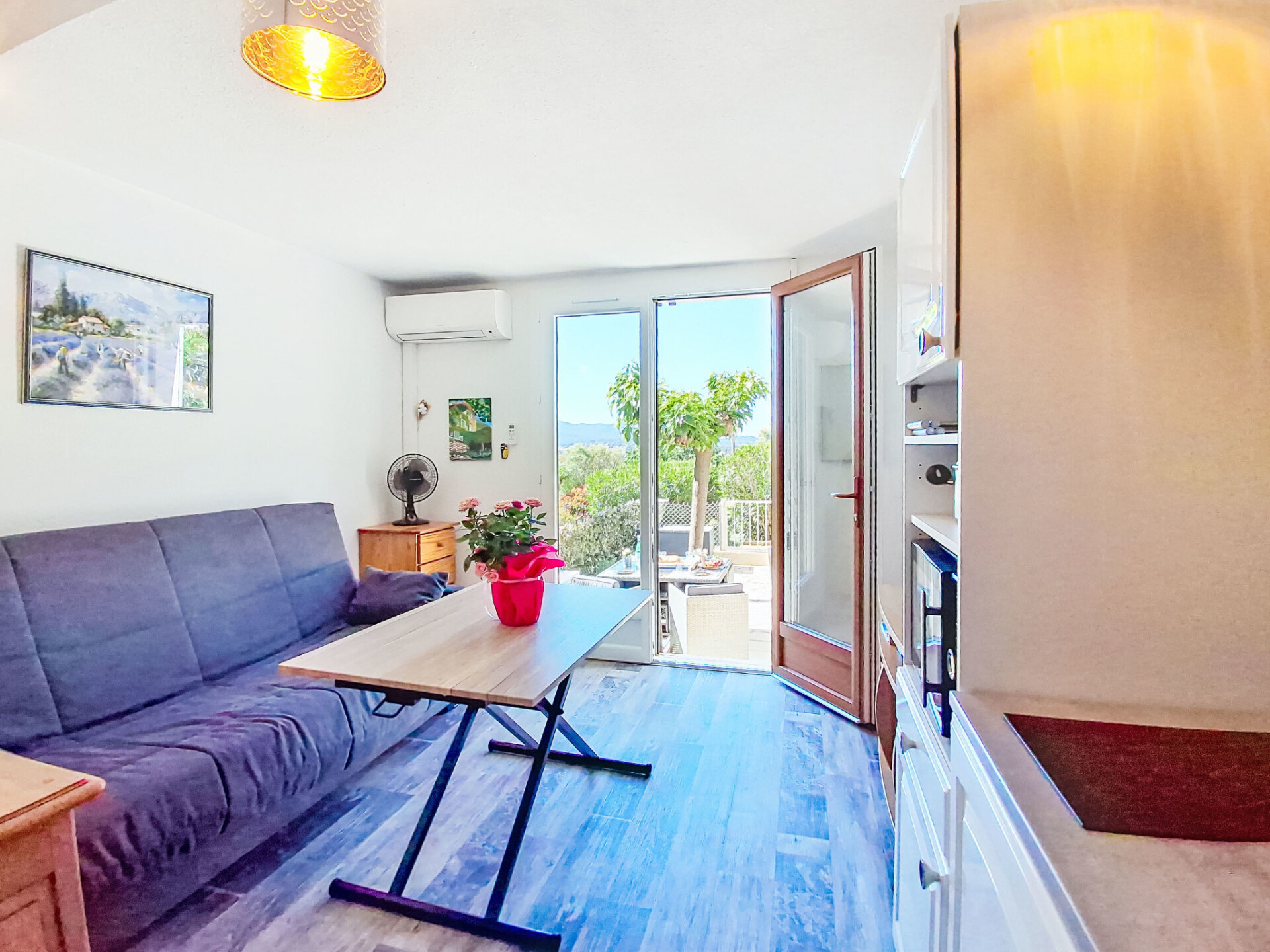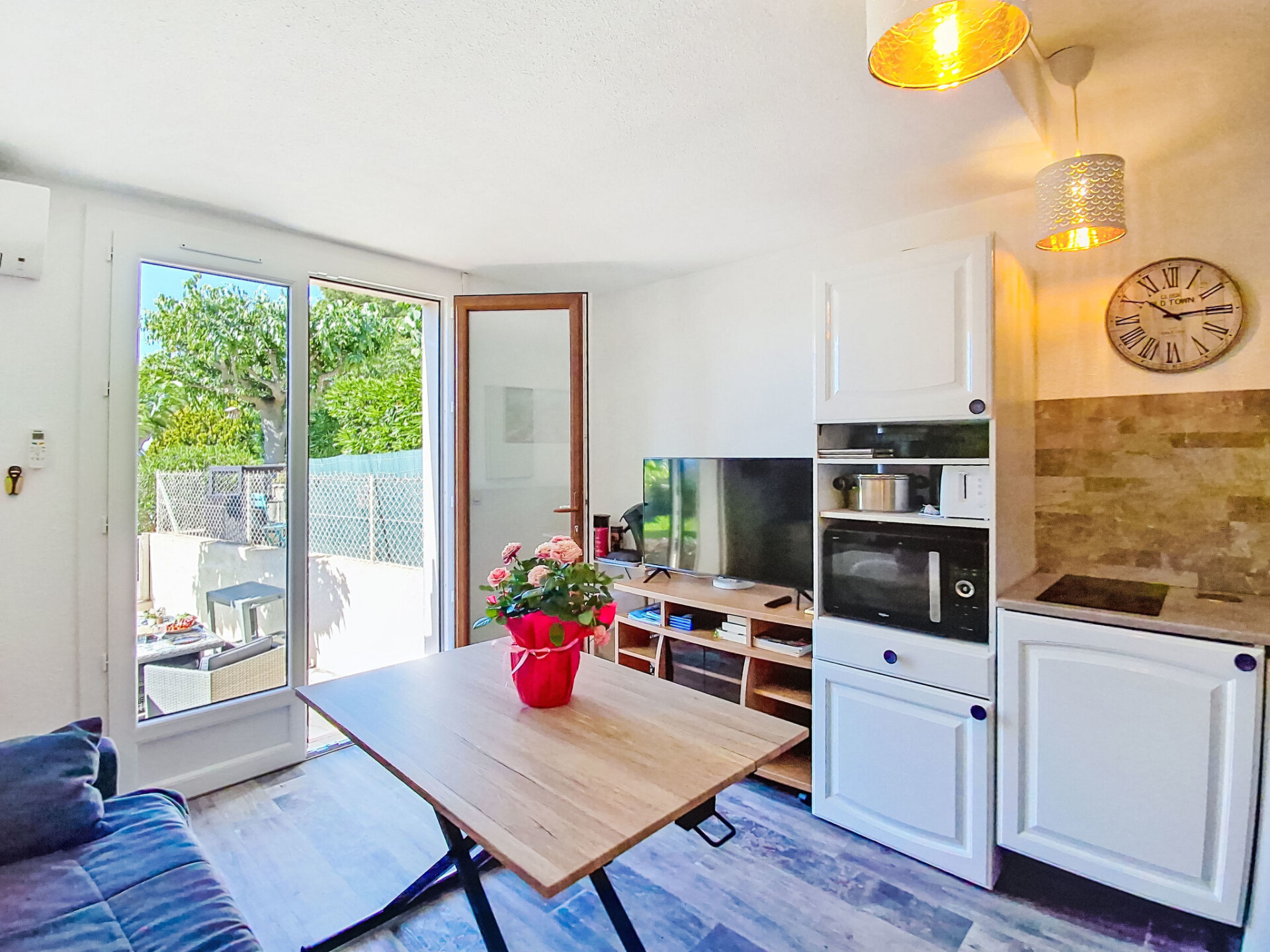 Studio 1-kamer 22 m2, op verhoogde begane grond. Mooi ingericht: woonkamer met TV (Flatscreen TV), air-conditioning. Uitgang naar het terras. Slaapnis 5 m2, zonder ramen met 1 2-pers divanbed (130 cm, lengte 190 cm). Kookhoek (mini-oven, 2 keramische glas kookplaten, broodrooster, diepvriezer, elektrische koffiemachine, combimagnetron). Douche/WC. Elektrische verwarming. Terras 15 m2, op het oosten gelegen en op het zuiden gelegen. Terrasmeubelen. Ter beschikking: wasmachine. Internet (WiFi, extra). Parkeerplaats. Niet rokers woning. Maximaal 1 huisdier/hond toegestaan. TV alleen FR. Rookmelders. Aanbod door een particulier volgens art. 155, IV van CGI.
