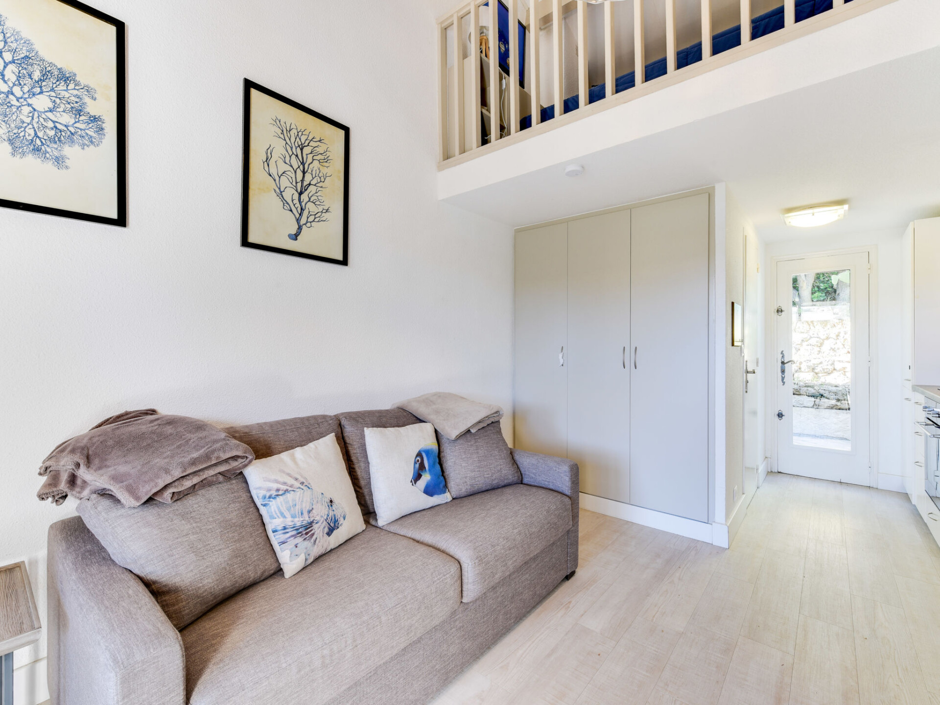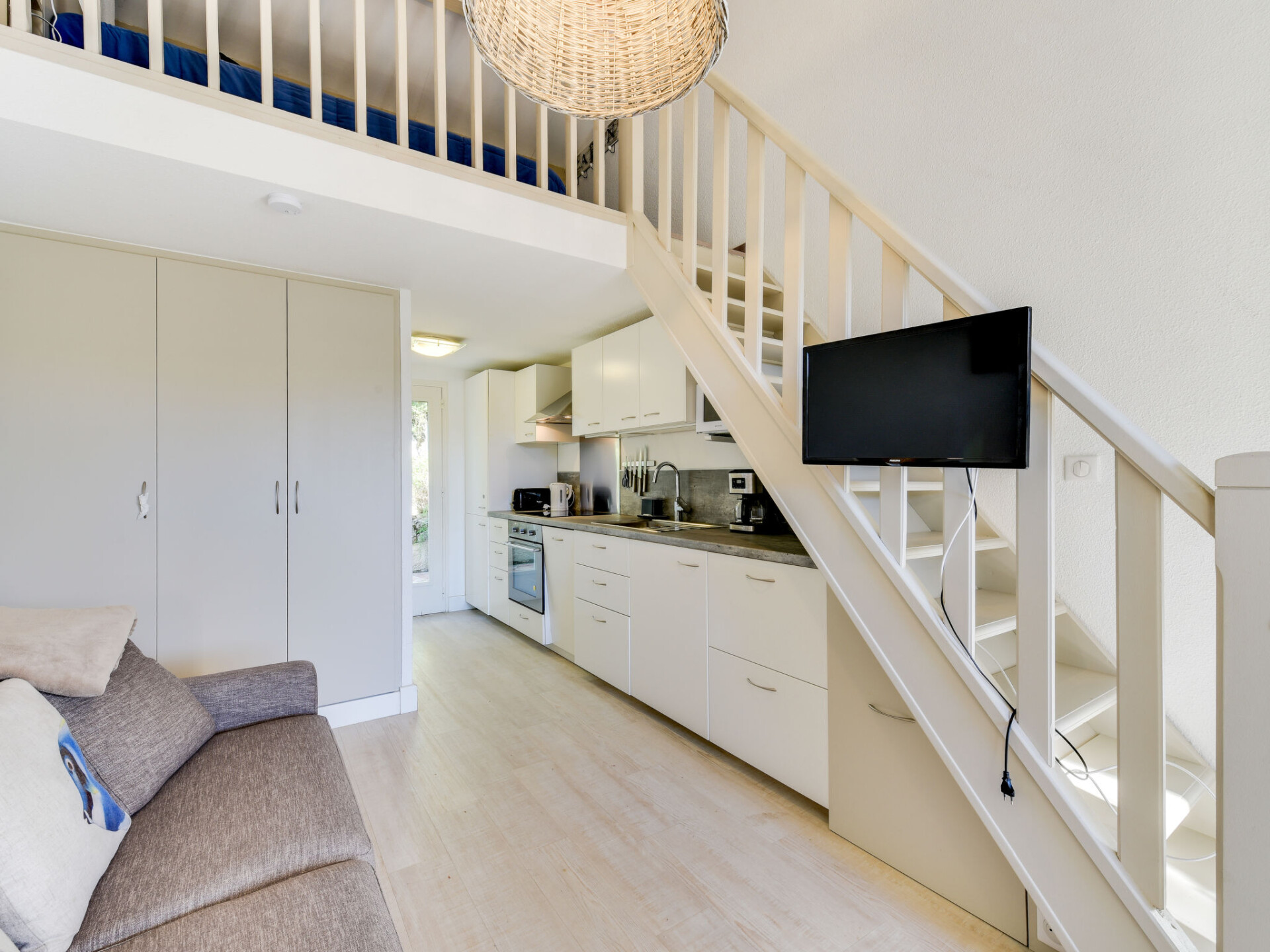 Studio 1-kamer 20 m2 op 2 verdiepingen, op de begane grond. Doelmatig en comfortabel ingericht: woon-/slaapkamer met 1 2-pers divanbed (140 cm, lengte 190 cm), TV (Flatscreen TV). Uitgang naar het terras. Open keuken (oven, afwasmachine, 4 inductiekookplaten, broodrooster, waterkoker, magnetron, elektrische koffiemachine). Uitgang naar het balkon. Douche/WC. Elektrische verwarming, boiler (200 liter). Bovenverdieping: 1 open kamer 9 m2, met afgeschuinde daken met 1 2-pers bed (1 x 140 cm, lengte 190 cm), ventilator. Balkon 7 m2, op het noorden gelegen en op het westen gelegen, terras 12 m2, op het zuiden gelegen. Terrasmeubelen, ligstoelen (2). Uitzicht op de tuin. Ter beschikking: wasmachine, strijkijzer. Internet (WiFi, gratis). Parkeerplaats nr. 7 (omheind). TV alleen FR. Rookmelders.
