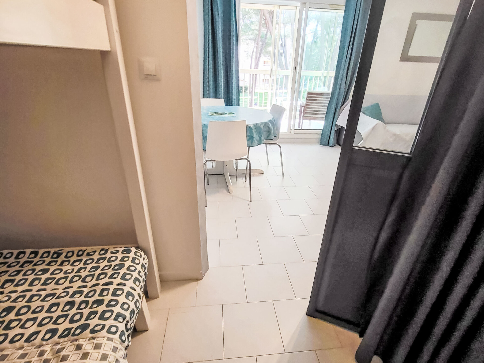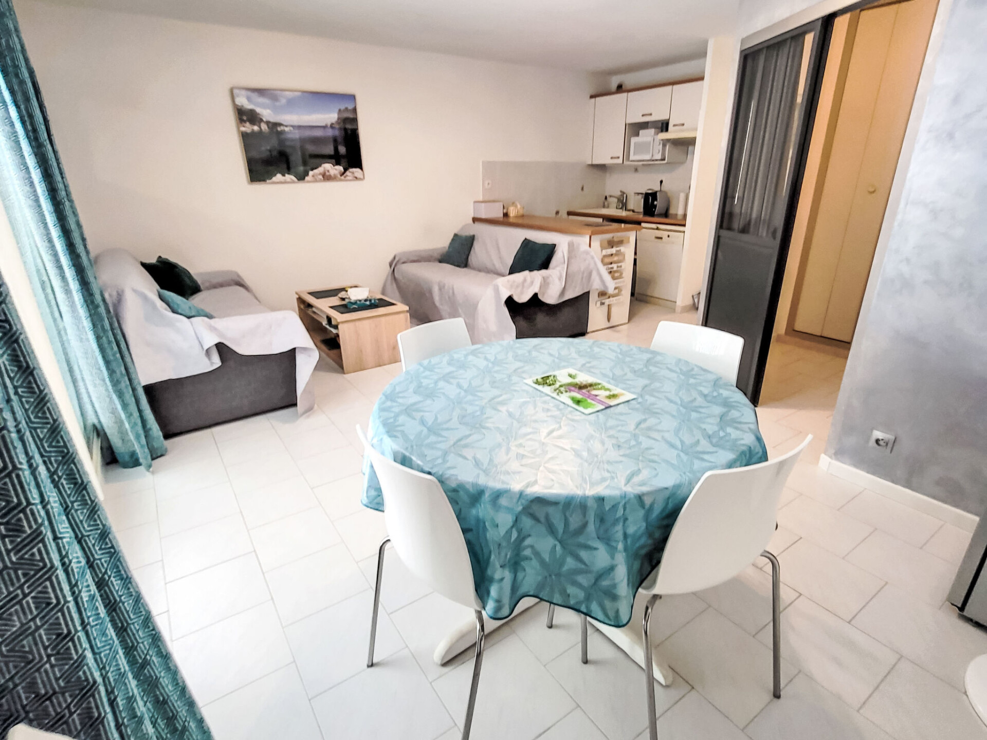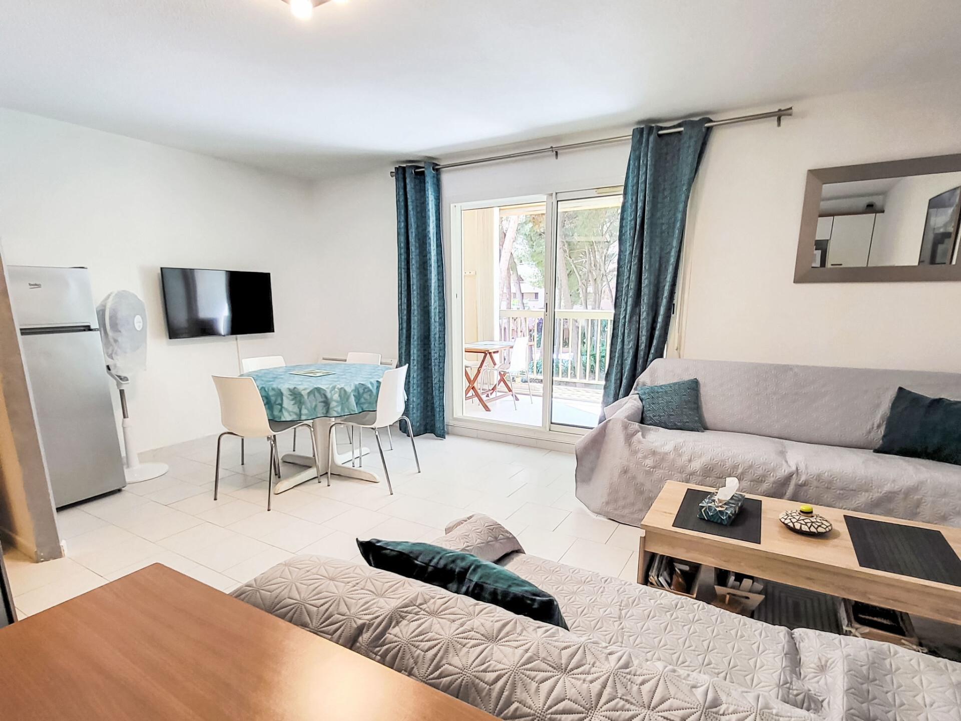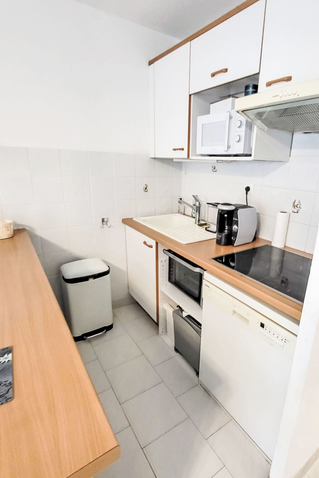 Appartement 2-kamers 45 m2 op de 2e verdieping. Comfortabel ingericht: woon-/eetkamer met TV (Flatscreen TV). Uitgang naar het terras. 1 kamer met 1 2-pers bed (160 cm, lengte 200 cm), ventilator. 1 kleine kamer met 1 x 2 stapelbedden (90 cm, lengte 200 cm). Kookhoek (afwasmachine, 3 keramische glas kookplaten, broodrooster, magnetron, diepvriezer, elektrische koffiemachine). Badkamer, aparte WC. Elektrische verwarming. Terras 10 m2, overdekt. Terrasmeubelen. Ter beschikking: wasmachine. Internet (WiFi, extra). Parkeerplaats. Rookmelders. Aanbod door een particulier volgens art. 155, IV van CGI.