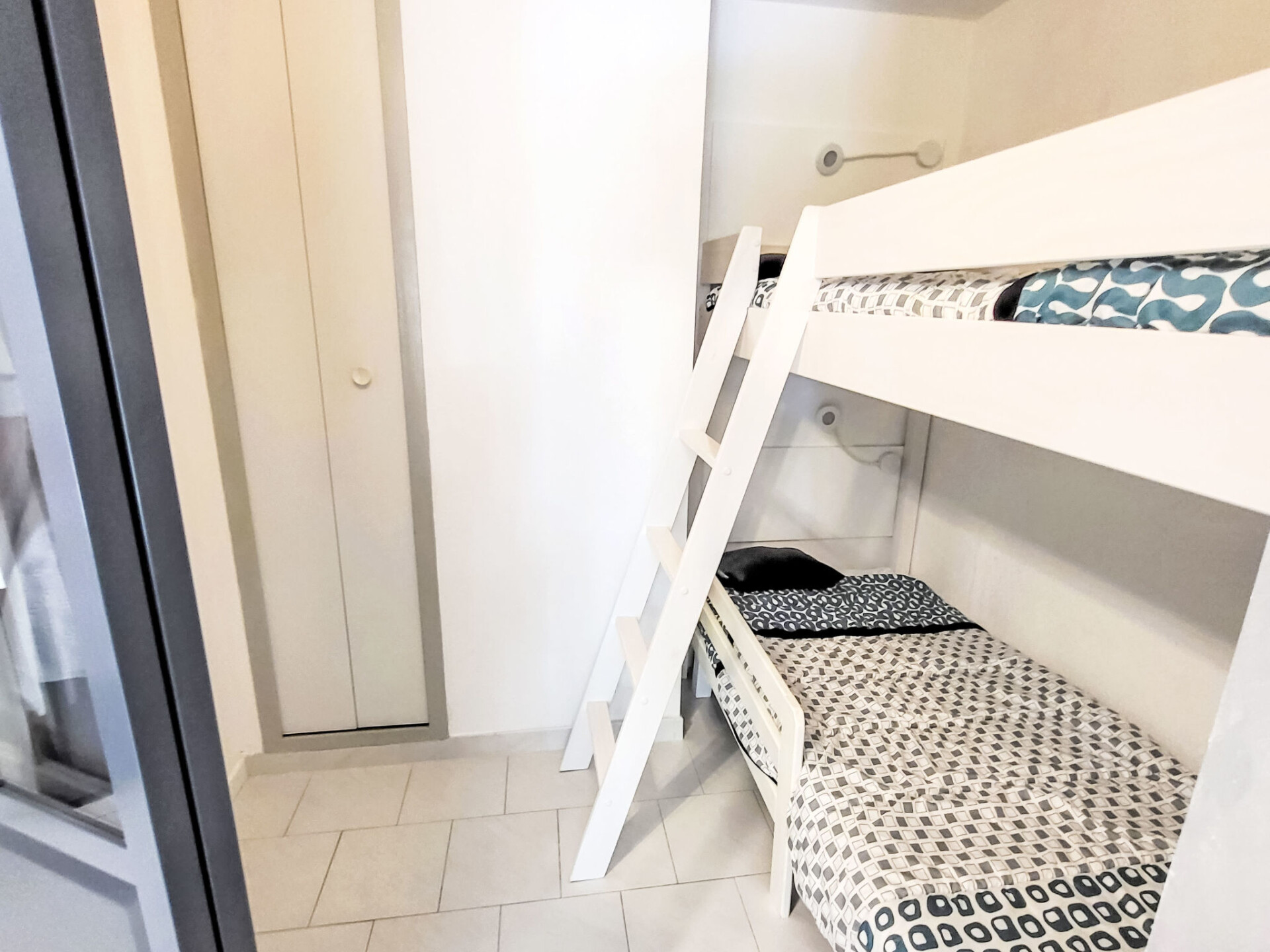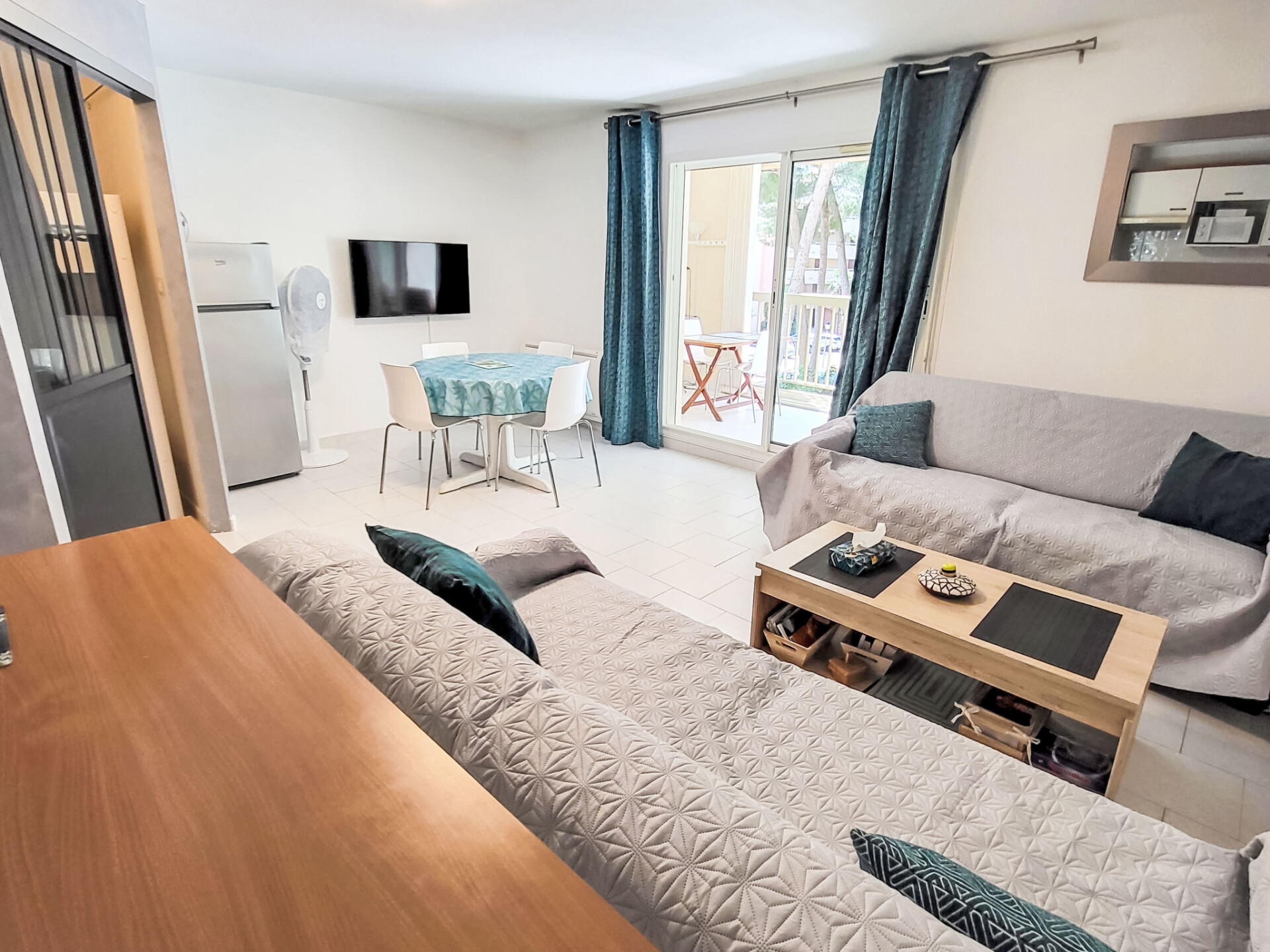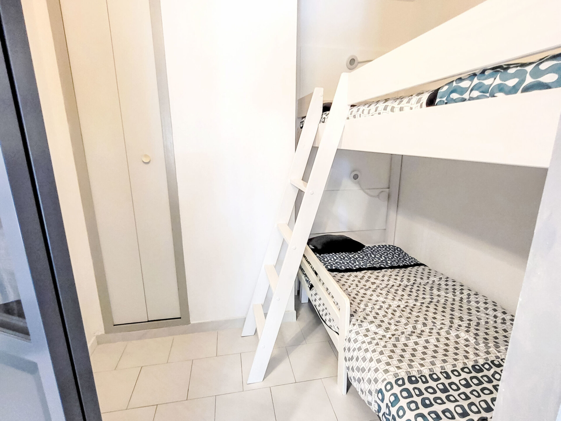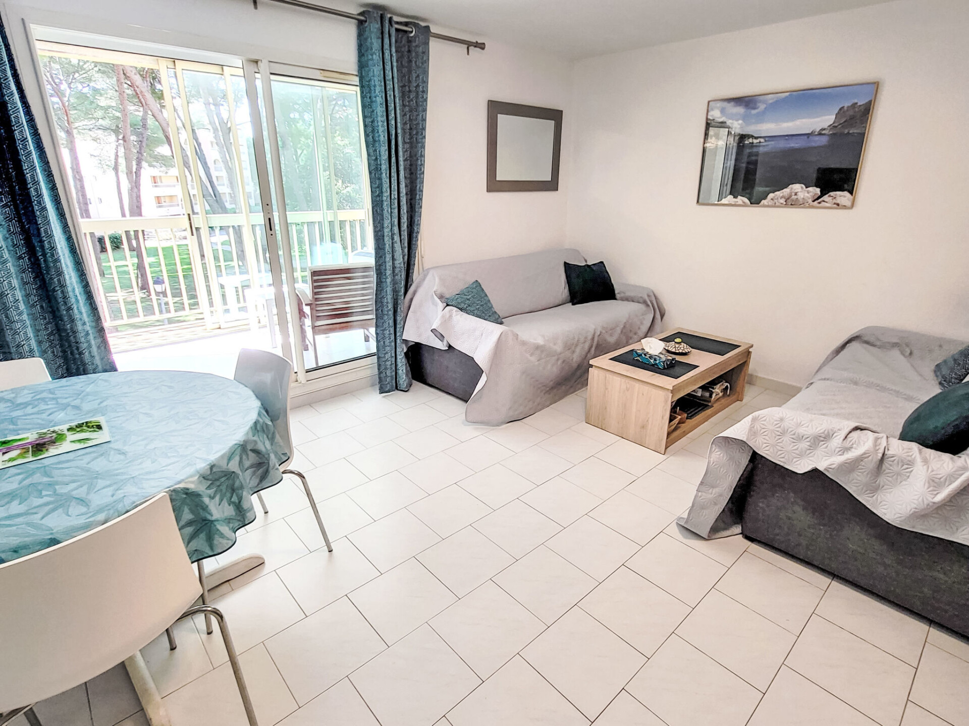 Appartement 2-kamers 45 m2 op de 2e verdieping. Comfortabel ingericht: woon-/eetkamer met TV (Flatscreen TV). Uitgang naar het terras. 1 kamer met 1 2-pers bed (160 cm, lengte 200 cm), ventilator. 1 kleine kamer met 1 x 2 stapelbedden (90 cm, lengte 200 cm). Kookhoek (afwasmachine, 3 keramische glas kookplaten, broodrooster, magnetron, diepvriezer, elektrische koffiemachine). Badkamer, aparte WC. Elektrische verwarming. Terras 10 m2, overdekt. Terrasmeubelen. Ter beschikking: wasmachine. Internet (WiFi, extra). Parkeerplaats. Rookmelders. Aanbod door een particulier volgens art. 155, IV van CGI.