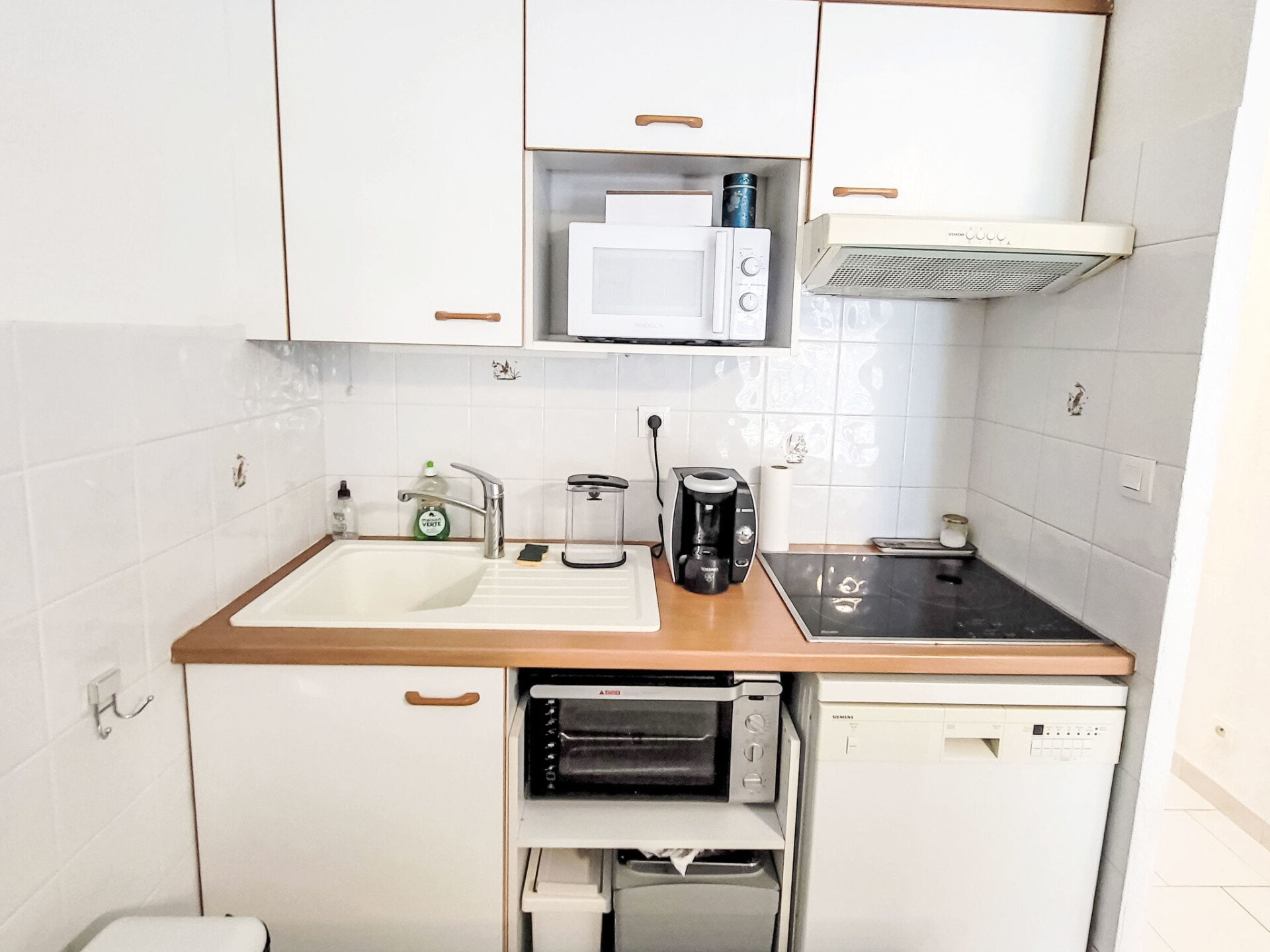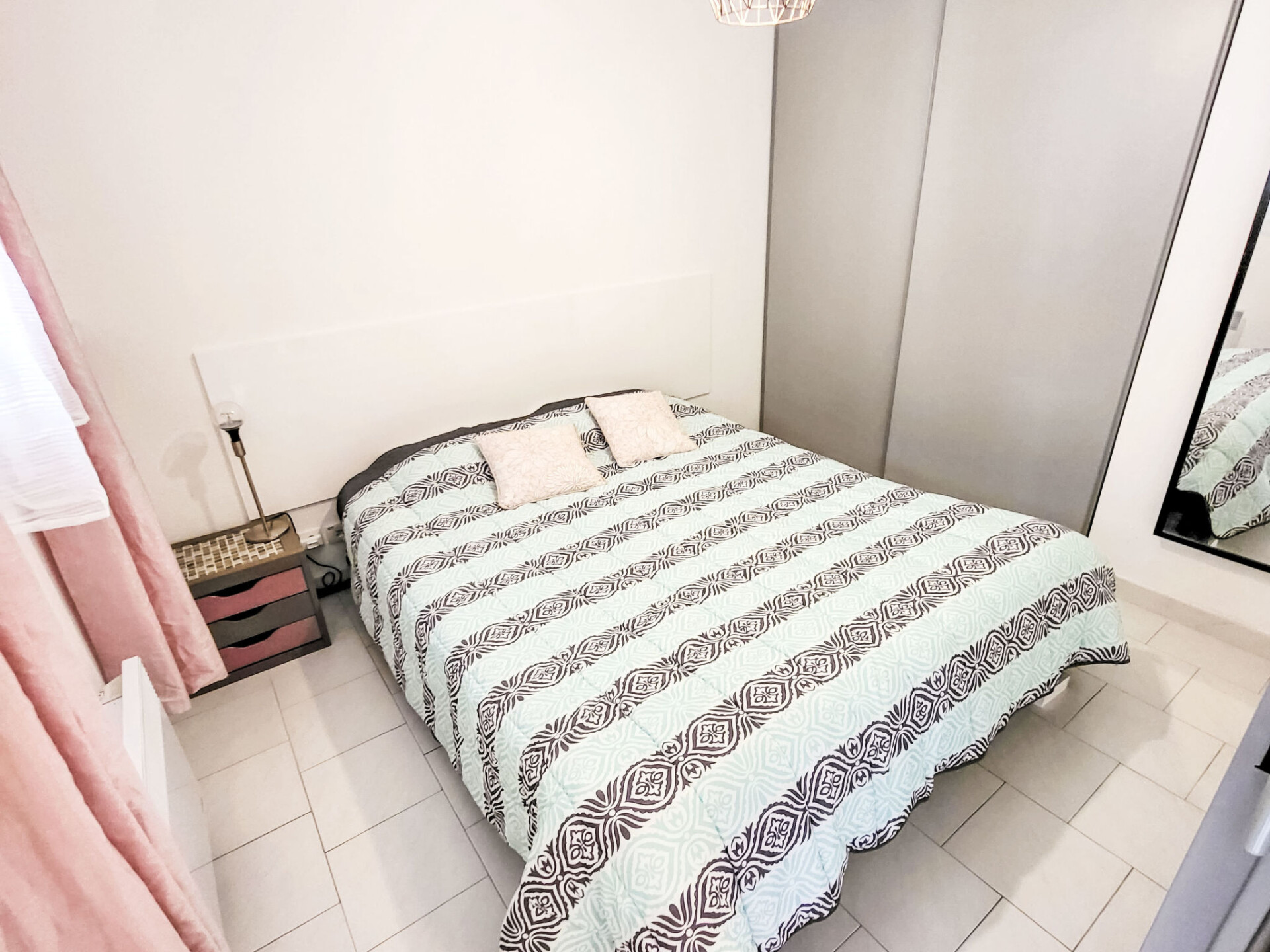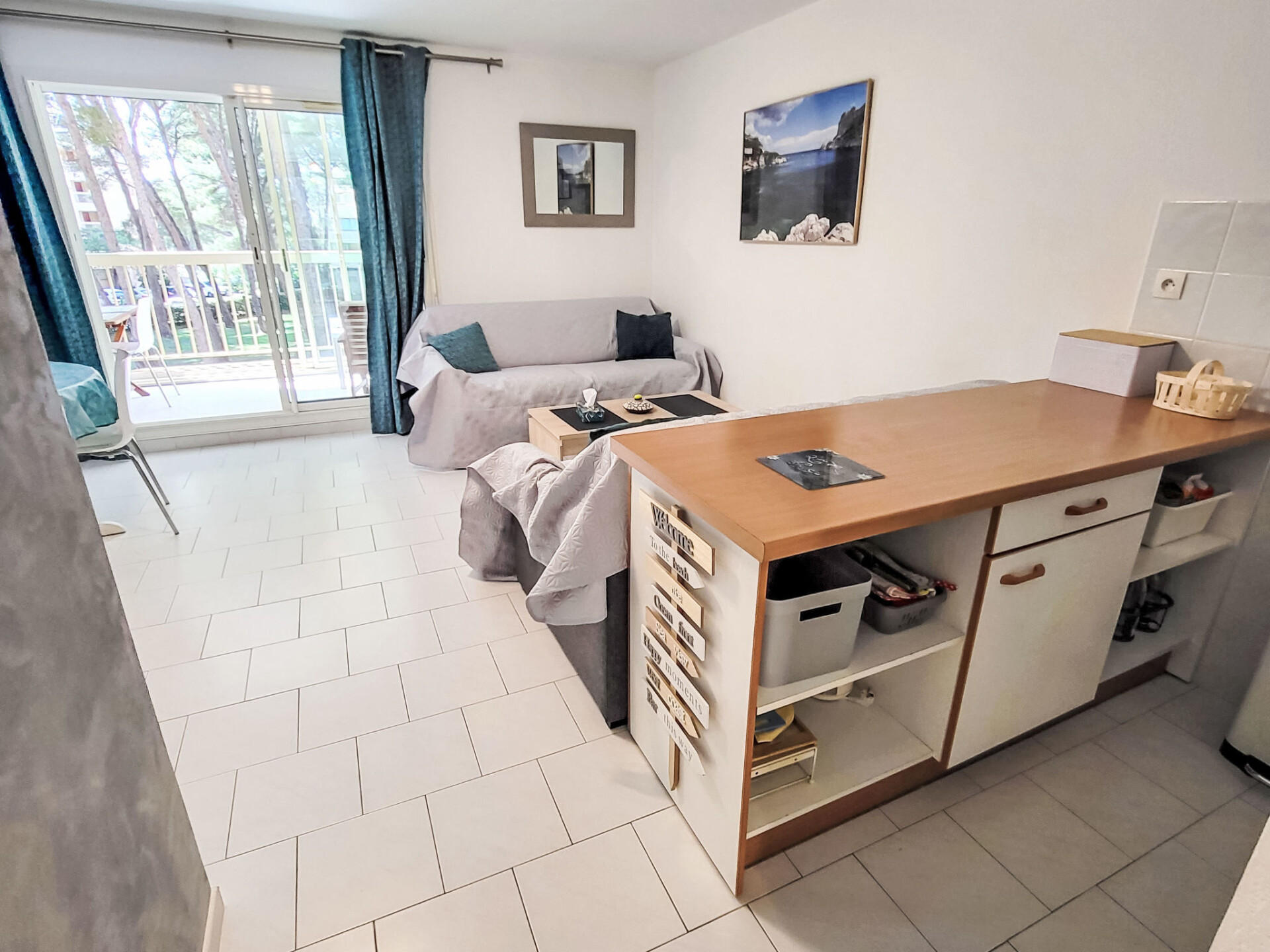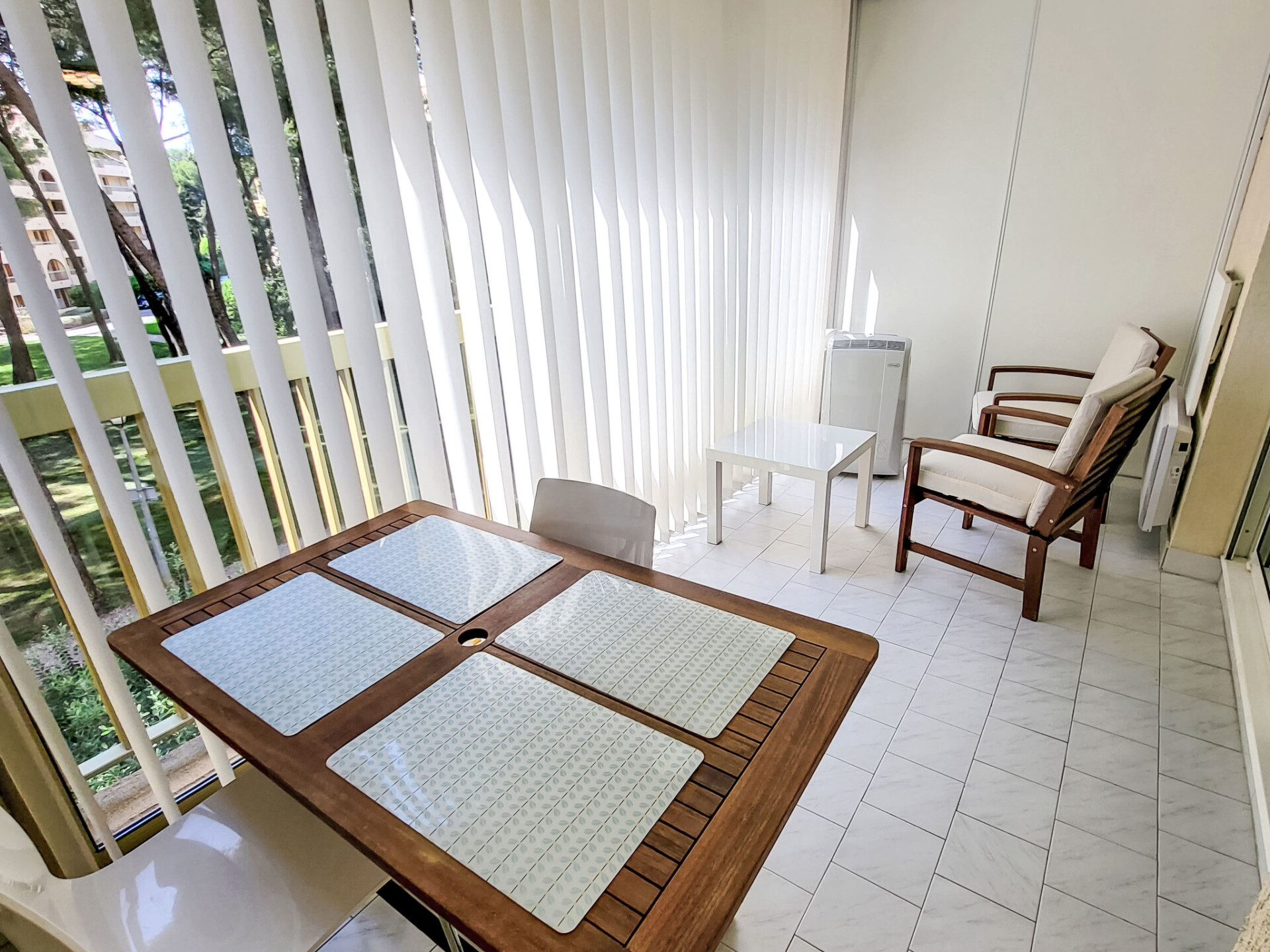 Appartement 2-kamers 45 m2 op de 2e verdieping. Comfortabel ingericht: woon-/eetkamer met TV (Flatscreen TV). Uitgang naar het terras. 1 kamer met 1 2-pers bed (160 cm, lengte 200 cm), ventilator. 1 kleine kamer met 1 x 2 stapelbedden (90 cm, lengte 200 cm). Kookhoek (afwasmachine, 3 keramische glas kookplaten, broodrooster, magnetron, diepvriezer, elektrische koffiemachine). Badkamer, aparte WC. Elektrische verwarming. Terras 10 m2, overdekt. Terrasmeubelen. Ter beschikking: wasmachine. Internet (WiFi, extra). Parkeerplaats. Rookmelders. Aanbod door een particulier volgens art. 155, IV van CGI.