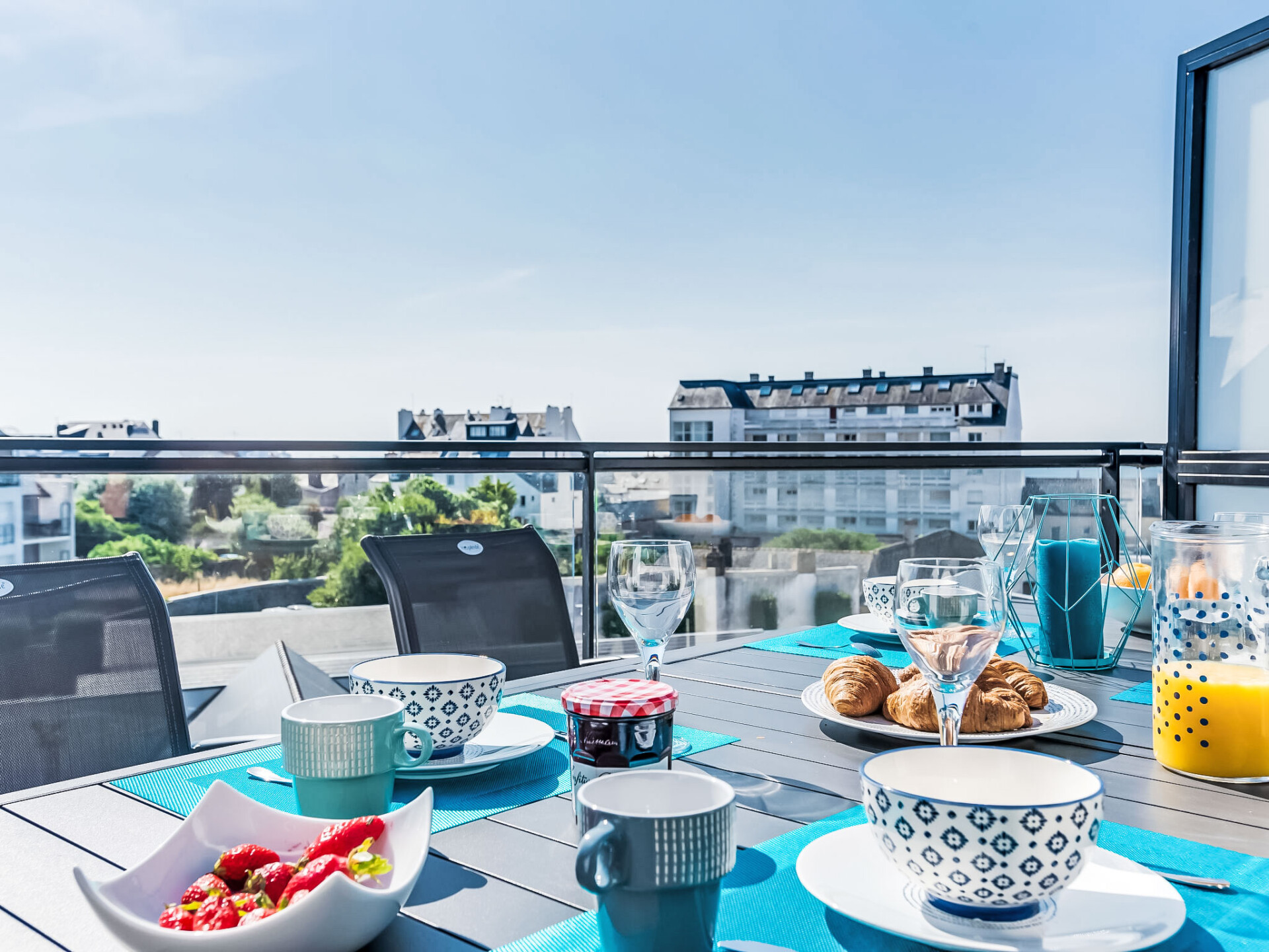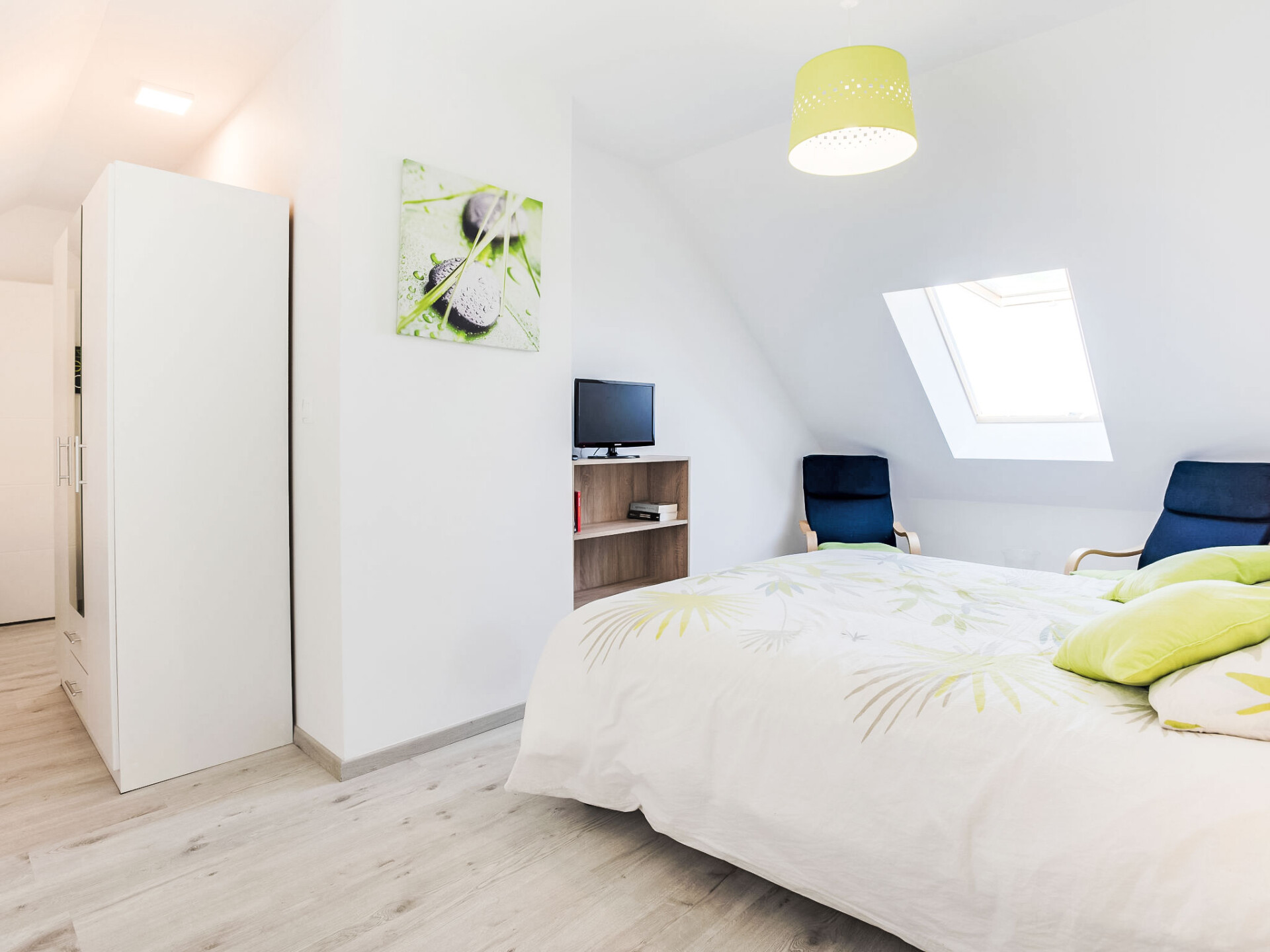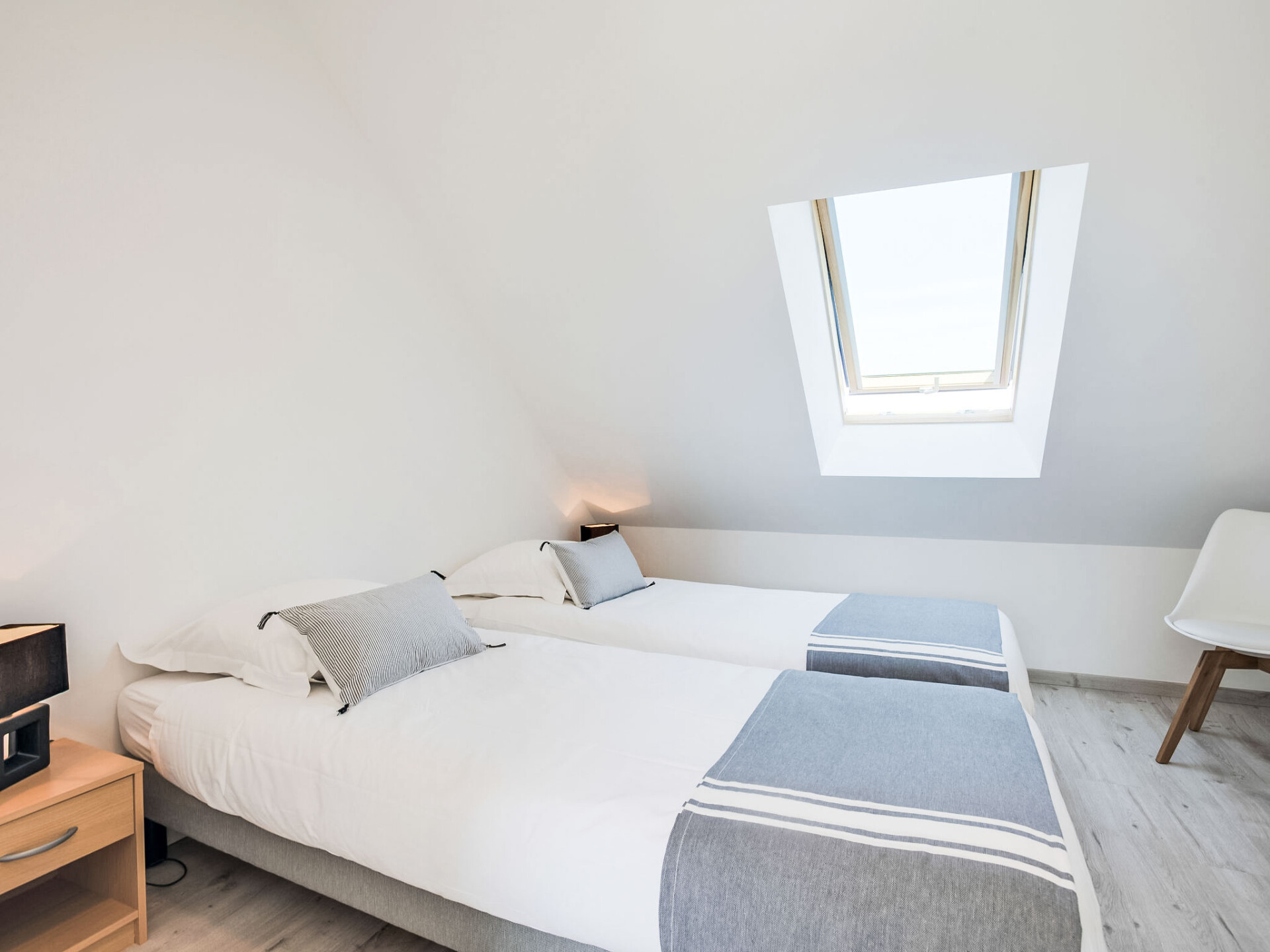 Appartement 3-kamers 100 m2 op 2 verdiepingen op de 3e verdieping. Mooi en modern ingericht: woon-/eetkamer met TV (Flatscreen TV). Uitgang naar het balkon. Open keuken (oven, afwasmachine, 3 inductiekookplaten, magnetron, diepvriezer, elektrische koffiemachine, pads voor de koffiemachine (Senseo) extra). Uitgang naar het terras. Douche, aparte WC. Gas-verwarming. Bovenverdieping: 1 kamer met 1 2-pers bed (1 x 160 cm, lengte 200 cm), douche/WC. 1 kamer met 2 bedden (80 cm, lengte 200 cm). Groot terras 15 m2. Terrasmeubelen. Beperkt uitzicht op zee. Ter beschikking: wasmachine, droger, haardroger. Internet (WiFi, gratis). Parkeerplaats nr. 25, garage (1 Auto). Rookmelders. 56186 000716 JS