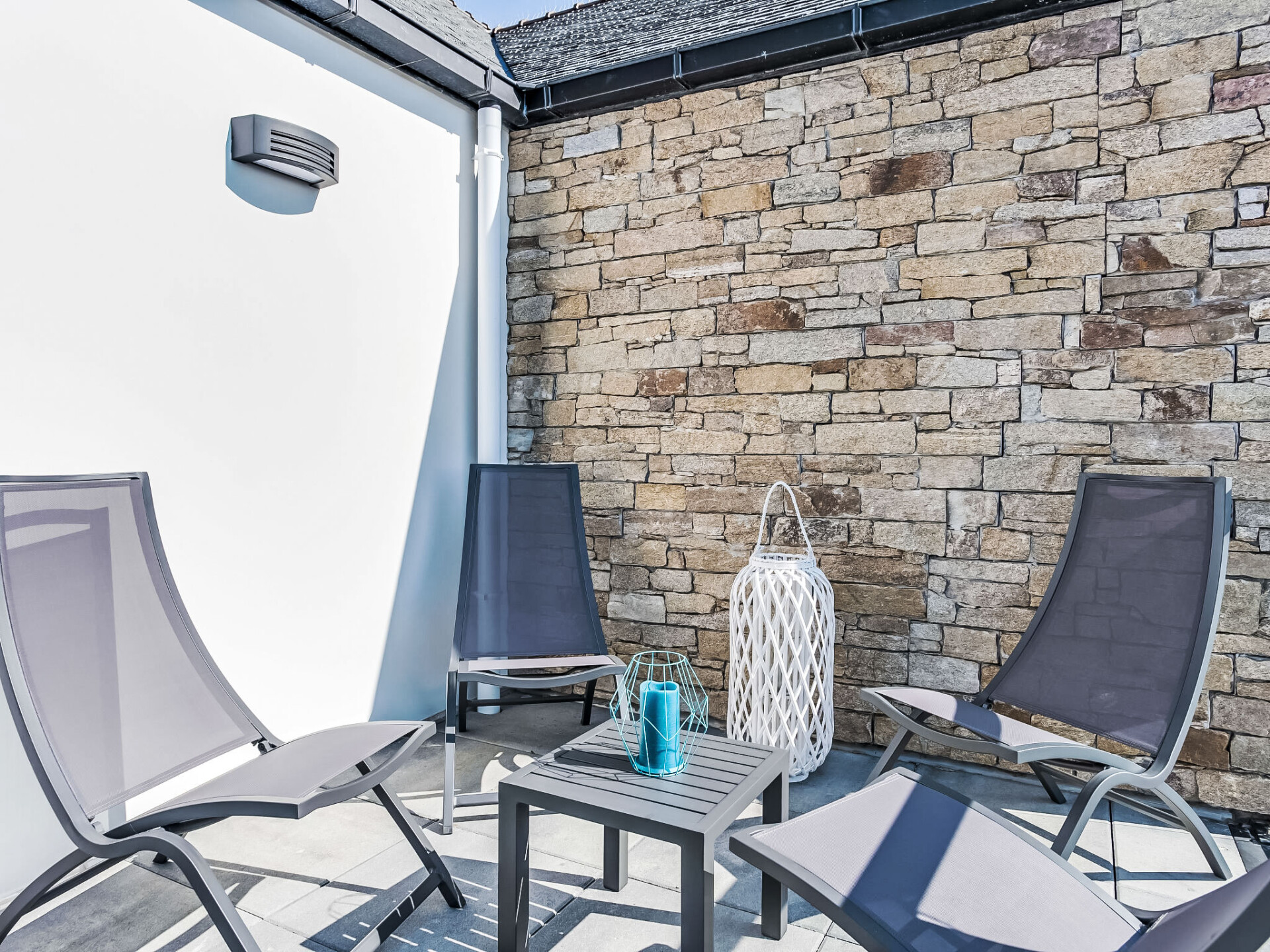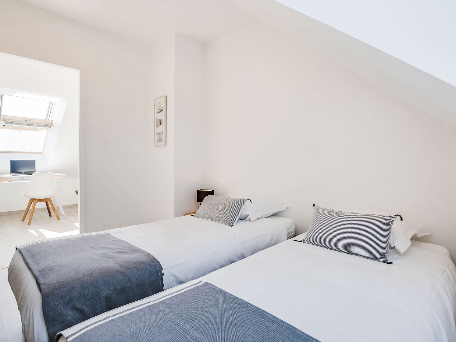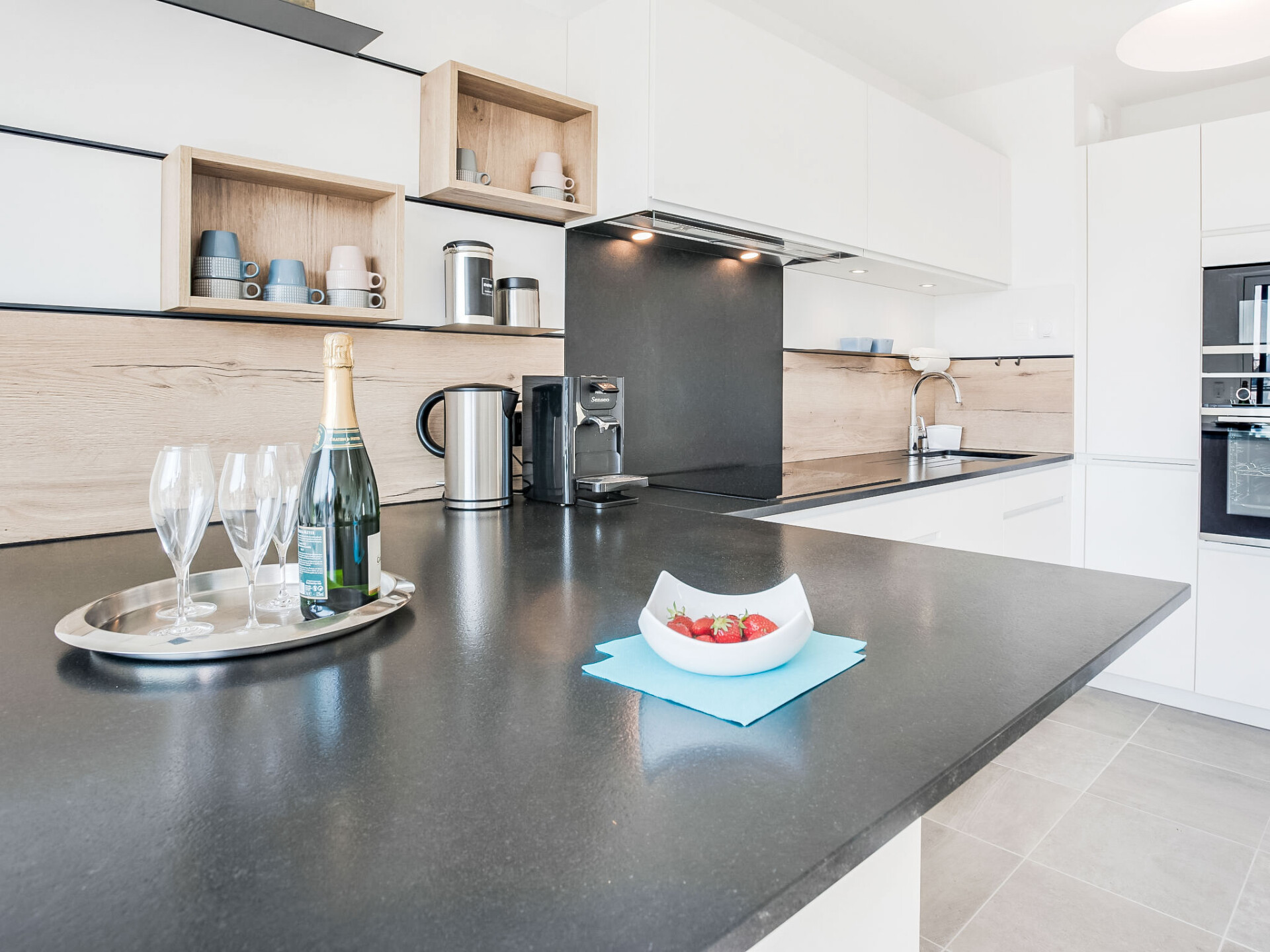 Appartement 3-kamers 100 m2 op 2 verdiepingen op de 3e verdieping. Mooi en modern ingericht: woon-/eetkamer met TV (Flatscreen TV). Uitgang naar het balkon. Open keuken (oven, afwasmachine, 3 inductiekookplaten, magnetron, diepvriezer, elektrische koffiemachine, pads voor de koffiemachine (Senseo) extra). Uitgang naar het terras. Douche, aparte WC. Gas-verwarming. Bovenverdieping: 1 kamer met 1 2-pers bed (1 x 160 cm, lengte 200 cm), douche/WC. 1 kamer met 2 bedden (80 cm, lengte 200 cm). Groot terras 15 m2. Terrasmeubelen. Beperkt uitzicht op zee. Ter beschikking: wasmachine, droger, haardroger. Internet (WiFi, gratis). Parkeerplaats nr. 25, garage (1 Auto). Rookmelders. 56186 000716 JS