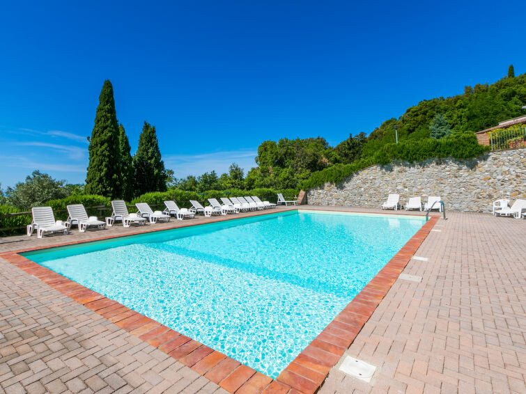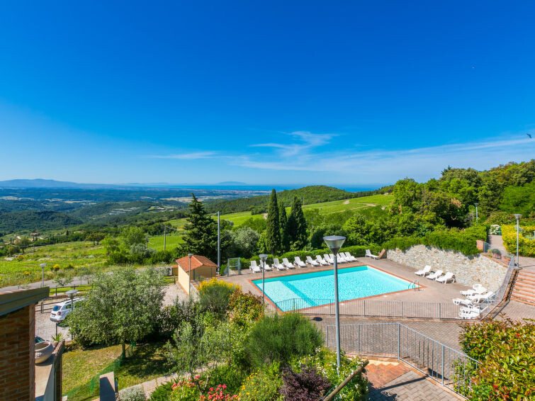 Residentie "Poggio di Nocola", van 3 verdiepingen, omgeven door velden en wijngaarden. 3 huizen in de plaats. 24 appartementen in de woning. In de wijk Noccolino, 4.5 km van het centrum van Riparbella, rustige, zonnige ligging, 14 km van zee. Voor medegebruik: terrein 10.000 m2 (omheind), tuin op verschillende niveaus, openluchtzwembad omheind (14 x 7 m, 140 - 140 cm diepte, seizoensgebonden beschikbaarheid: 01.Mei. - 15.Okt.). Buitendouche, parkeerplaats op het terrein. Winkel 4.5 km, bushalte "Via Del Commercio Poggio Di Noco" 240 m, zandstrand "Marina di Cecina" 14.5 km, thermaalbad "Calidario" 50 km. Attracties in de buurt: Bolgheri 30 km, Pisa 66 km, Firenze 110 km. Auto noodzakelijk.