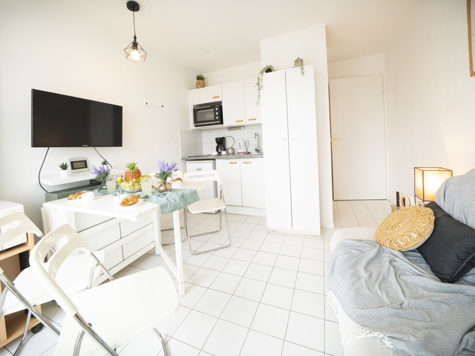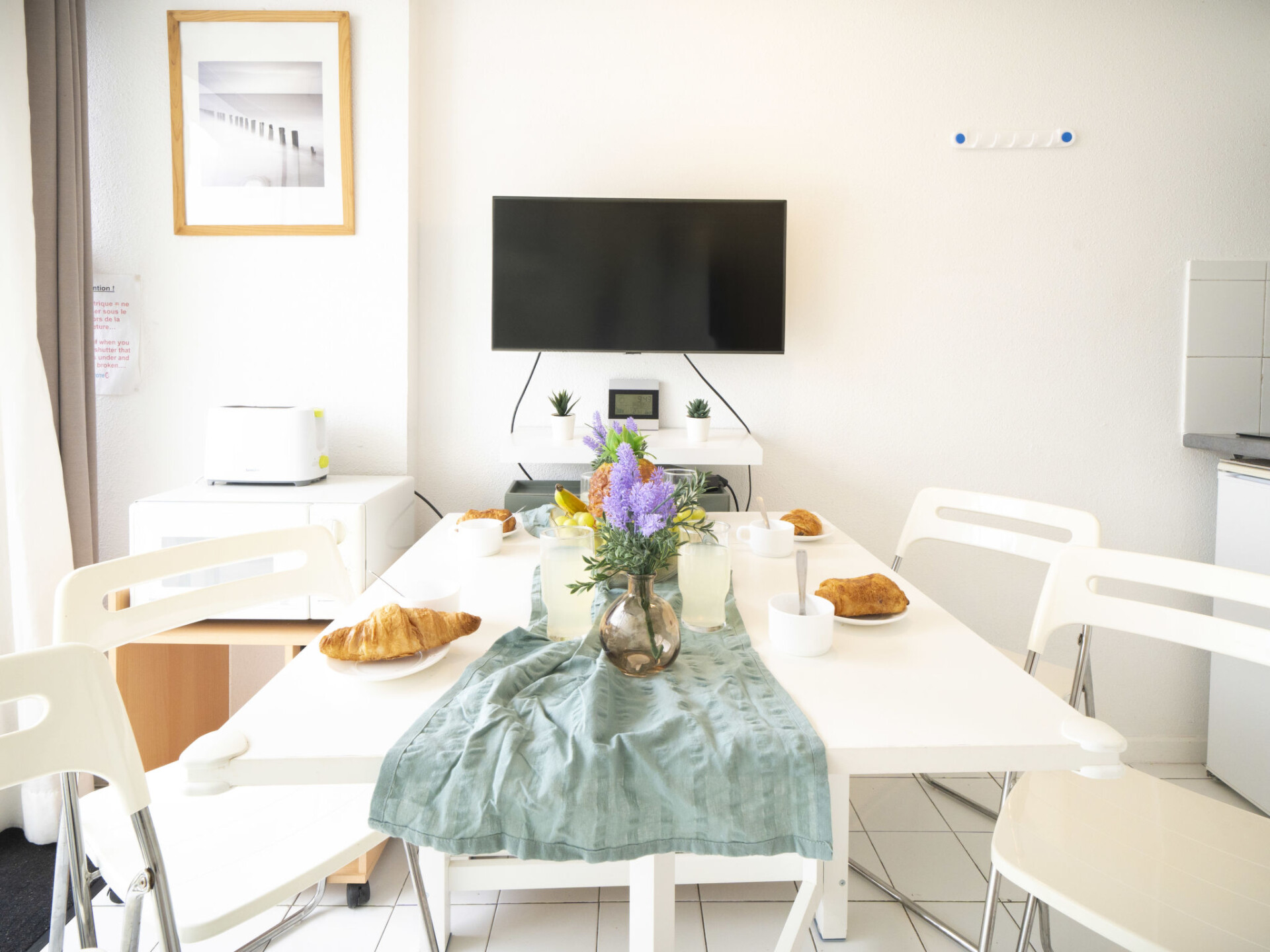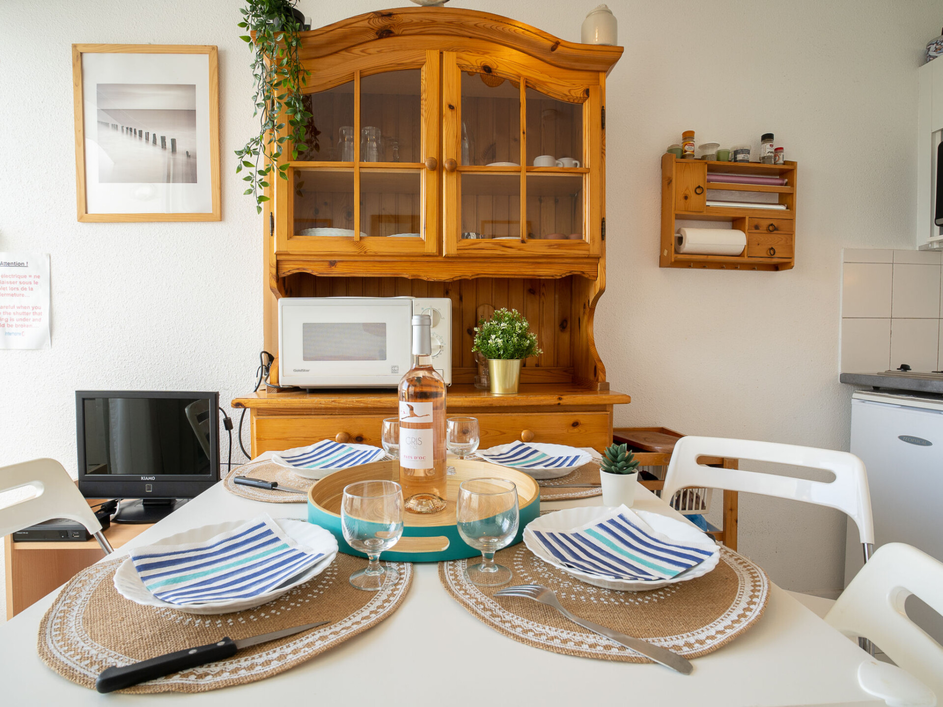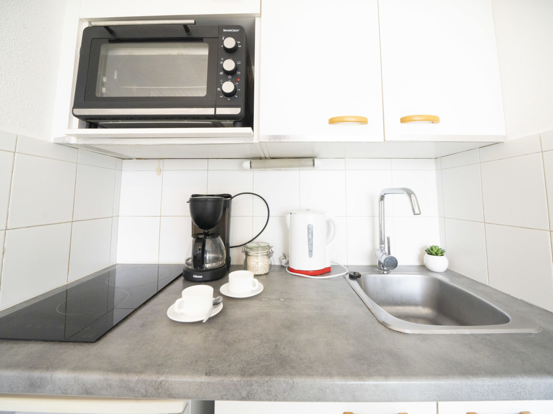 Appartement 1-kamer 21 m2 op de 2e verdieping. Het objekt is geschikt voor 2 volwassenen + 2 kinderen. Woon-/eetkamer met 1 2-pers divanbed (140 cm, lengte 190 cm), TV (Flatscreen TV). Hal met 1 x 2 stapelbedden (90 cm, lengte 190 cm). Kookhoek (2-pits kookplaat, broodrooster, waterkoker, magnetron, elektrische koffiemachine). Douche/WC. Terras 6 m2, op het westen gelegen. Terrasmeubelen. Ter beschikking: Internet (Internet (WiFi), extra). Geen parkeerplaats. 1 klein huisdier/hond toegestaan. Rookmelders. 1578967284279