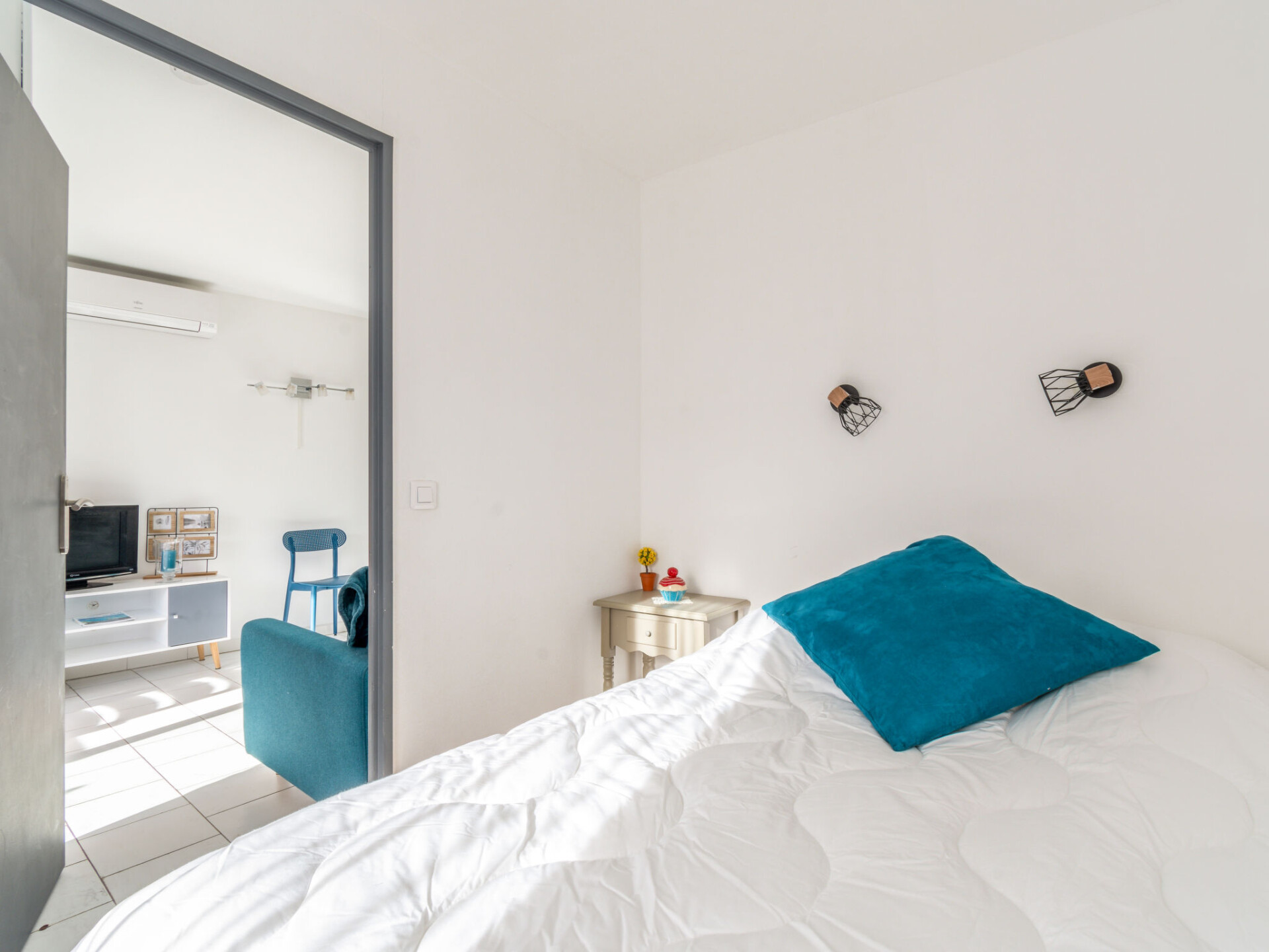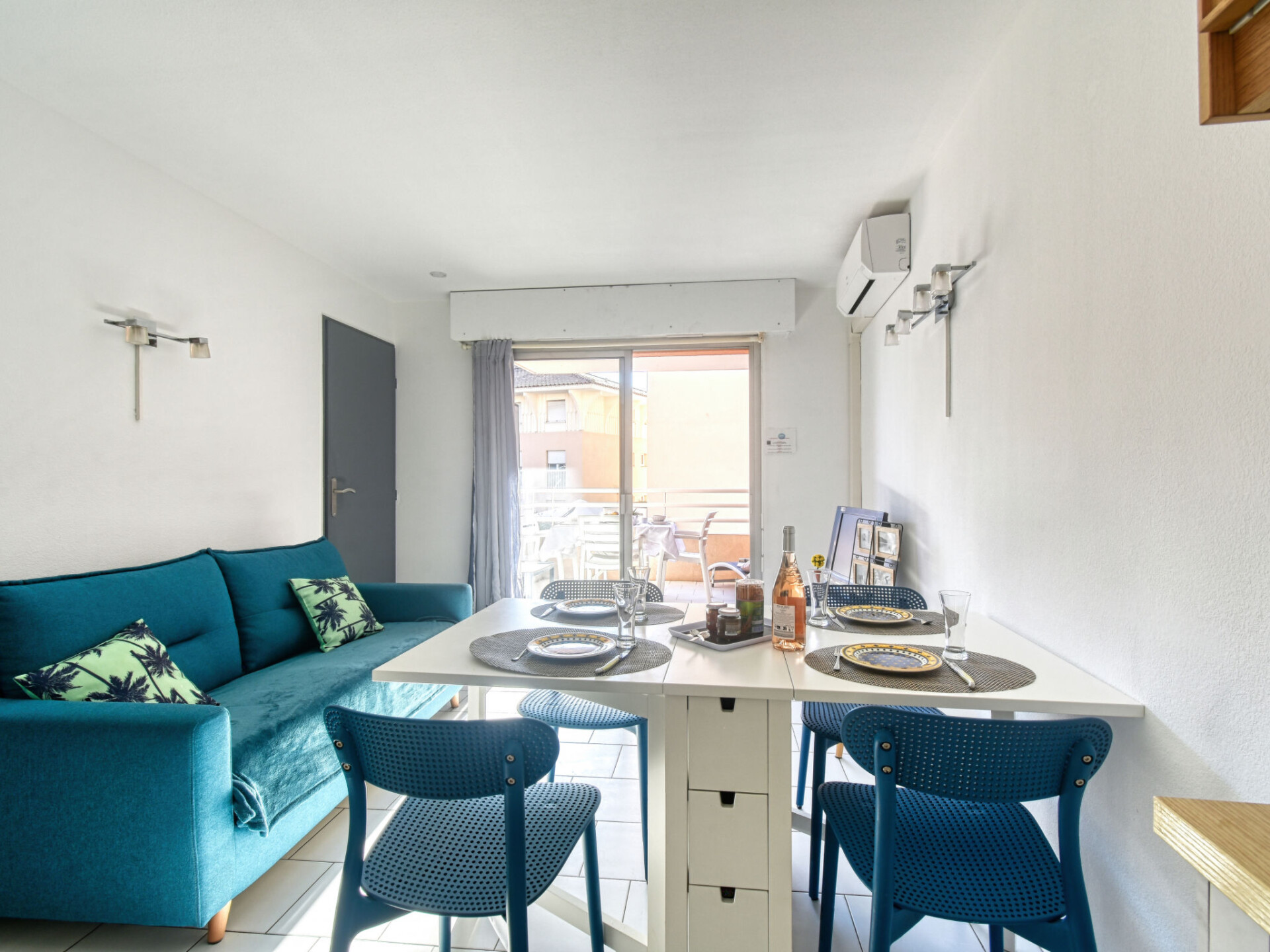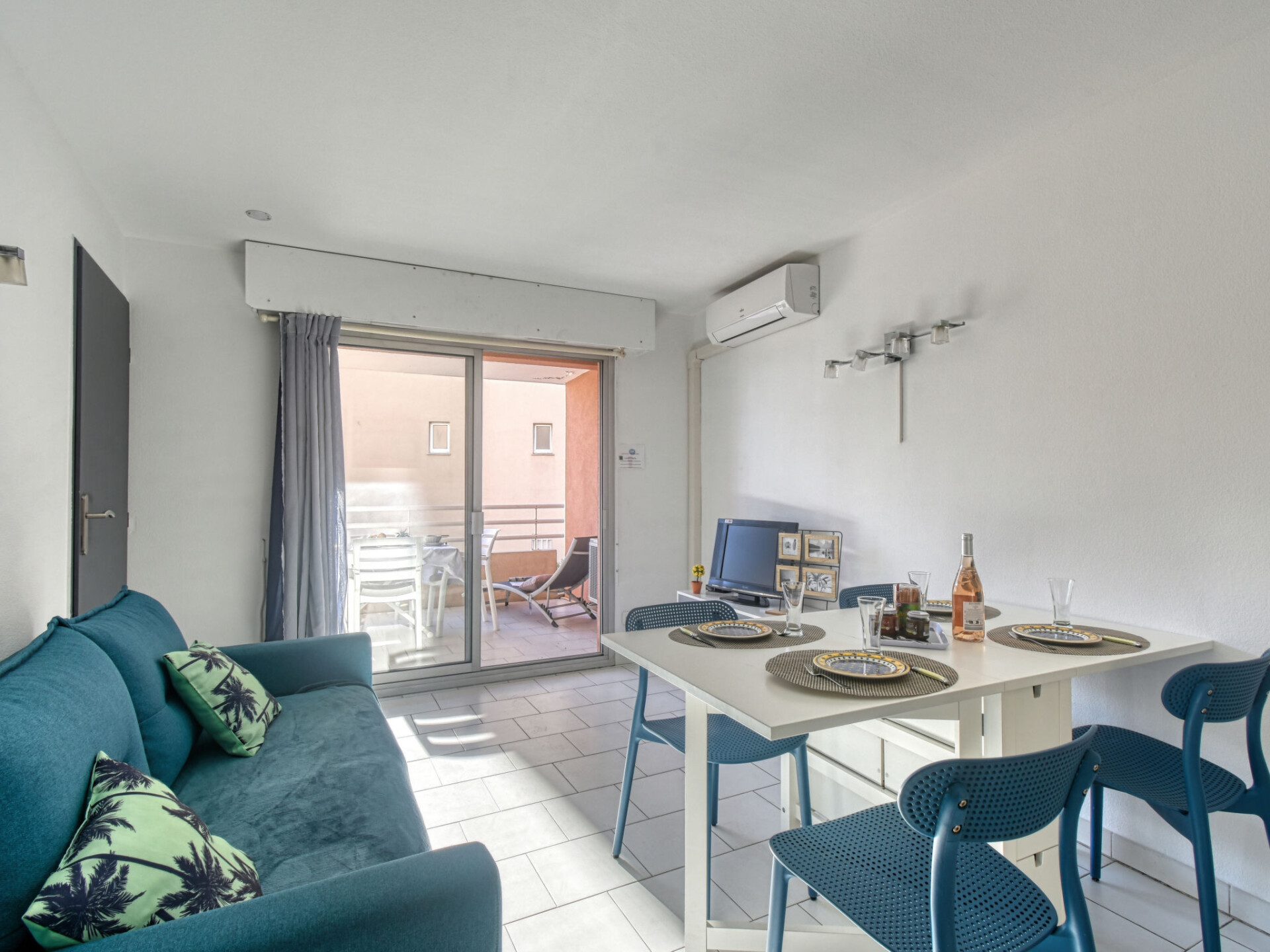 Appartement 2-kamers 29 m2 op de 3e verdieping. Het objekt is geschikt voor 2 volwassenen + 2 kinderen. Gerenoveerd in 2020: woon-/eetkamer met 1 2-pers divanbed (1 x 140 cm, lengte 200 cm), eethoek, TV en air-conditioning. Uitgang naar het terras. 1 kleine kamer met 1 2-pers bed (1 x 140 cm, lengte 190 cm). Kookhoek (1 inductiekookplaten, waterkoker, elektrische koffiemachine, combimagnetron). Douche, aparte WC. Elektrische verwarming. Terras. Terrasmeubelen. Ter beschikking: wasmachine. Internet (Internet (WiFi), extra). Parkeerplaats nr. 20 (overdekt), hoogte 190 cm, breedte 205 cm. Niet rokers woning. TV alleen FR. Rookmelders.