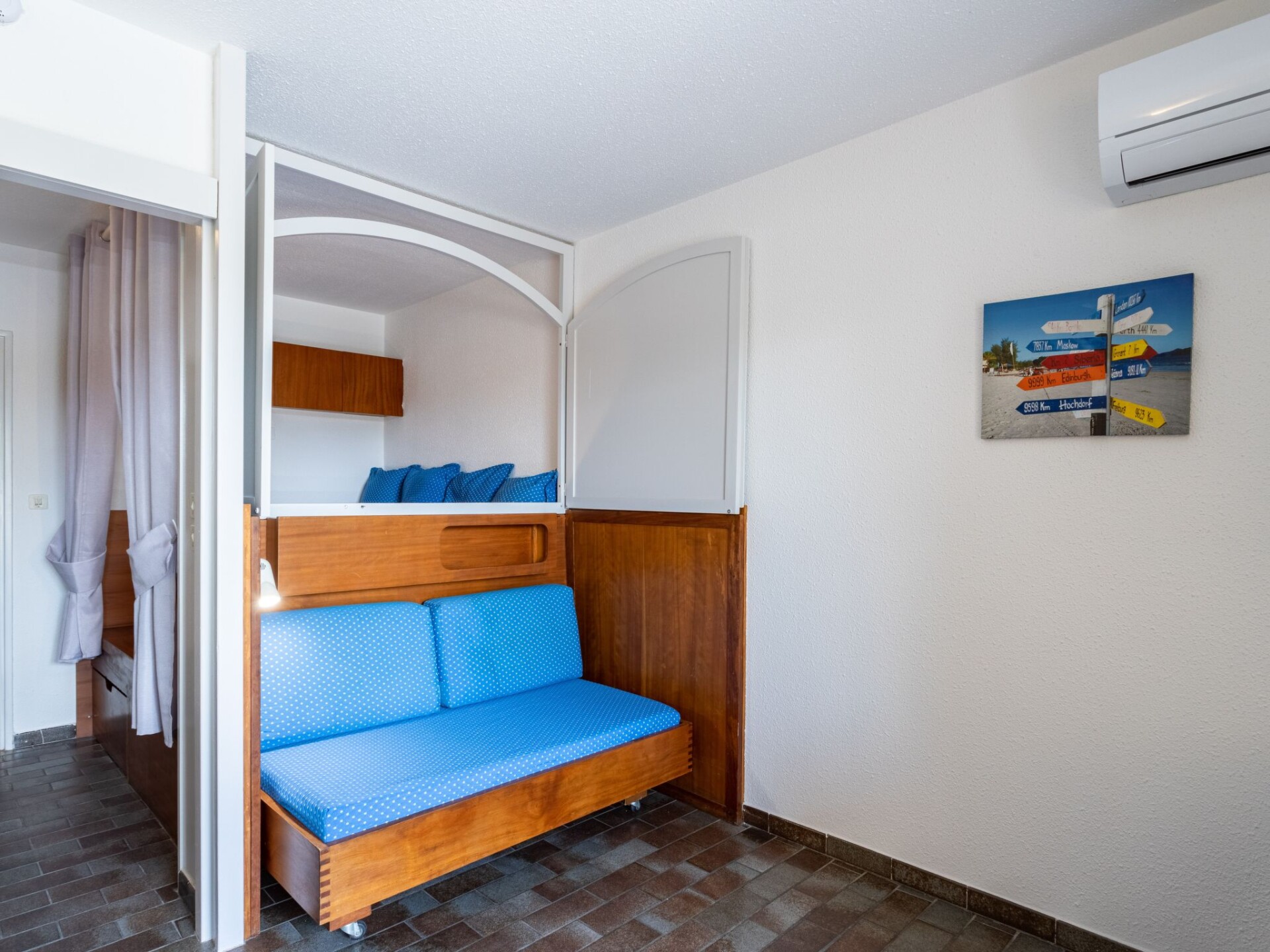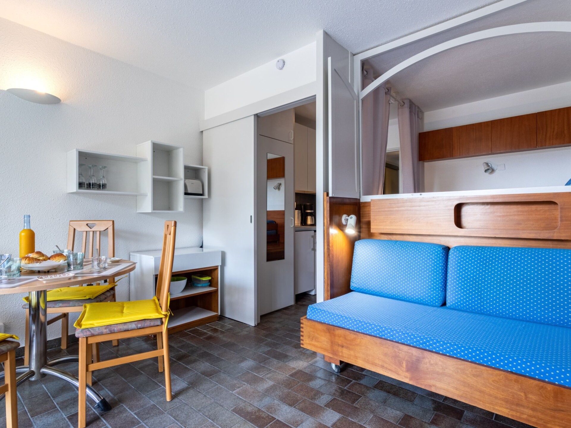 Studio 1-kamer 23 m2, op de begane grond. Gerenoveerd in 2022, comfortabel en mooi ingericht: woon-/eetkamer met 1 2-pers divanbed (140 cm, lengte 190 cm), eettafel en TV (Flatscreen TV). Uitgang naar het terras. Cabine met 1 uitschuifbaar bed (2 pers. 2 x 80 cm, lengte 190 cm). Kookhoek (afwasmachine, 2 inductiekookplaten, broodrooster, waterkoker, magnetron, elektrische koffiemachine). Douche/WC. Elektrische verwarming, air-conditioning. Terras 7 m2. Terrasmeubelen. Uitzicht op het landschap. Ter beschikking: wasmachine, strijkijzer, haardroger. Internet (Internet (WiFi), gratis). Parkeerplaats nr. 417 (overdekt). Koelkast zonder vriesvak. TV alleen FR. Rookmelders. In plaats van een afgesloten slaapkamer bevinden sommige slaapgedeeltes zich in een open ruimte (galerij, nis, etc.). Aanbod door een particulier volgens art. 155, IV van CGI.