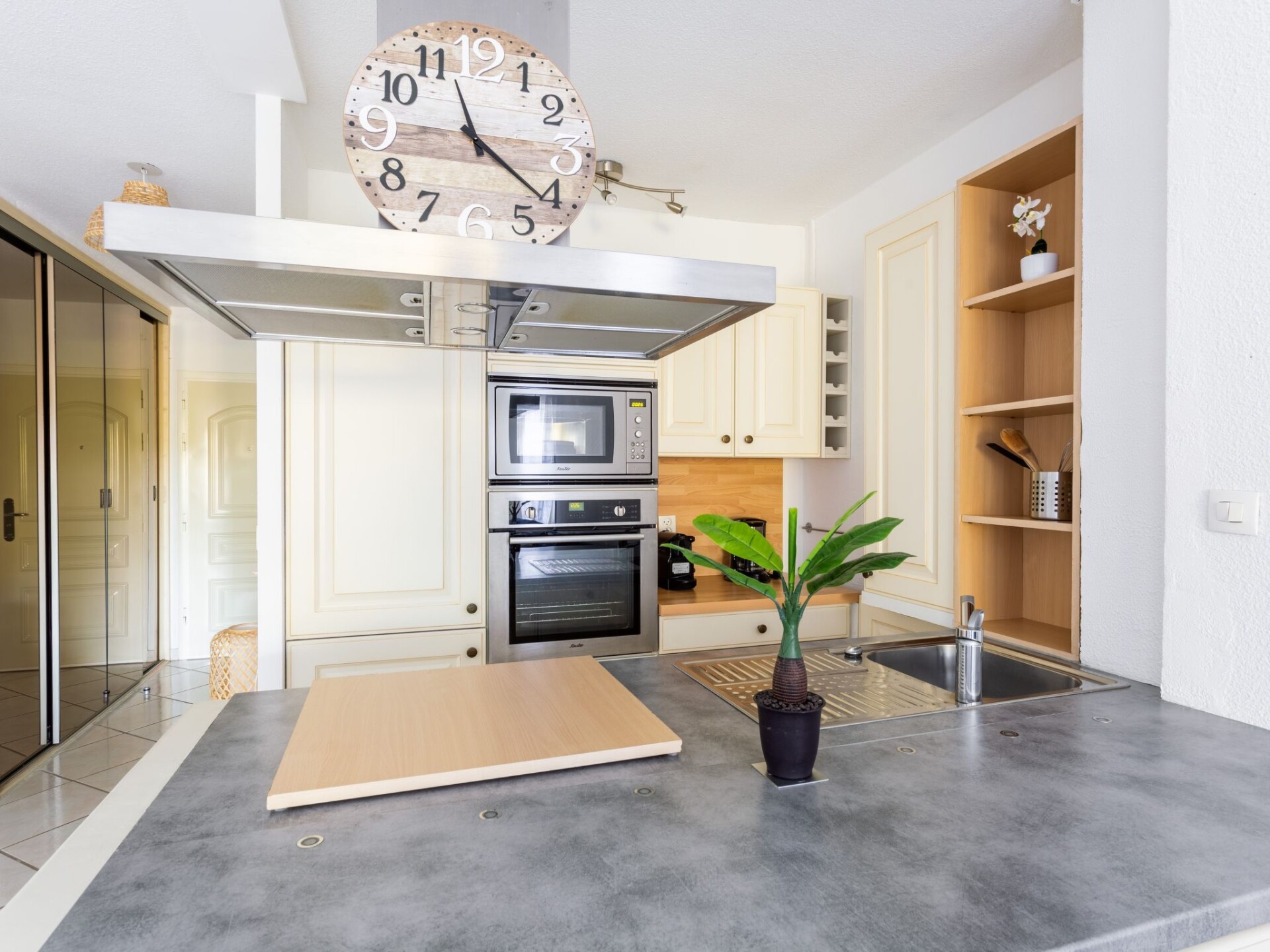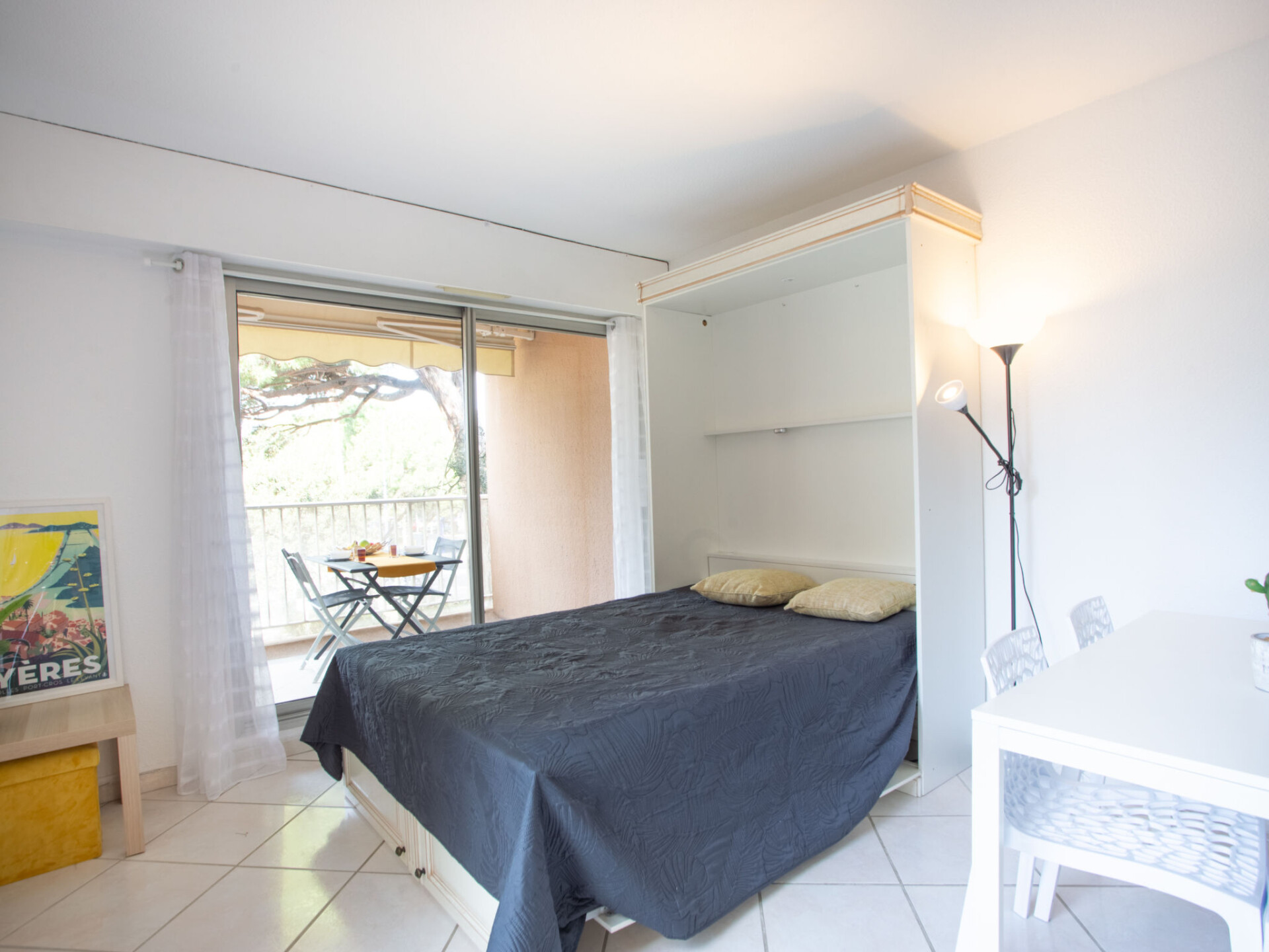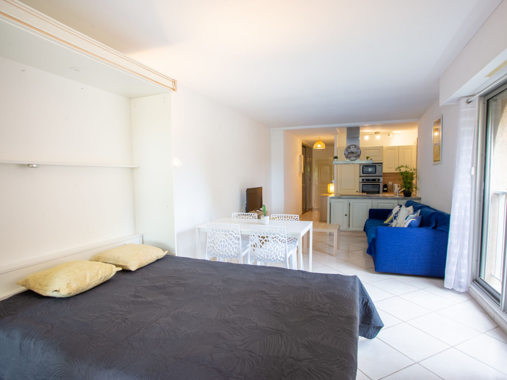 Studio 1-kamer 39 m2 op de 1e verdieping. Ruim en licht, volledig gerenoveerd in 2021, mooi en modern ingericht: woon-/eetkamer met 1 2-pers opklapbed (140 cm, lengte 190 cm), TV (Flatscreen TV). Uitgang naar het balkon. Kookhoek (oven, afwasmachine, 4 inductiekookplaten, broodrooster, waterkoker, magnetron, diepvriezer, elektrische koffiemachine, pads voor de koffiemachine (Expresso) extra) met eettafel. Douche, aparte WC. Air-conditioning, heteluchtverwarming. Balkon 7 m2. Balkonmeubilair. Uitzicht op. Ter beschikking: wasmachine, droger. Internet (WiFi, extra). Parkeerplaats nr. 848 environ 400 M. TV alleen FR. Rookmelders.