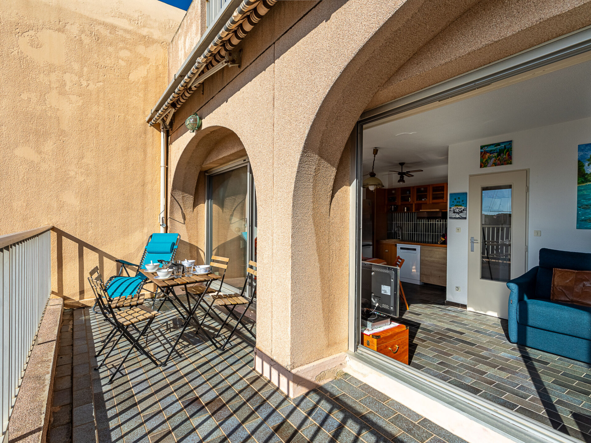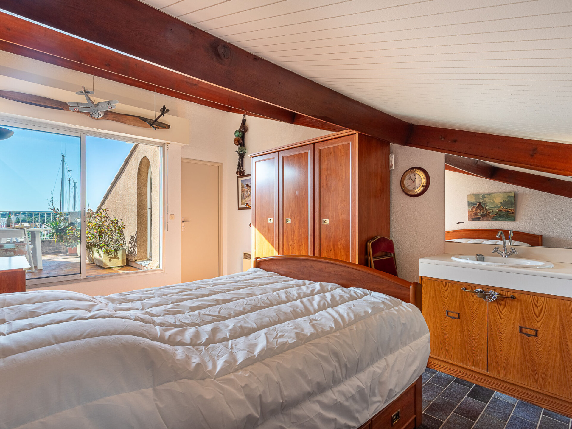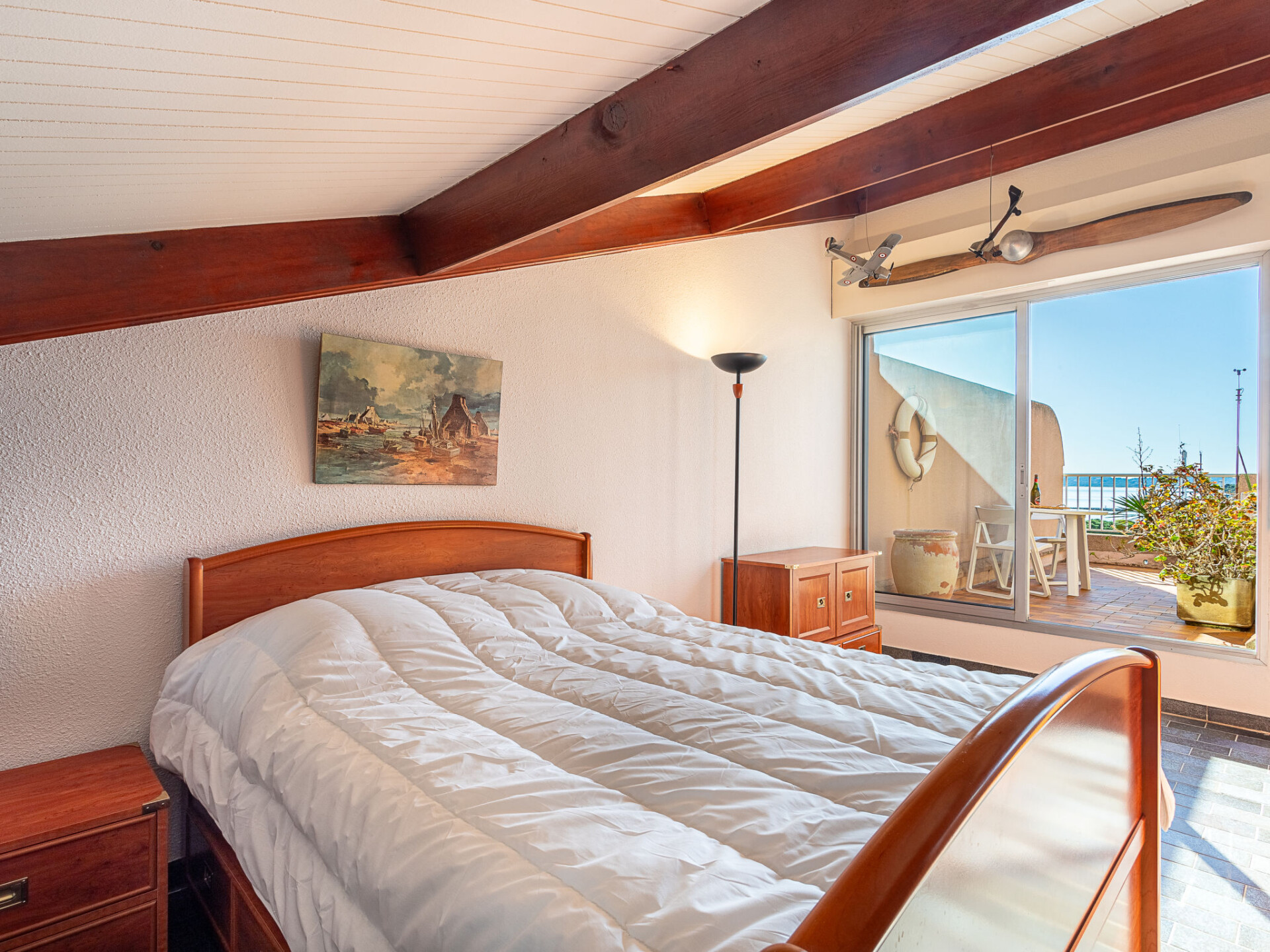 Appartement 2-kamers 43 m2 op 2 verdiepingen op de 3e verdieping. Licht, mooi ingericht: woon-/eetkamer met 1 2-pers divanbed (140 cm, lengte 190 cm), eettafel en TV (Flatscreen TV), stereo-installatie en air-conditioning. Uitgang naar het terras, op het zuiden. Kookhoek (mini-oven, afwasmachine, 3 keramische glas kookplaten, broodrooster, waterkoker, magnetron, diepvriezer, elektrische koffiemachine, pads voor de koffiemachine (Nespresso) extra). Badkamer, aparte WC. Elektrische verwarming. Bovenverdieping: 1 kamer met afgeschuinde daken met panoramavenster met 1 2-pers bed (140 cm, lengte 190 cm), wastafel. Uitgang naar het terras, op het zuiden. 2 terrassen, op het zuiden gelegen. Terrasmeubelen, ligstoelen. Zeer mooi uitzicht op zee. Ter beschikking: wasmachine. Internet (Internet (WiFi), gratis). TV alleen FR. Rookmelders. Aanbod door een particulier volgens art. 155, IV van CGI.