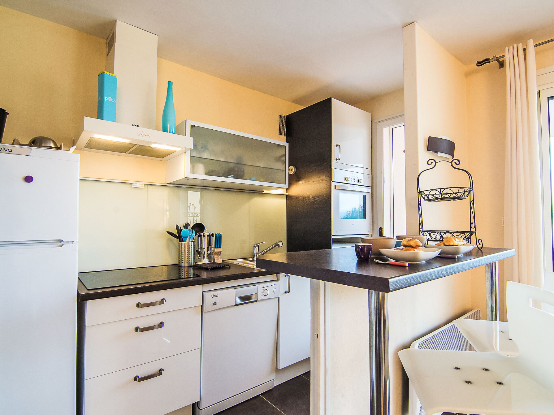 Appartement 2-kamers 40 m2 op de 3e verdieping. Volledig gerenoveerd in 2016, doelmatig en comfortabel ingericht: woon-/eetkamer met 1 2-pers divanbed, TV, Flatscreen TV en air-conditioning. Uitgang naar het terras. 1 kamer met 1 2-pers bed (140 cm, lengte 190 cm). Open keuken (oven, afwasmachine, 3 keramische glas kookplaten, broodrooster, waterkoker, magnetron, elektrische koffiemachine). Bad/WC. Elektrische verwarming, air-conditioning. Terras 14 m2, overdekt. Terrasmeubelen, barbecue. Beperkt uitzicht op zee. Ter beschikking: wasmachine, strijkijzer. Internet (Internet (WiFi), extra). Geen parkeerplaats. Rookmelders.