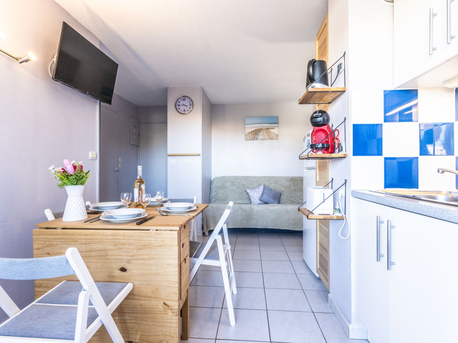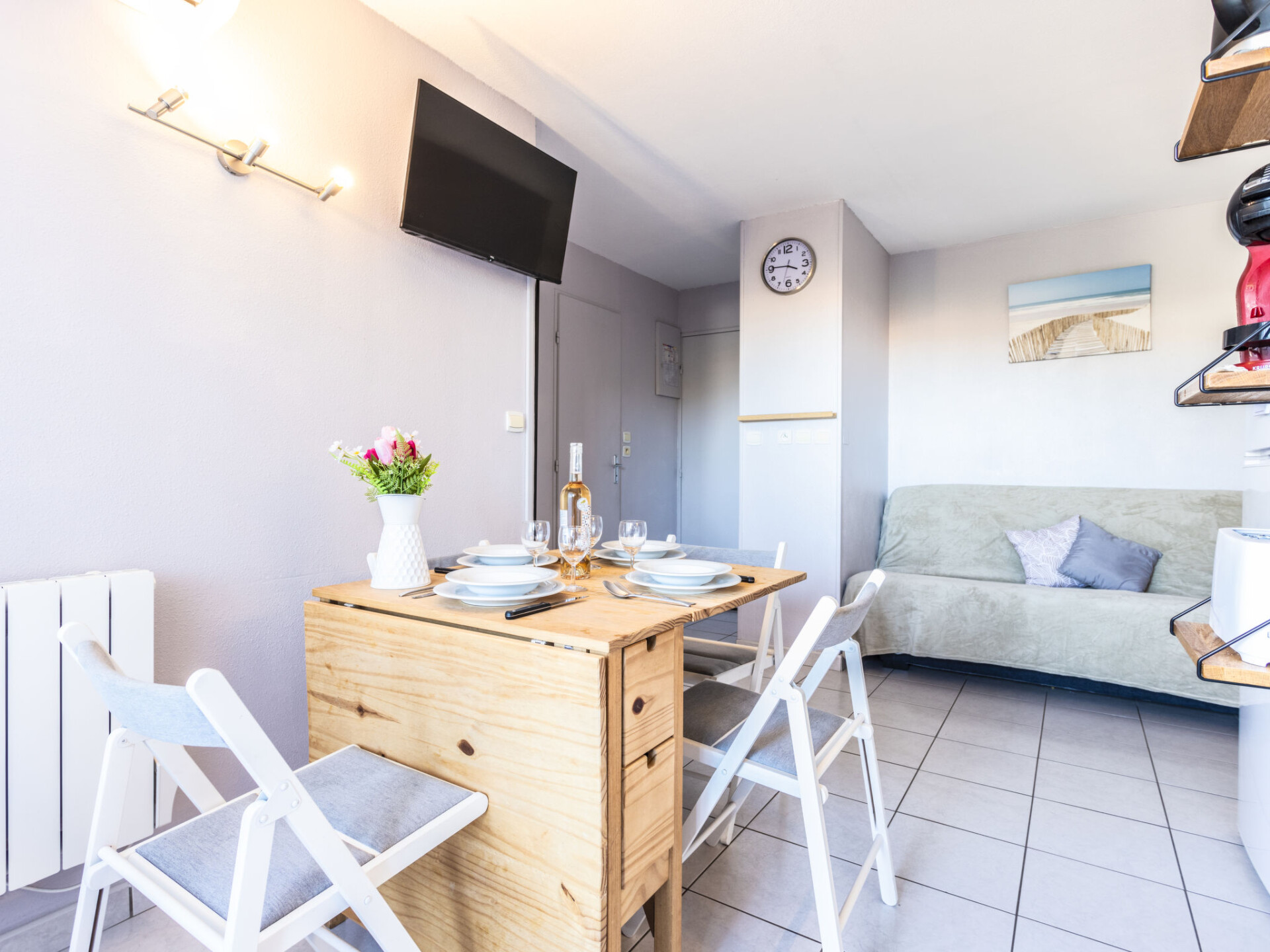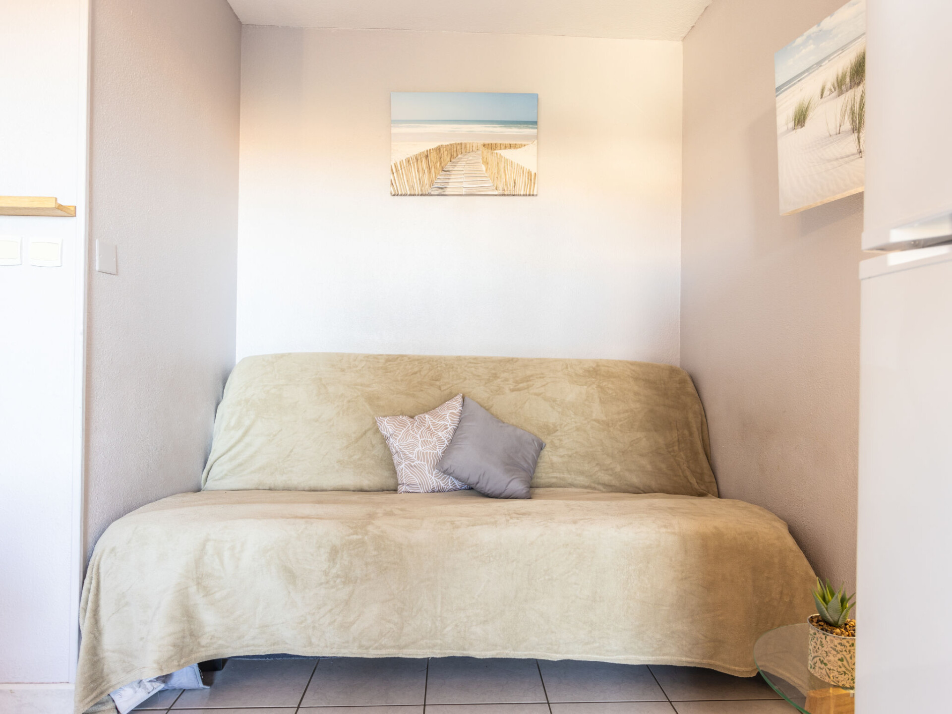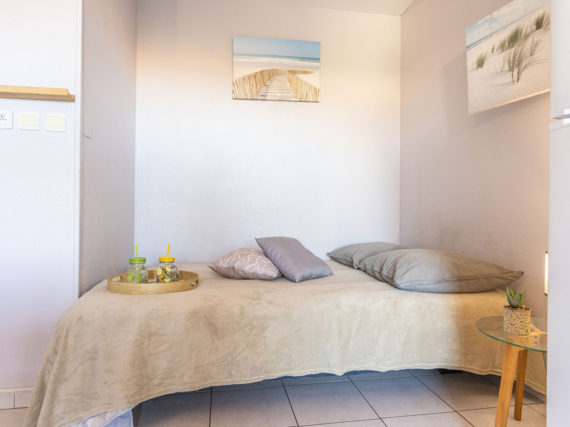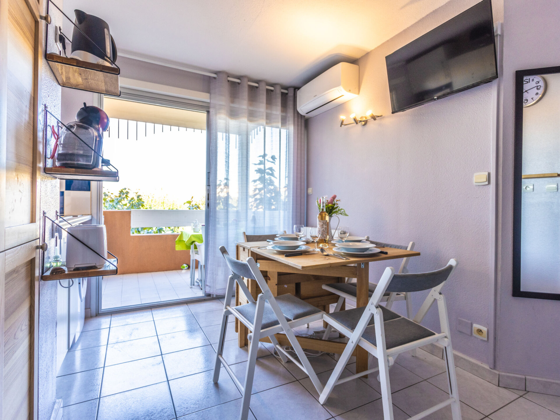 Appartement 2-kamers 23 m2 op de 1e verdieping, op het oosten gelegen. Woon-/eetkamer met 1 divanbed (140 cm, lengte 190 cm). 1 kamer met 1 bed (140 cm, lengte 190 cm). Kookhoek (2 keramische glas kookplaten, magnetron, elektrische koffiemachine). Douche/WC. Elektrische verwarming, air-conditioning. Terras 8 m2, op het oosten gelegen. Terrasmeubelen. Ter beschikking: wasmachine. Internet (Internet (WiFi), extra). Parkeerplaats nr. 19. Rookmelders. Aanbod door een particulier volgens art. 155, IV van CGI.