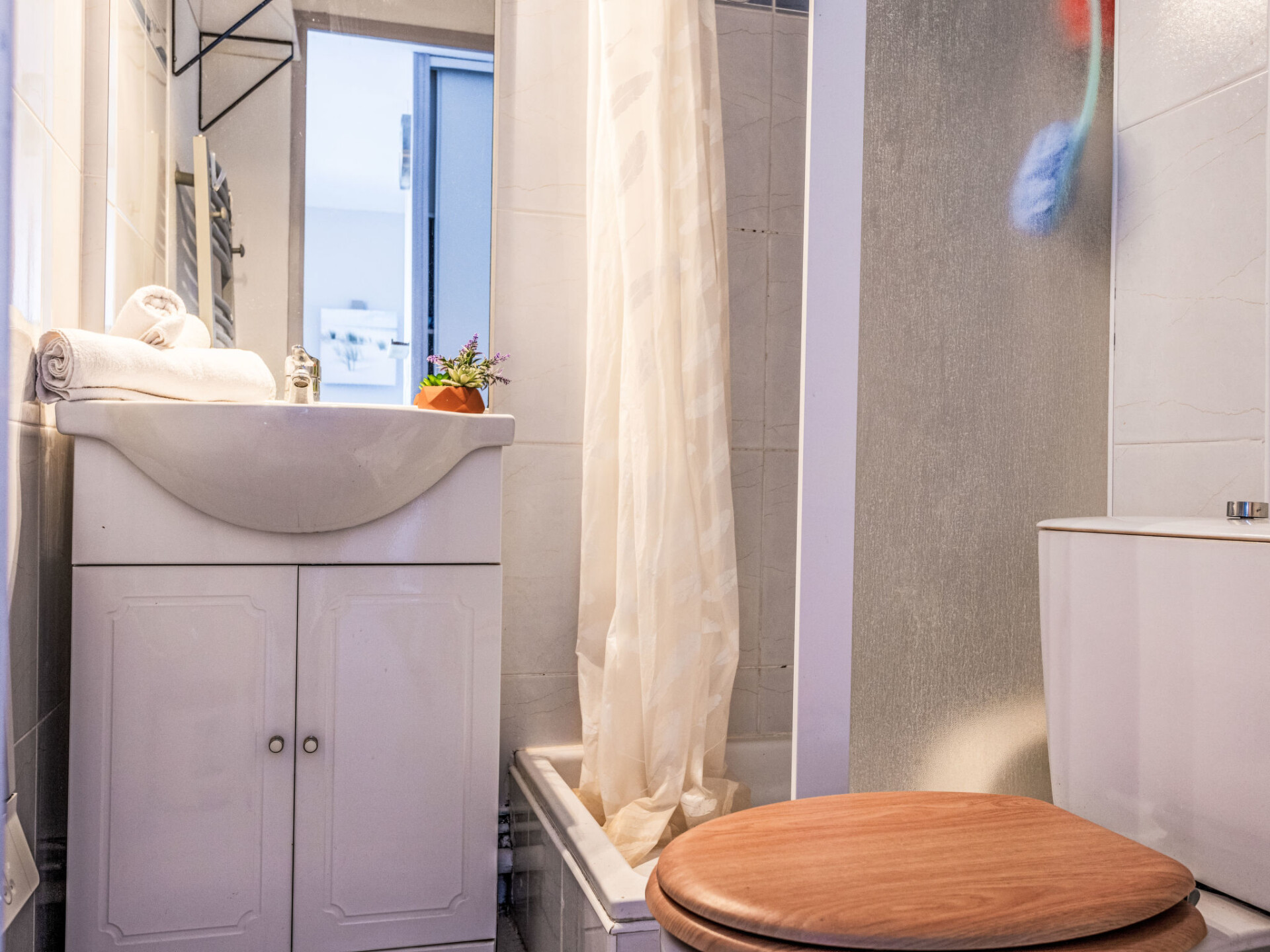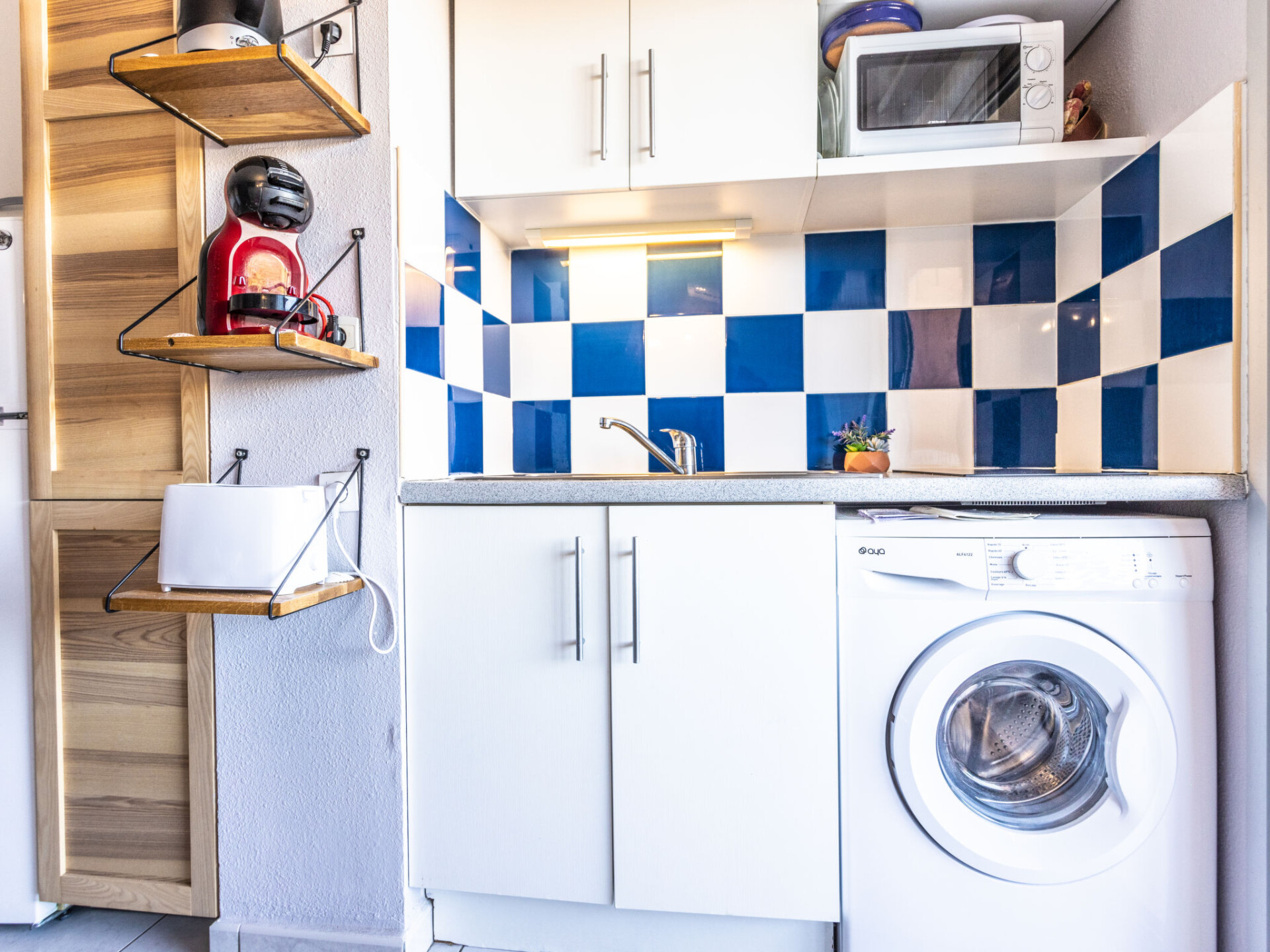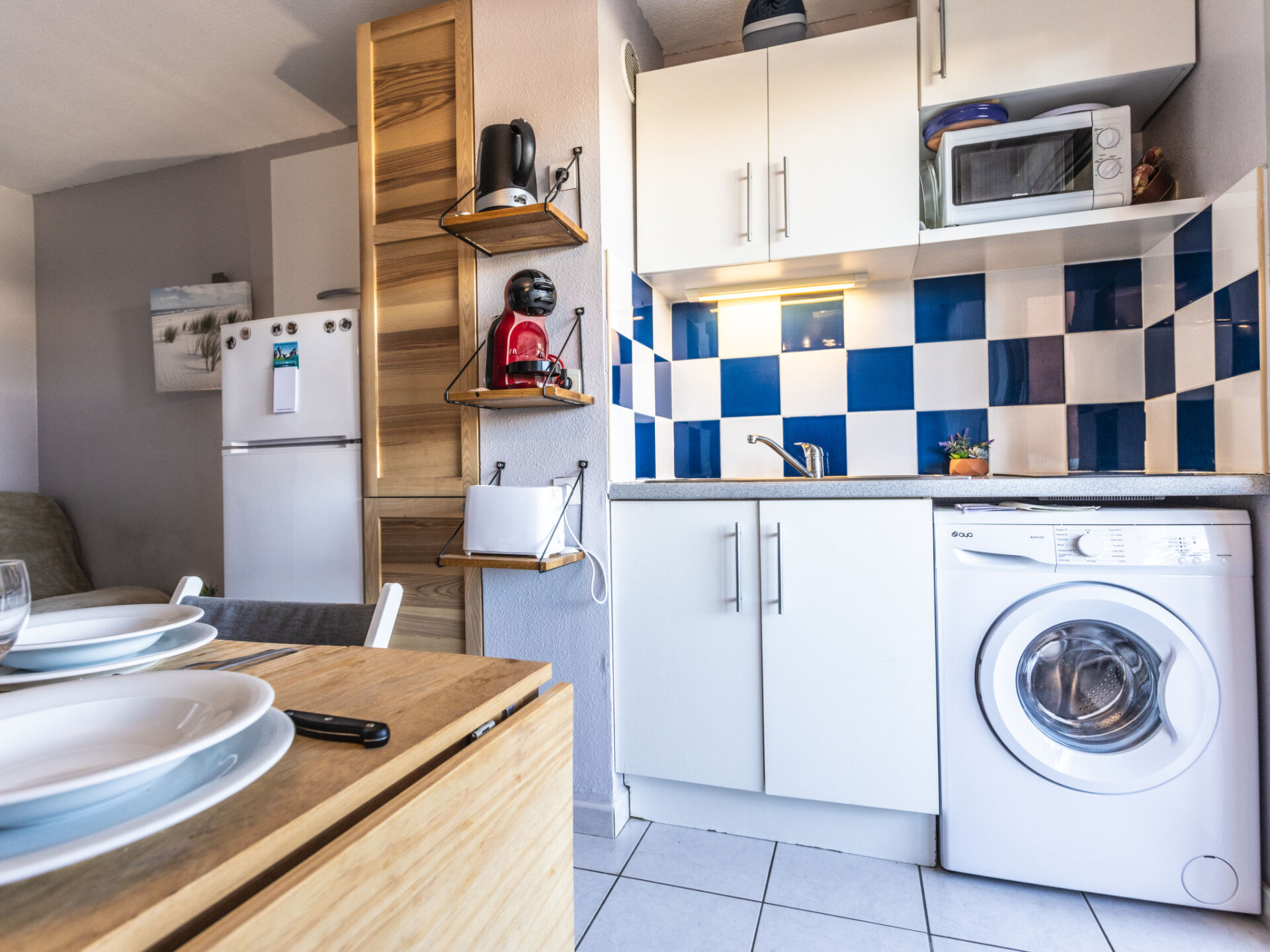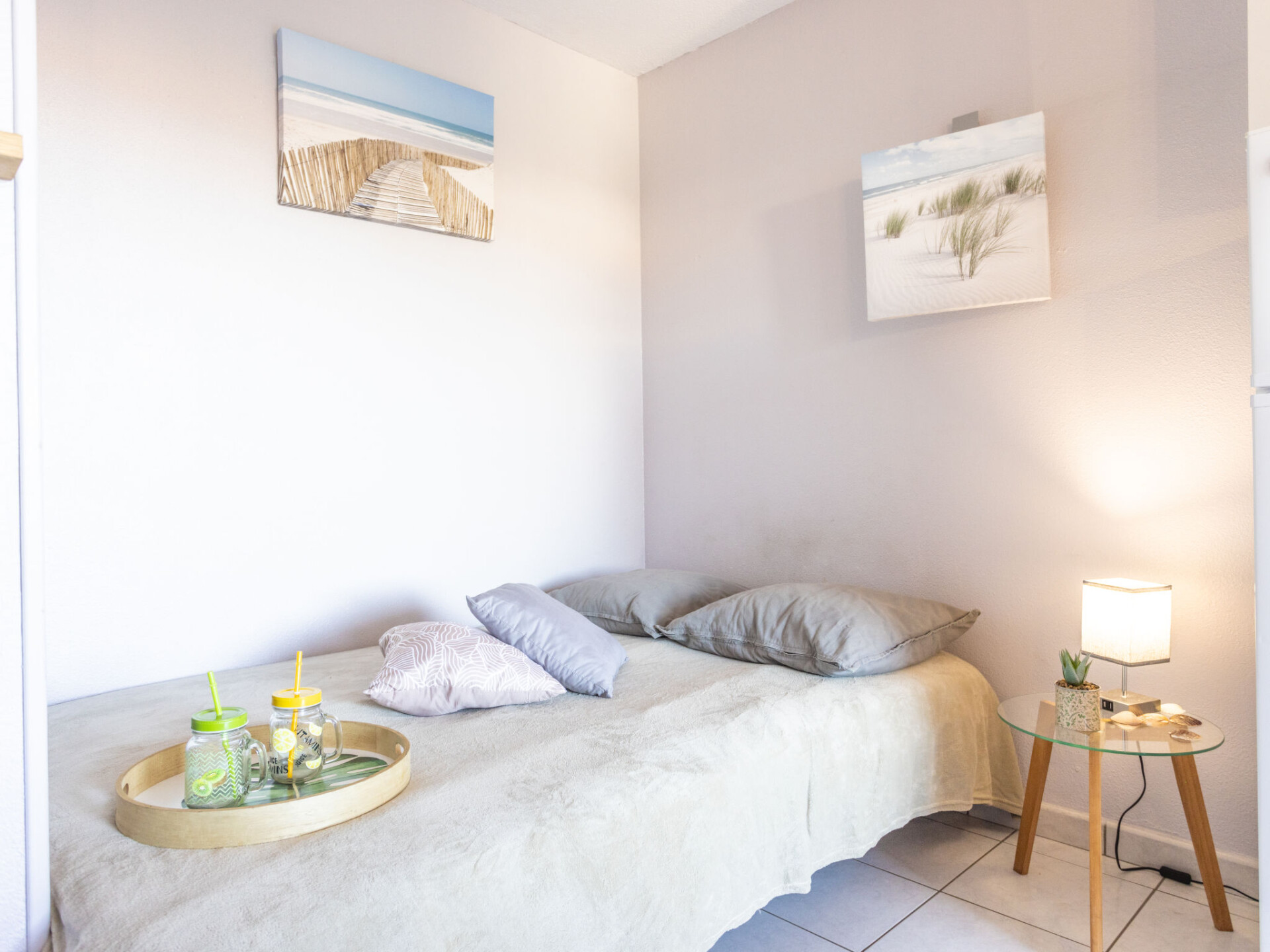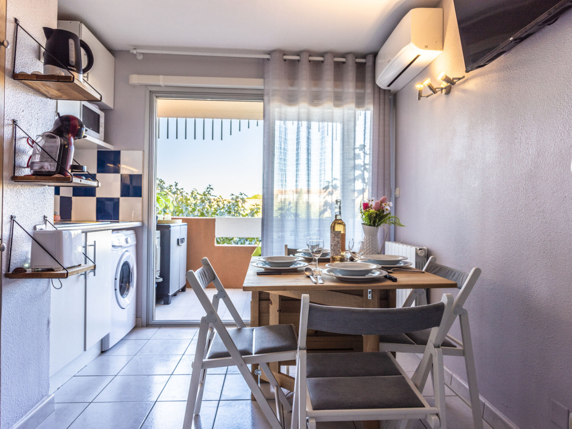 Appartement 2-kamers 23 m2 op de 1e verdieping, op het oosten gelegen. Woon-/eetkamer met 1 divanbed (140 cm, lengte 190 cm). 1 kamer met 1 bed (140 cm, lengte 190 cm). Kookhoek (2 keramische glas kookplaten, magnetron, elektrische koffiemachine). Douche/WC. Elektrische verwarming, air-conditioning. Terras 8 m2, op het oosten gelegen. Terrasmeubelen. Ter beschikking: wasmachine. Internet (Internet (WiFi), extra). Parkeerplaats nr. 19. Rookmelders. Aanbod door een particulier volgens art. 155, IV van CGI.