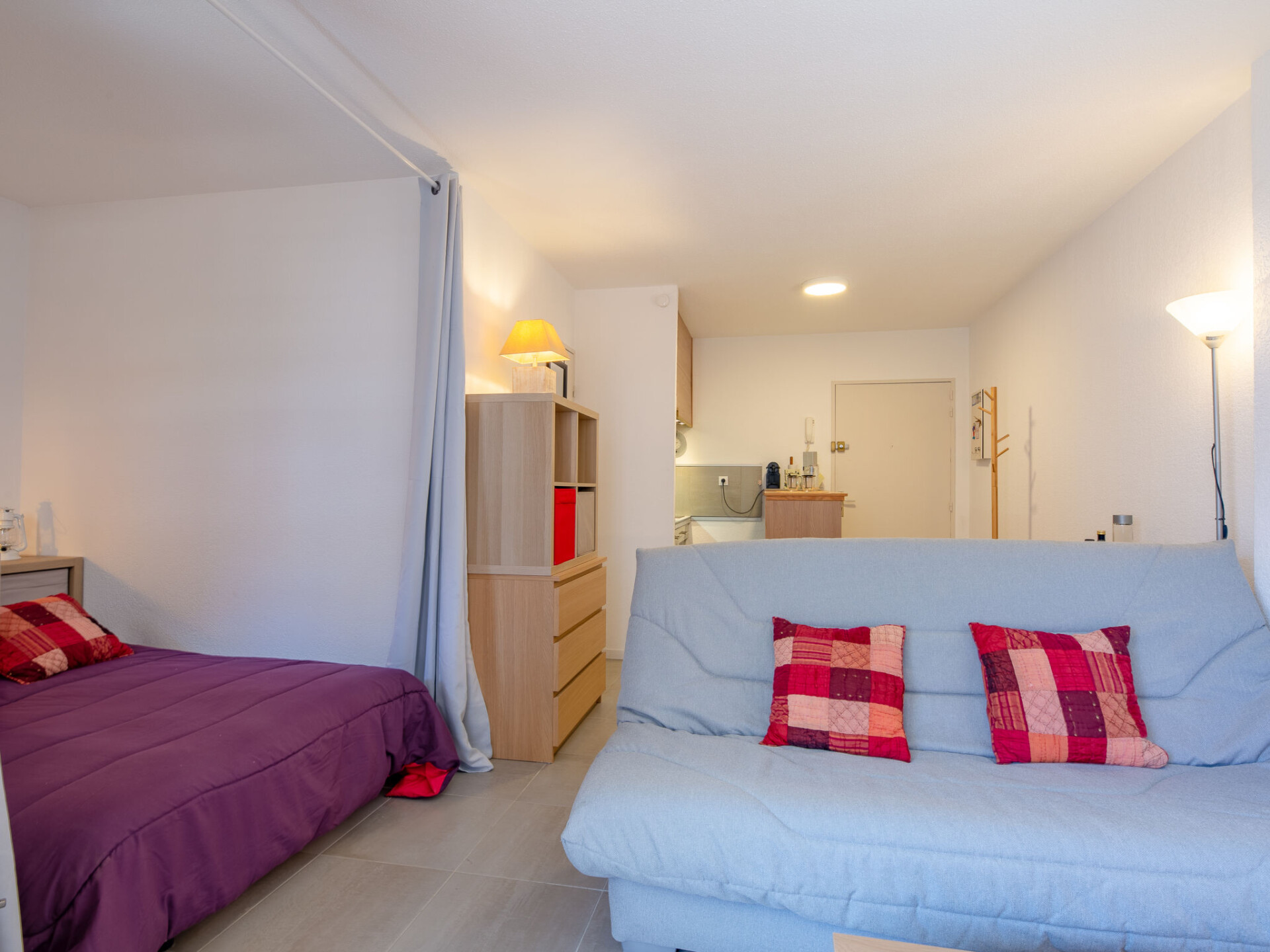 Studio 1-kamer 29 m2 op de 2e verdieping, op het oosten gelegen. Gezellig ingericht: woon-/slaapkamer met 1 2-pers divanbed (1 x 140 cm, lengte 190 cm), 1 2-pers bed (1 x 140 cm, lengte 190 cm), TV (Flatscreen TV). Uitgang naar het balkon. Open keuken in de hal (afwasmachine, 2 inductiekookplaten, broodrooster, waterkoker, elektrische koffiemachine, combimagnetron). Douche/WC. Air-conditioning, heteluchtverwarming. Balkon 7 m2, op het oosten gelegen. Balkonmeubilair. Uitzicht op de plaats. Ter beschikking: wasmachine, strijkijzer, haardroger. Internet (Internet (WiFi), gratis). Niet rokers woning, geen parkeerplaats. Maximaal 1 huisdier/hond toegestaan. Rookmelders. Aanbod door een particulier volgens art. 155, IV van CGI. 83115005221DP