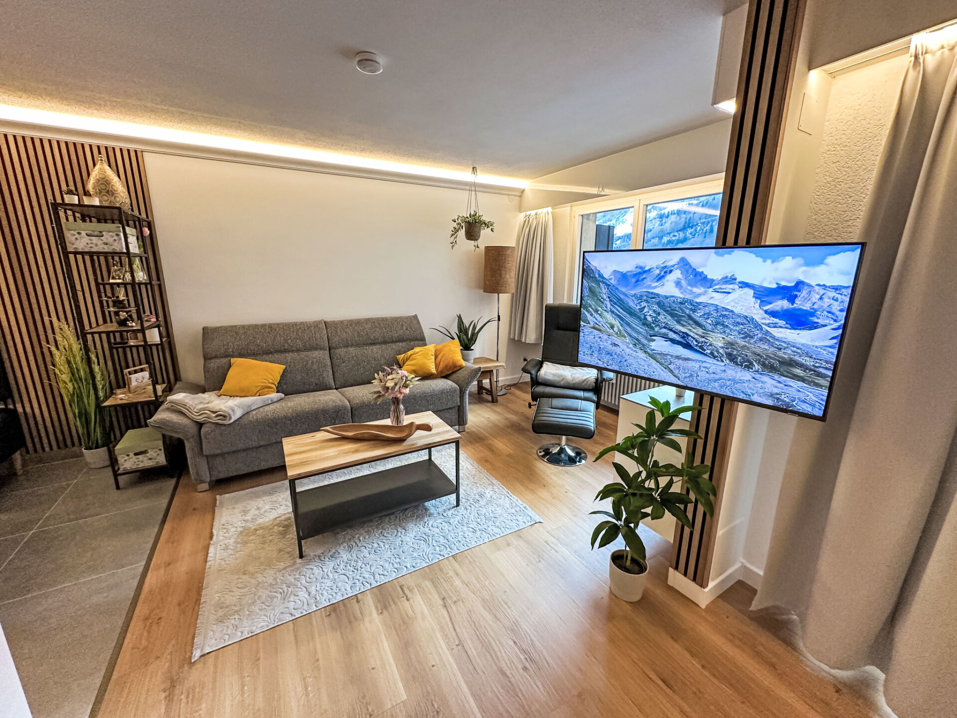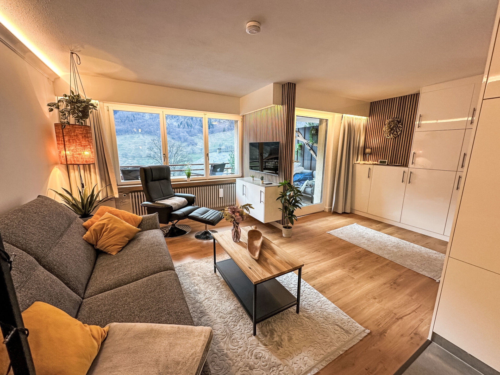 "Ringstrasse Apt 113", appartement 2-kamers op de 1e verdieping. Volledig gerenoveerd in 2024, zeer mooi en modern ingericht: woon-/slaapkamer met 1 2-pers divanbed (170 cm, lengte 210 cm), Digitale TV. Uitgang naar het balkon. Slaapnis met gordijn met 1 2-pers bed (180 cm, lengte 200 cm). Keuken (oven, afwasmachine, 4 inductiekookplaten, broodrooster, waterkoker, diepvriezer, elektrische koffiemachine, combimagnetron) met eettafel. Douche/WC. Vloerverwarming. Parketvloeren. Balkon. Balkonmeubilair. Mooi uitzicht op de bergen en het dal. Ter beschikking: kluis, haardroger. Internet (WiFi, gratis, Bandbreedte: 400 Mbit/s). Niet rokers woning.