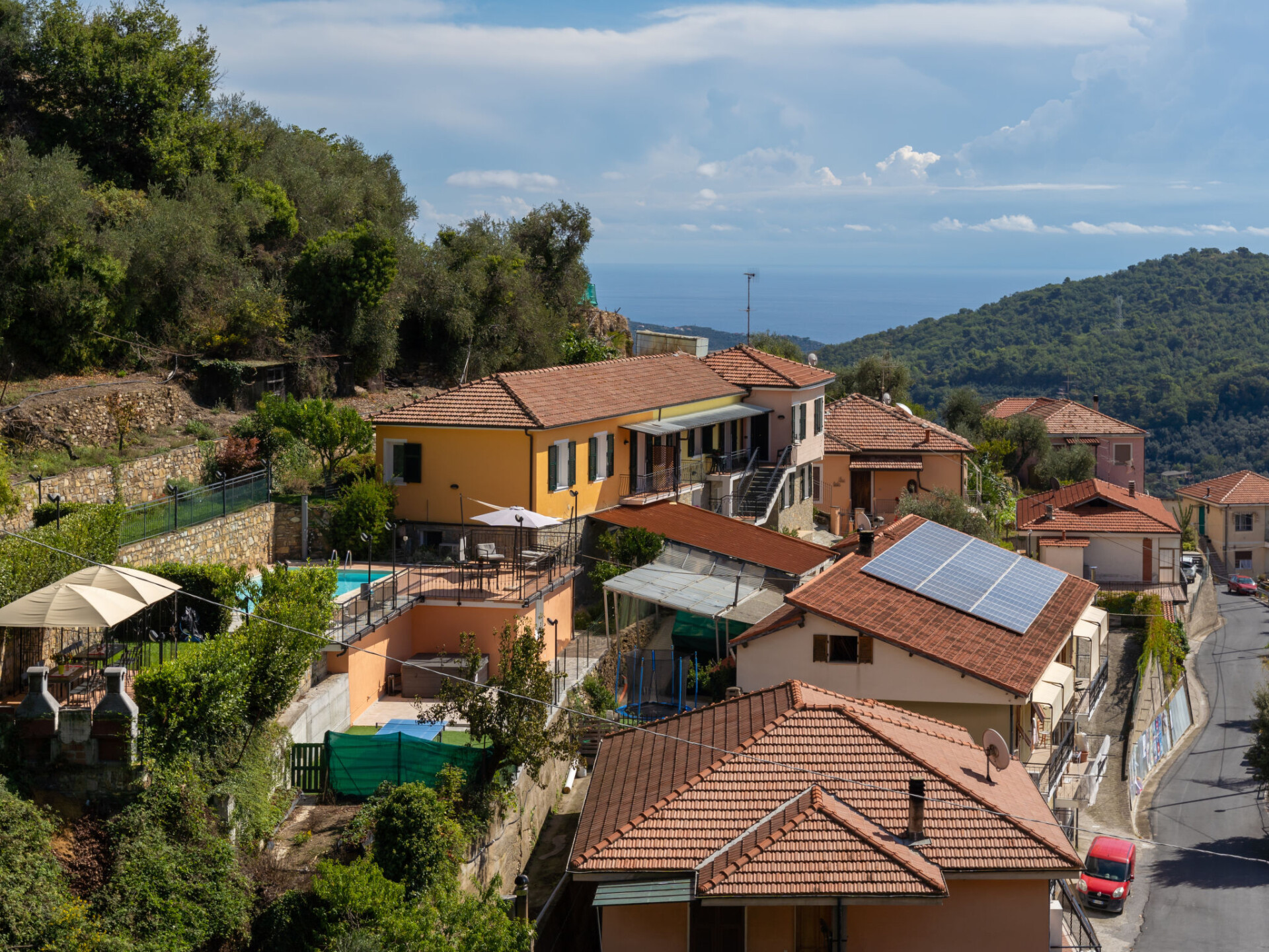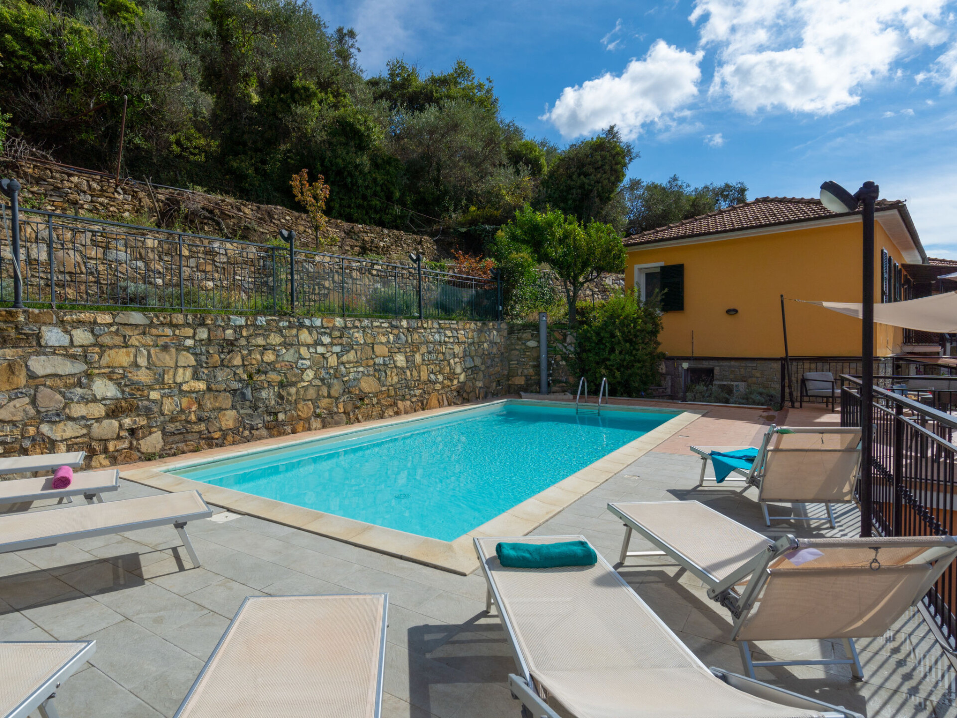 Kindvriendelijke, mooi residentie "Agriturismo Ca' di Nonni", 400 m boven zeeniveau, van 2 verdiepingen, omgeven door bomen en wijngaarden. 4 appartementen in de woning. 100 m van het centrum van Pietrabruna, aan de rand van de plaats, 10 km van het centrum van San Lorenzo al Mare, 16 km van het centrum van Imperia, verhoogde ligging tegen een helling, 9.5 km van zee, te midden van groen. Voor medegebruik: mooie, verzorgde tuin op verschillende niveaus, 1.000 m2 met gazon en planten, ligweide, openluchtzwembad (10 x 5 m, 120 cm diepte, seizoensgebonden beschikbaarheid: 01.Mei. - 01.Okt.). Buitendouche, tafeltennis, patio, prieel, tuinmeubelen, barbecue, kinderspeelplaats (glijbaan, schommel), onderhoud zwembad door de eigenaar/tuinman. In het complex: salon met TV, fitnessruimte, tafelvoetbal, bergruimte voor fietsen, zonneterras, wasmachine (voor medegebruik), fietsverhuur. 20 m lange steile, smalle toegangsweg. Trappenweg naar het huis. Openbare parkeerplaatsen 50 m in de straat. Winkel, levensmiddelenwinkel 200 m, supermarkt 10 km, winkelcentrum 10 km, restaurant, bar, bakkerij 300 m, café 200 m, bushalte 150 m, zandstrand "San Lorenzo al Mare" 10 km, stenenstrand 10 km, meer (zwemmen) "Laghetti Torre Paponi" 5 km. Wandelroutes 10 m vanaf het huis. Attracties in de buurt: Pista ciclabile lungo mare 10 km, Museo dell´olio Imperia 18 km, Lavendeldestilation in Pietrabruna. Wandelgebied Monte Faudo (1149 m) Mountainbike Trails 5 km, Monte Follia 2 km. De eigenaar accepteert geen jeugdgroepen. Laden en lossen van de baggage is mogelijk bij het huis.