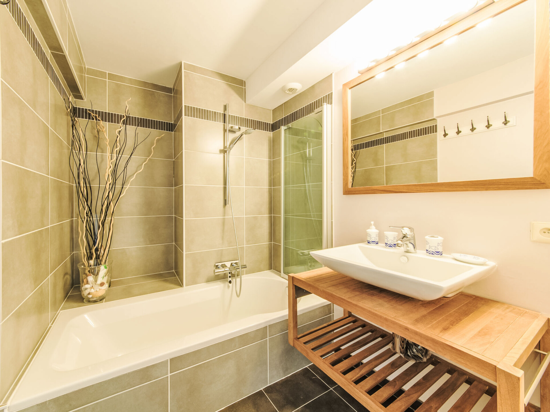 "Sea Garden ground floor with garden", appartement 3-kamers op de begane grond. Comfortabel en gezellig ingericht: hal met aparte WC. Woon-/eetkamer met TV, internationale TV-zenders, Flatscreen TV, radio, CD-speler, DVD, homecinema en petroleumkachel. 2 2-pers. kamers, elke kamer heeft 1 2-pers bed (160 cm, lengte 200 cm). Uitgang naar de tuin, naar het terras. Kookhoek (afwasmachine, 4 keramische glas kookplaten, broodrooster, waterkoker, elektrische koffiemachine, combimagnetron). Bad/douche. Elektrische verwarming, boiler (100 liter). Terras 18 m2. Terrasmeubelen. Ter beschikking: haardroger. Internet (WiFi, gratis). Rookvrij huis. Maximaal 1 huisdier/hond toegestaan. Rookmelders, brandblusser. LD378636