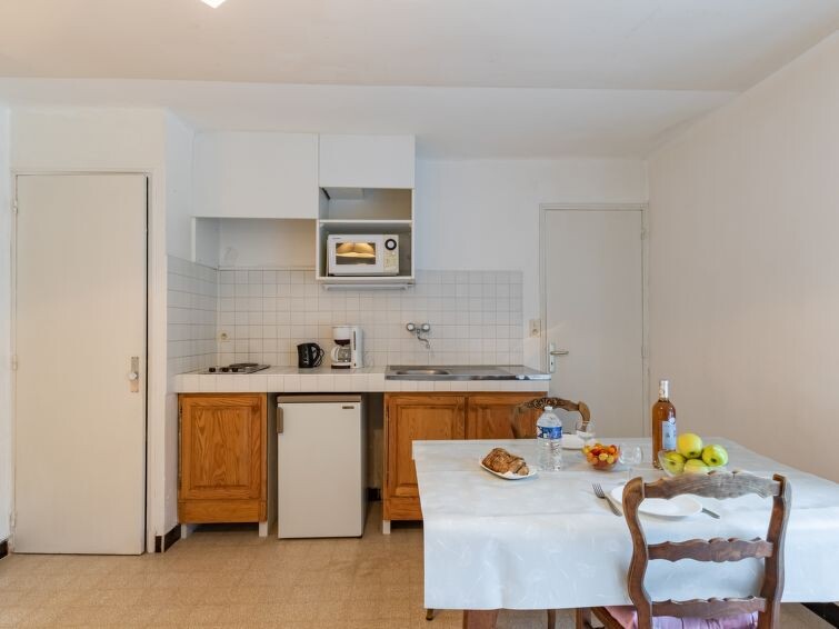 Appartement 1-kamer 26 m2, op de begane grond. Eenvoudig en doelmatig ingericht: woon-/eetkamer met 1 divanbed (140 cm, lengte 190 cm), TV (Flatscreen TV). Uitgang naar het terras. Kookhoek (2-pits kookplaat, waterkoker, magnetron, elektrische koffiemachine). Douche, aparte WC. Geen verwarmingsmogelijkheid. Terras 5 m2, overdekt, op het noordwesten gelegen. Terrasmeubelen. Ter beschikking: Internet (Internet (WiFi), extra). Parkeerplaats. Niet geschikt voor kinderen onder 3 jaar. TV alleen FR. 83112000014AI