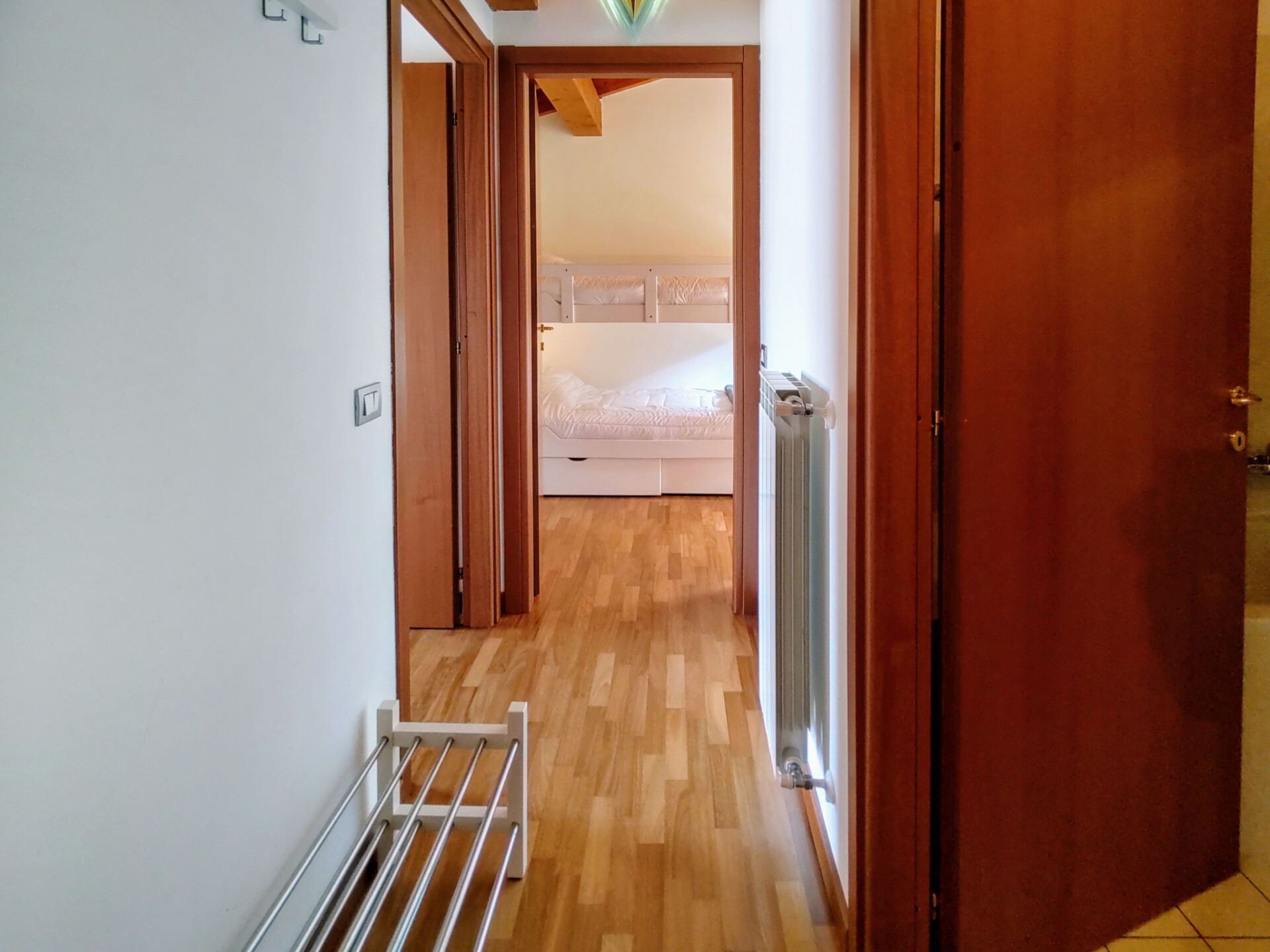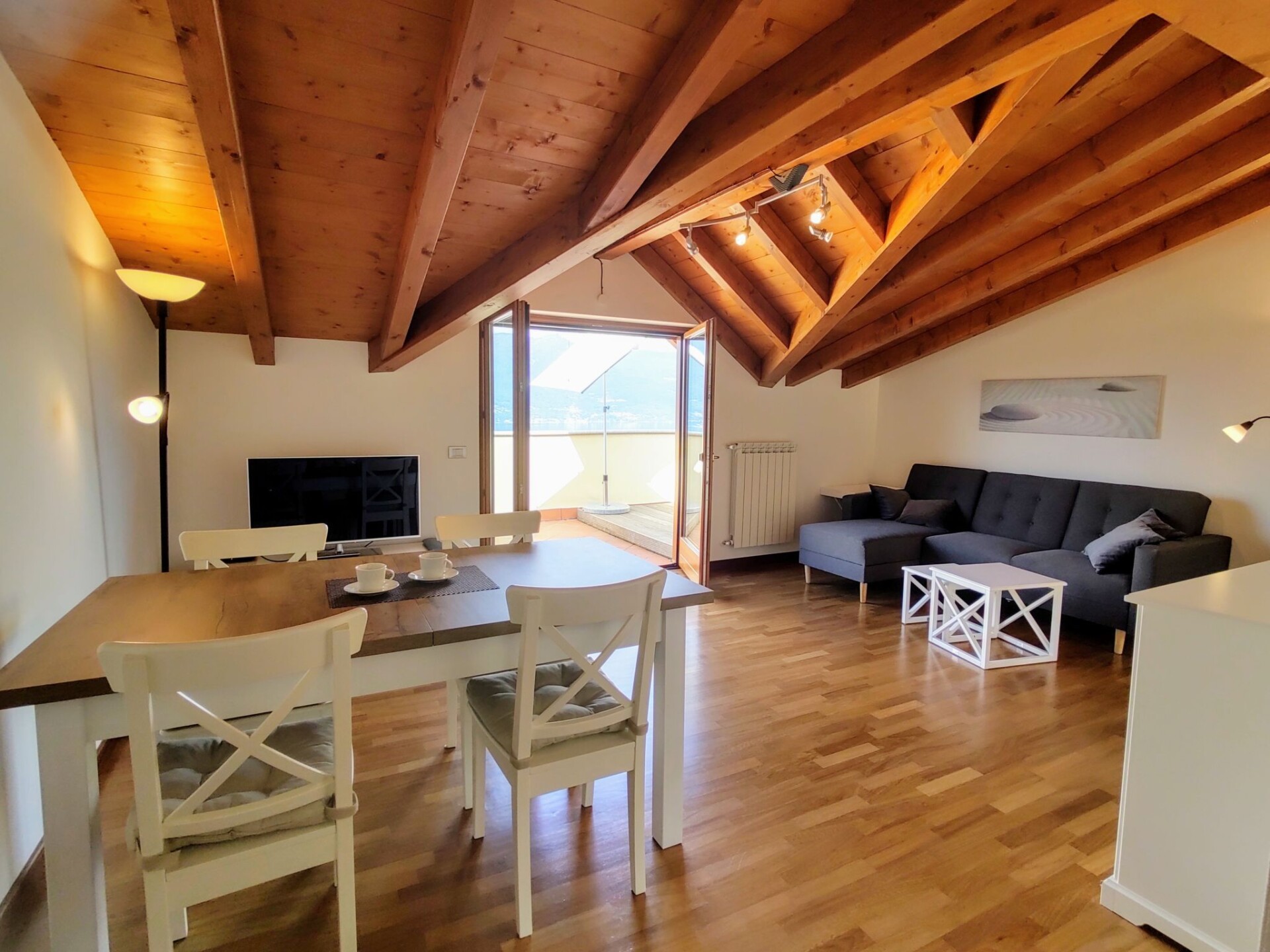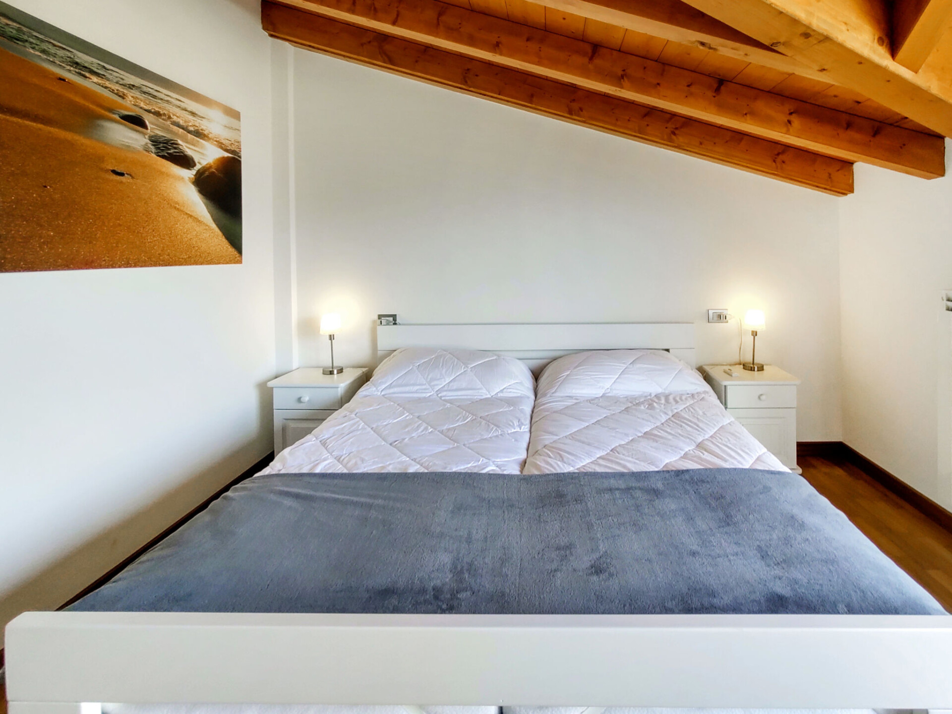Appartement 3-kamers 75 m2, op de bovenste verdieping, op het westen gelegen. Licht, gedeeltelijk afgeschuinde daken, modern en stijlvol ingericht: woon-/eetkamer met eettafel en Sat-TV. Uitgang naar het balkon. 1 2-pers. kamer. Uitgang naar het balkon. 1 kamer met 1 x 2 stapelbedden. Uitgang naar het balkon. Open keuken (oven, afwasmachine, 4 keramische glas kookplaten, broodrooster, waterkoker, magnetron, elektrische koffiemachine). Bad/WC, douche/WC. Gas-verwarming. Parketvloeren. Groot balkon 30 m2, klein balkon. Balkonmeubilair, ligstoelen (2). Zeer mooi uitzicht op het meer. Ter beschikking: wasmachine, kinderstoel, kinderbed. Internet (WiFi, gratis). Parkeerplaats (1 Auto). Niet rokers woning. Maximaal 1 klein huisdier/hond toegestaan. Privé ingang. IT012114C242WP8TXP