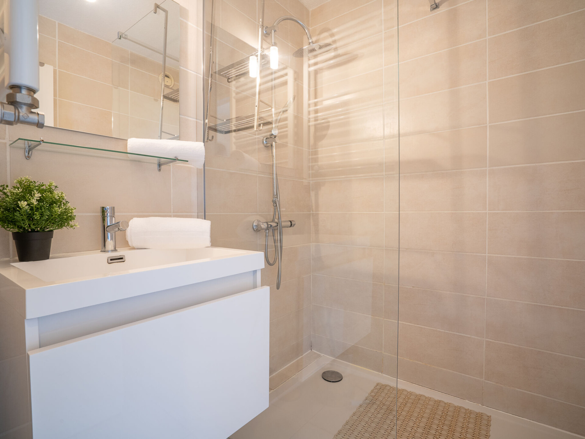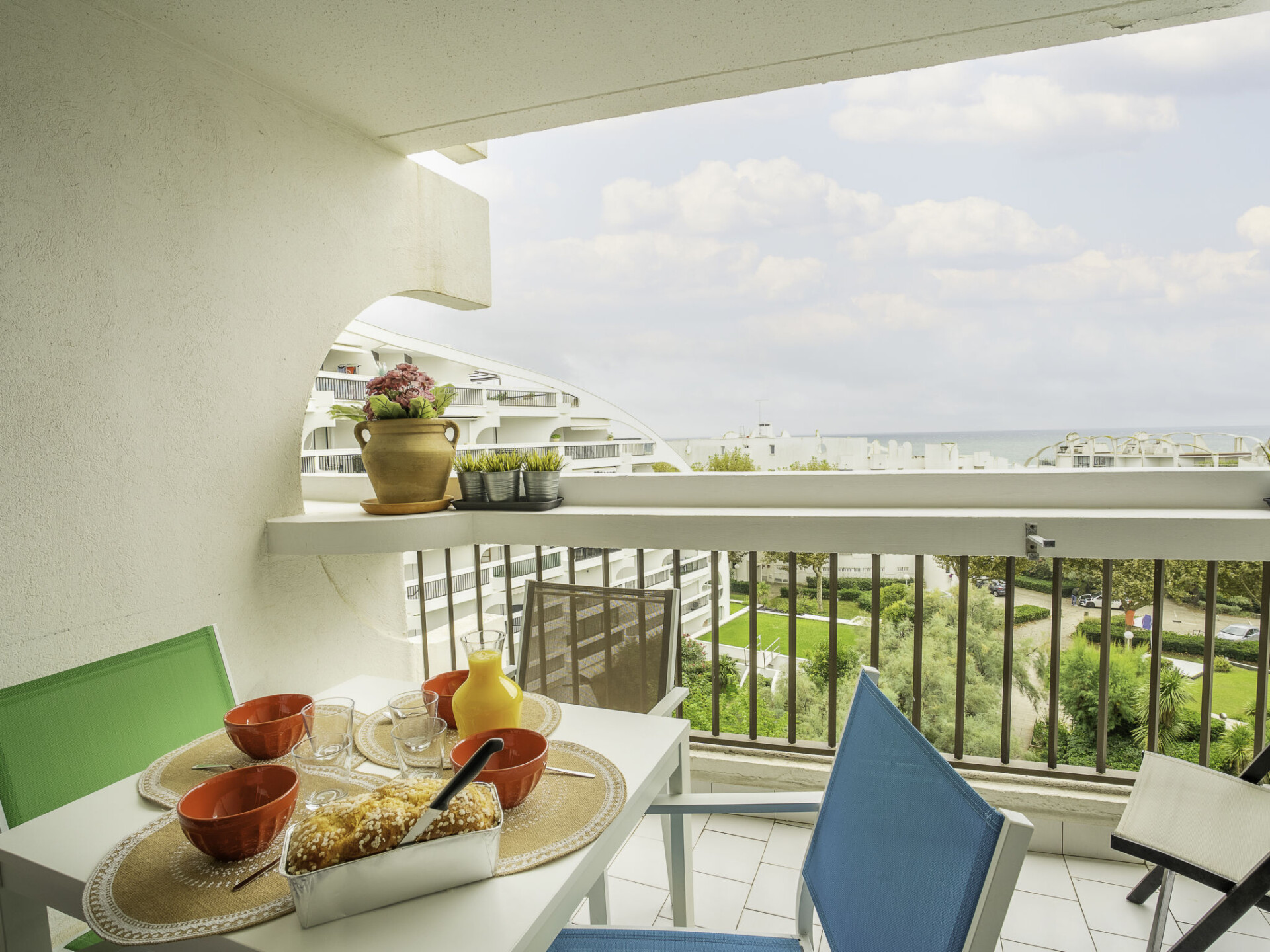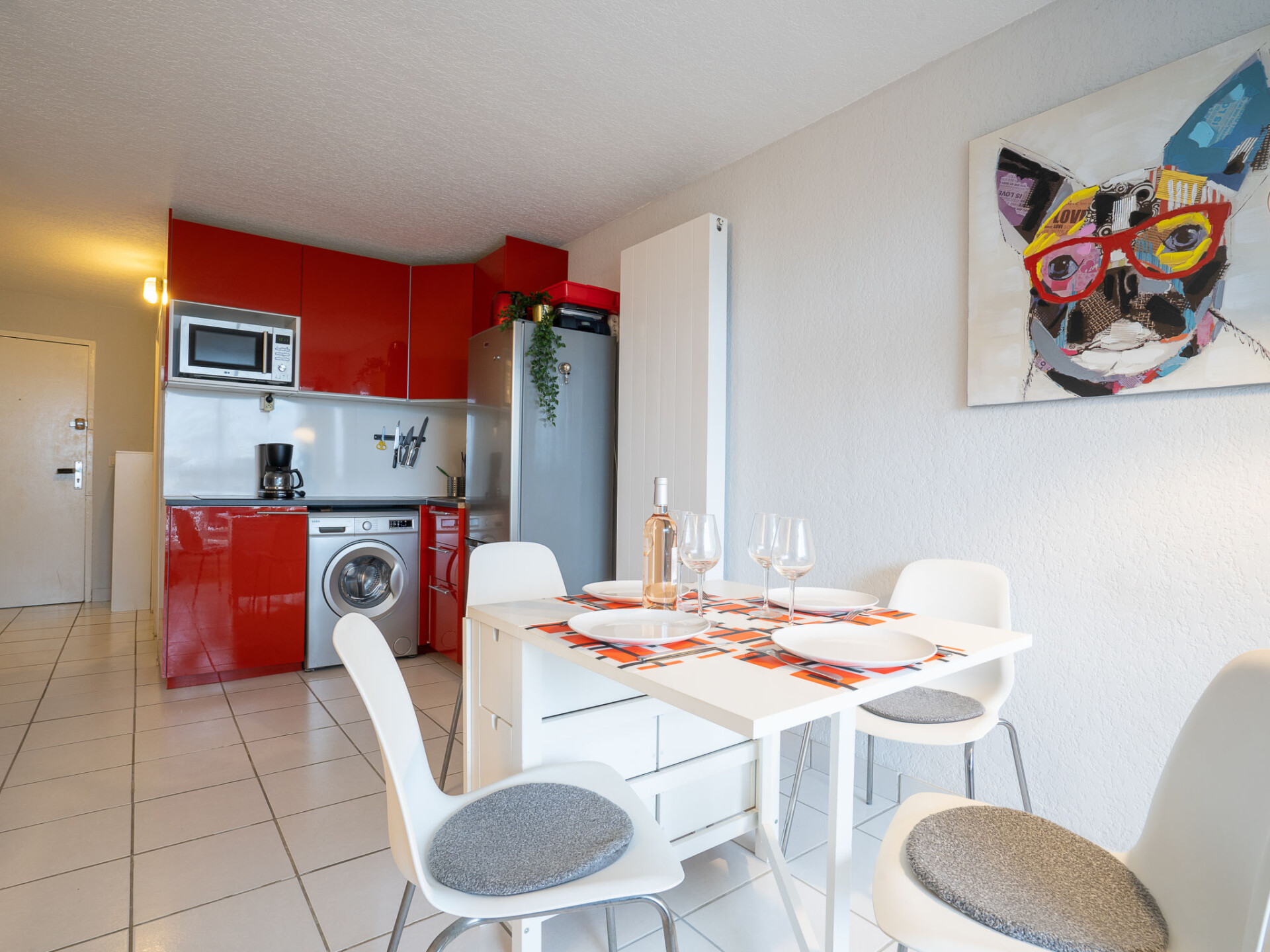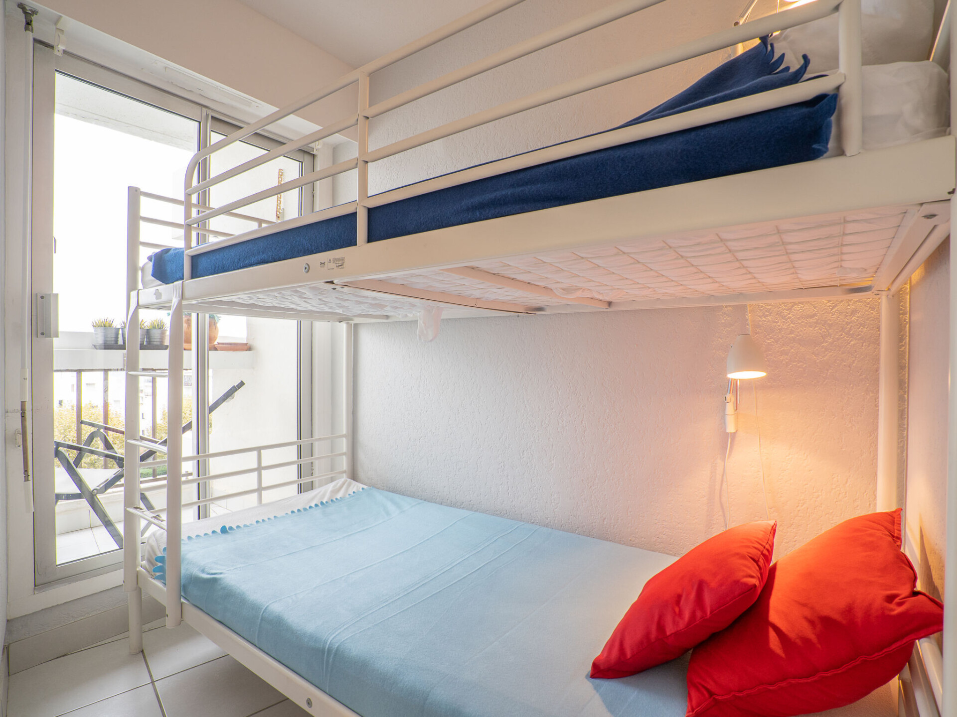 Studio 1-kamer 27 m2 op de 5e verdieping. Volledig gerenoveerd in 2016, comfortabel en mooi ingericht: woon-/eetkamer met 1 2-pers kastbed (140 cm, lengte 190 cm), TV (Flatscreen TV). Cabine met 1 x 2 stapelbedden (90 cm, lengte 190 cm). Kookhoek (2 keramische glas kookplaten, broodrooster, waterkoker, diepvriezer, elektrische koffiemachine, combimagnetron). Douche, aparte WC. Verwarming. Terras 10 m2, op het zuiden gelegen. Terrasmeubelen. Uitzicht in de verte op zee. Ter beschikking: wasmachine. Internet (Internet (WiFi), extra). Parkeerplaats. Rookmelders. In plaats van een afgesloten slaapkamer bevinden sommige slaapgedeeltes zich in een open ruimte (galerij, nis, etc.).