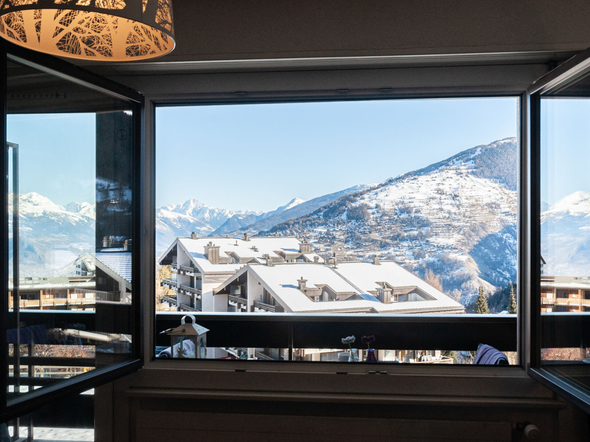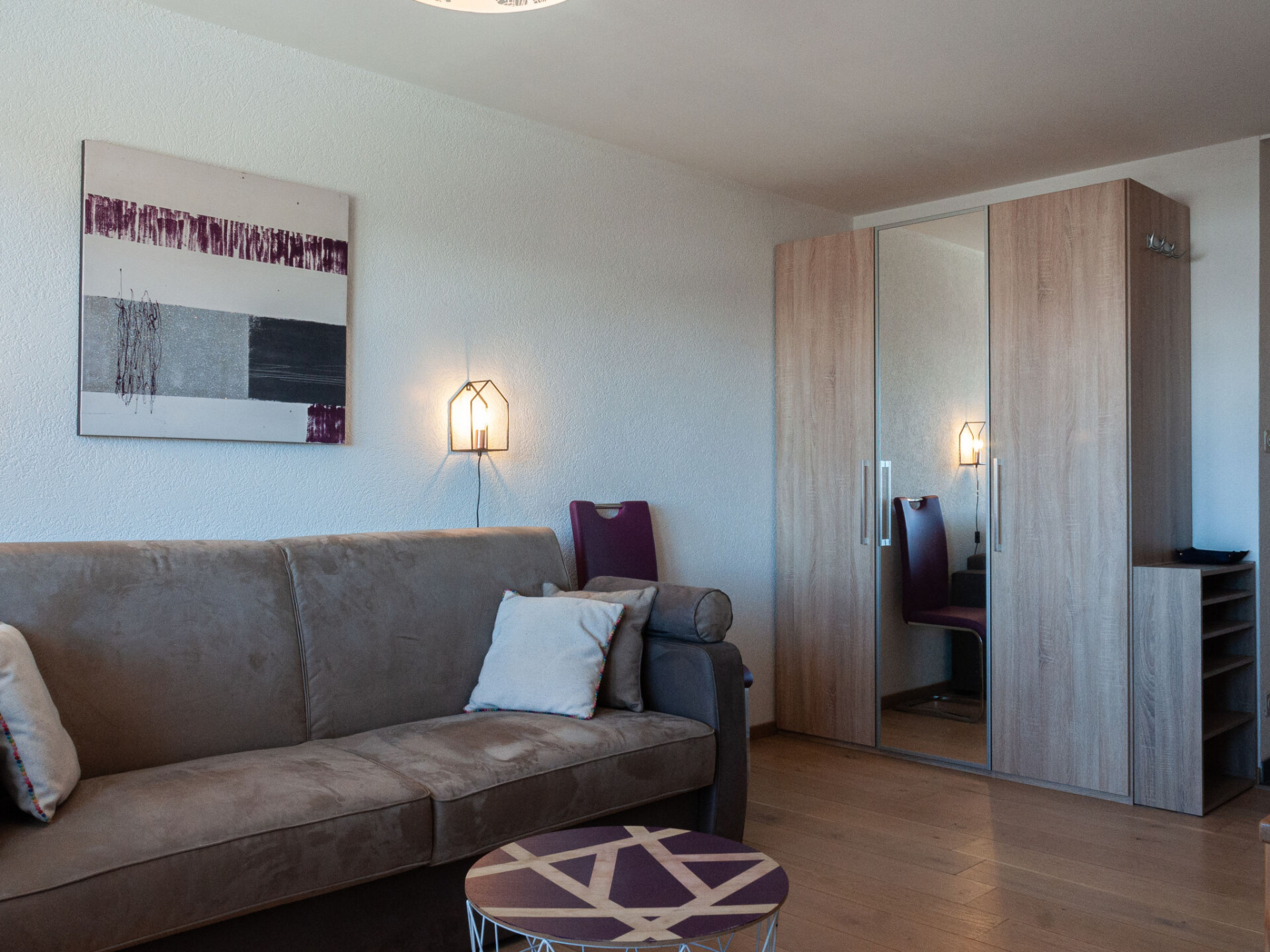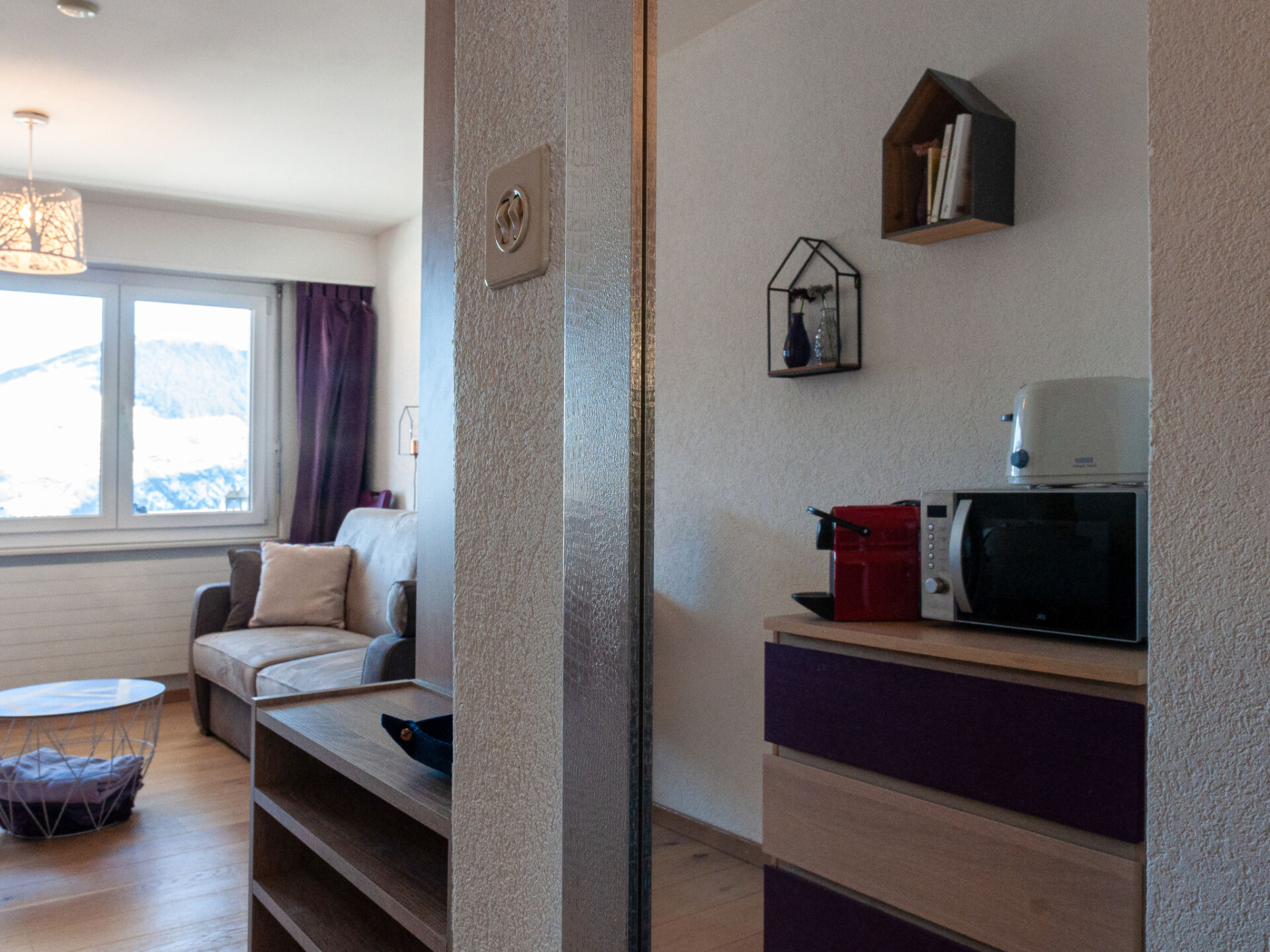 "Valaisia 24A", appartement 1-kamer 25 m2 op de 2e verdieping. Volledig gerenoveerd in 2017, mooi en modern ingericht: woon-/slaapkamer met 1 2-pers divanbed (1 x 160 cm, lengte 190 cm), Kabel-TV. Uitgang naar het balkon, op het noorden en op het oosten. Keuken in de hal (2-pits kookplaat, broodrooster, waterkoker, magnetron, elektrische koffiemachine, pads voor de koffiemachine (Nespresso) extra, raclette oven, fondue Set (kaas)). Douche/WC. Balkonmeubilair. Zeer mooi uitzicht op het dal. Ter beschikking: haardroger. Internet (WiFi, gratis). Niet rokers woning. 06.01.24