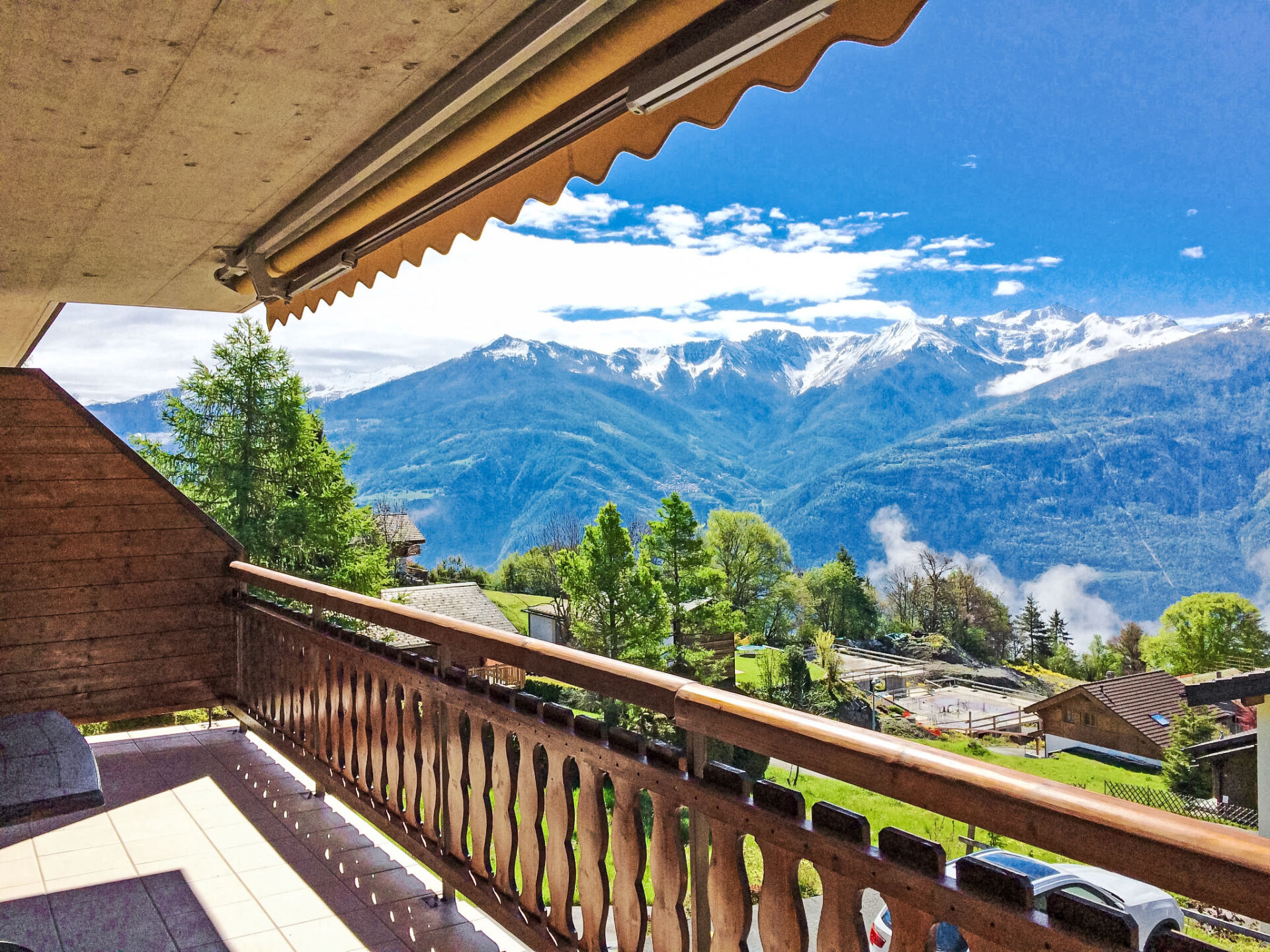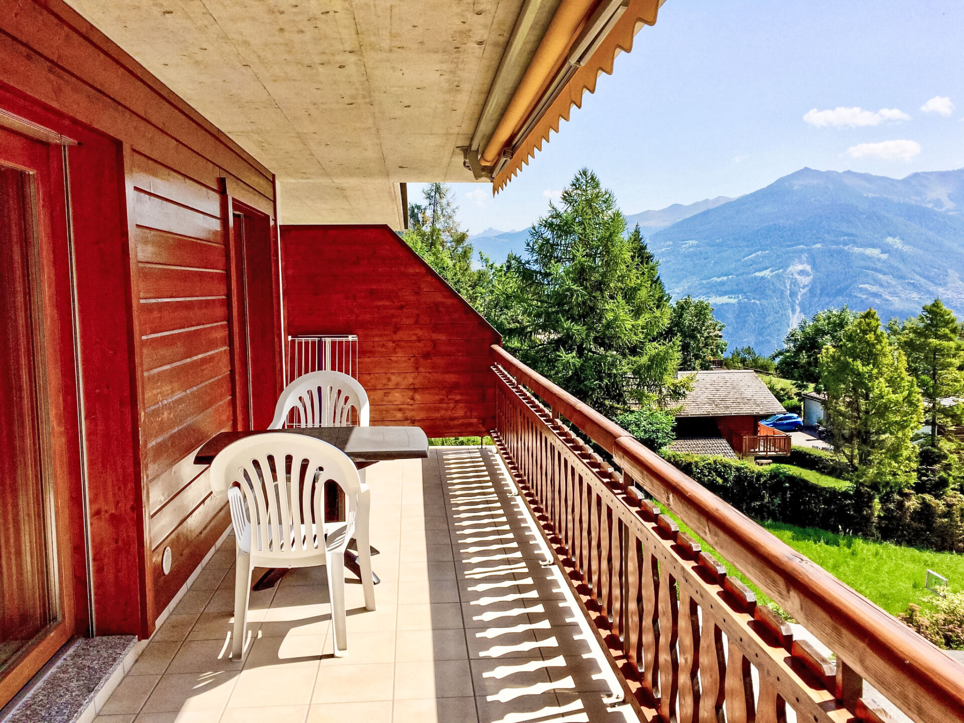 "Viognier 5", appartement 2-kamers 60 m2 op de 2e verdieping, op het zuiden gelegen. Comfortabel en modern ingericht: hal. Woon-/eetkamer met 1 divanbed (140 cm, lengte 200 cm), open haard en Kabel-TV (Flatscreen TV). Uitgang naar het balkon, op het zuiden. 1 kamer met 1 2-pers bed (180 cm, lengte 200 cm). Open keuken (afwasmachine, 4 keramische glas kookplaten, magnetron, elektrische koffiemachine, pads voor de koffiemachine (Nespresso) extra, raclette oven, fondue Set (chinese, kaas)). Douche/WC. Vloerverwarming. Groot balkon 17 m2. Balkonmeubilair, ligstoelen (4). Zeer mooi uitzicht op de bergen. Ter beschikking: Internet (Internet (WiFi), gratis). Parkeerplaats (2 Auto's). Niet rokers woning.