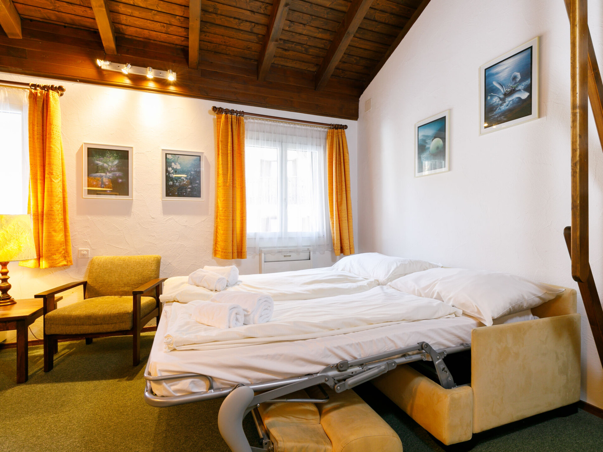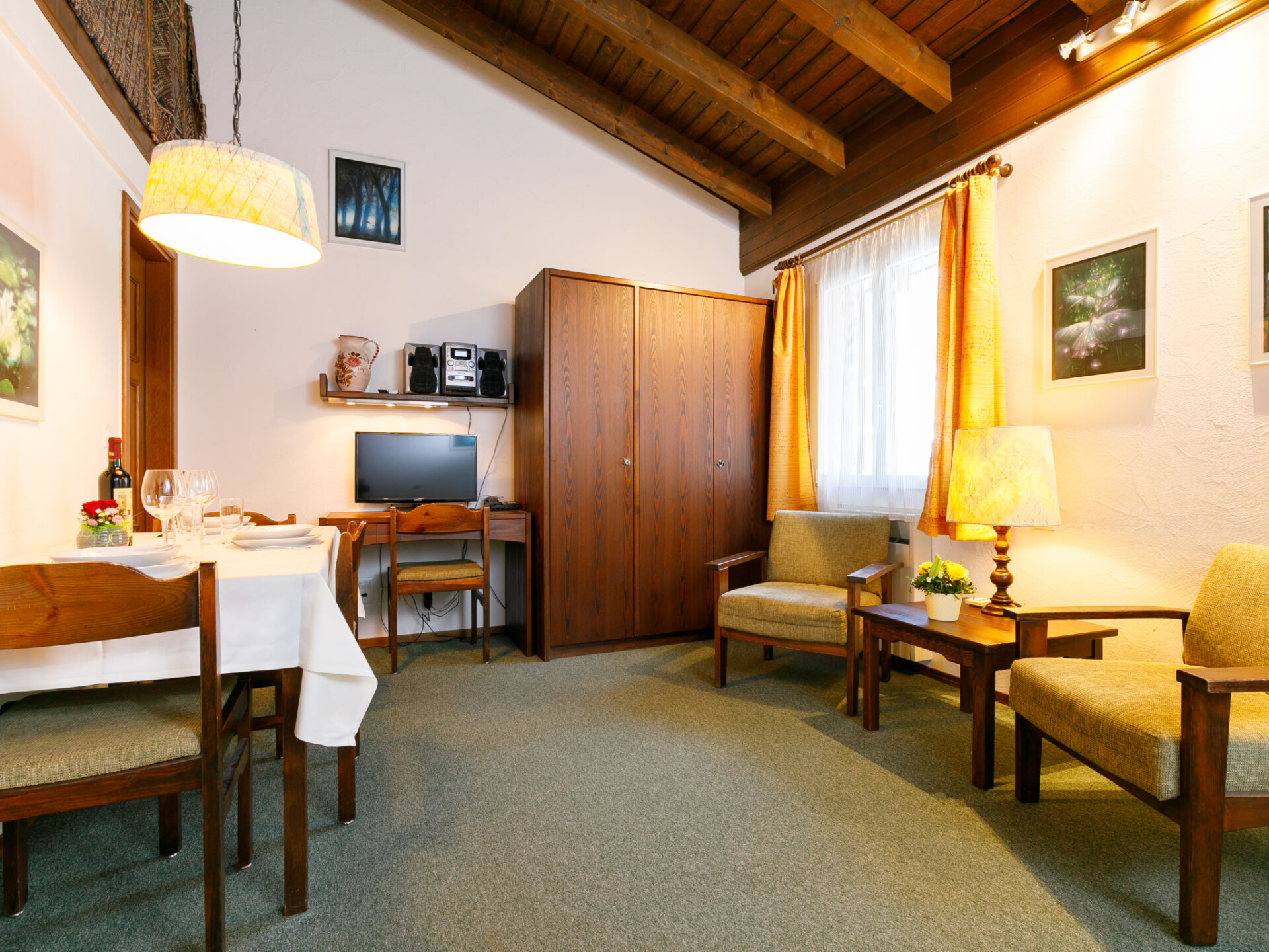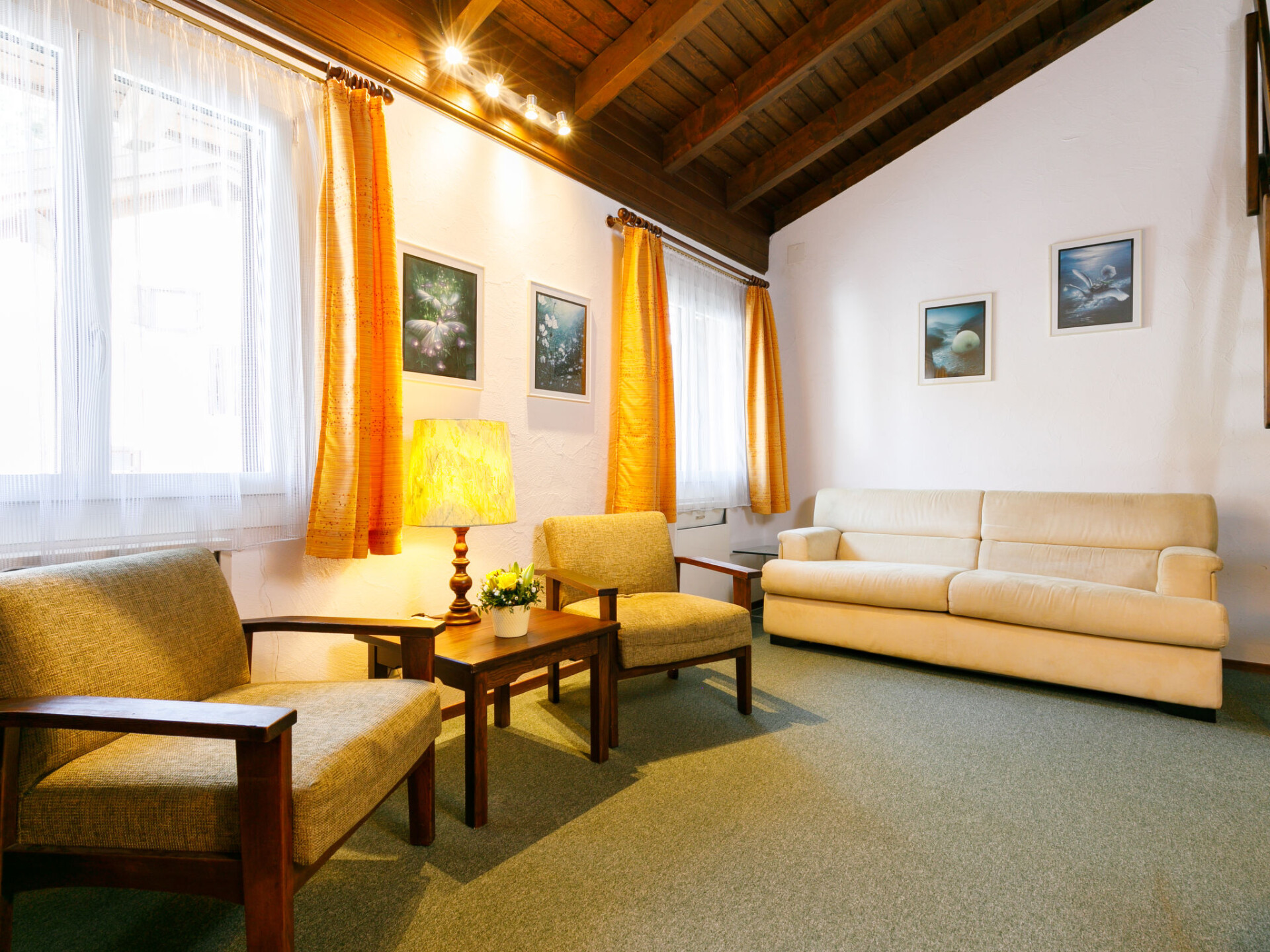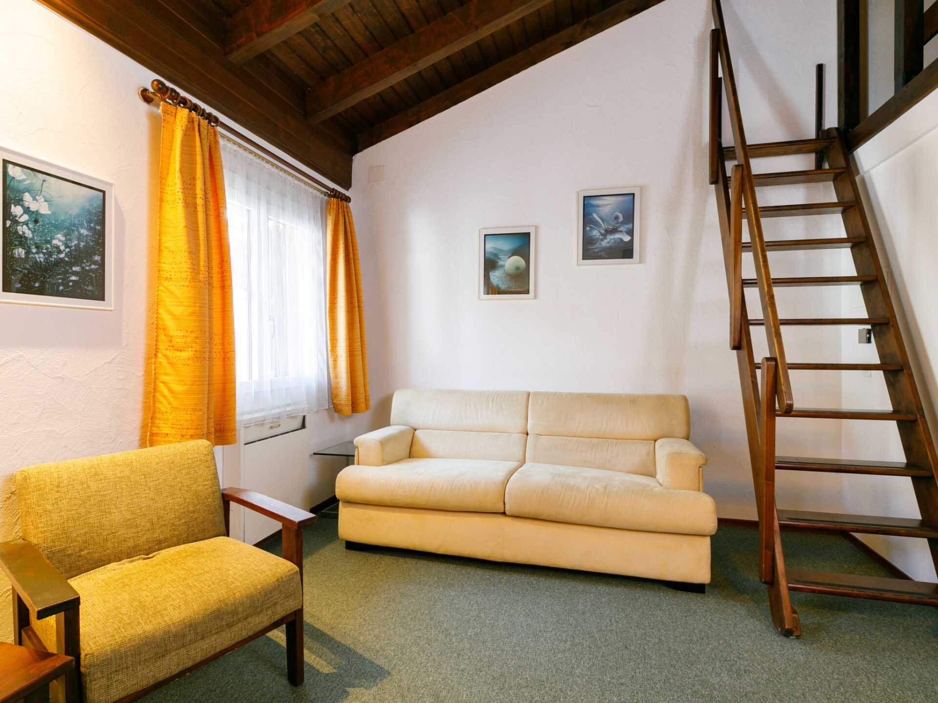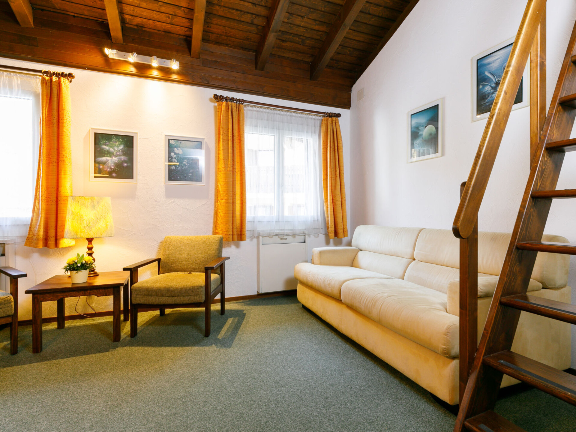 "Residenza Chesa Margun 15-3", appartement 1-kamer 29 m2 op 2 verdiepingen, op het noorden gelegen. Eenvoudig en doelmatig ingericht: woon-/eetkamer met 1 2-pers divanbed (170 cm, lengte 180 cm), eettafel en Kabel-TV. Keuken in de hal (4-pits kookplaat, oven, afwasmachine, waterkoker, elektrische koffiemachine). Douche/WC. Elektrische verwarming. Bovenverdieping: (steile trap) open galerij met afgeschuinde daken, hoogte van het plafond 140 - 190 cm met 1 2-pers bed (160 cm, lengte 190 cm). Vloerbedekking. Ter beschikking: Internet (WiFi, gratis). Garage, hoogte 203 cm, breedte 350 cm. Niet geschikt voor kleine kinderen appartement aan de binnenplaats. Niet rokers woning. Niet geschikt voor oudere mensen. In plaats van een afgesloten slaapkamer bevinden sommige slaapgedeeltes zich in een open ruimte (galerij, nis, etc.).