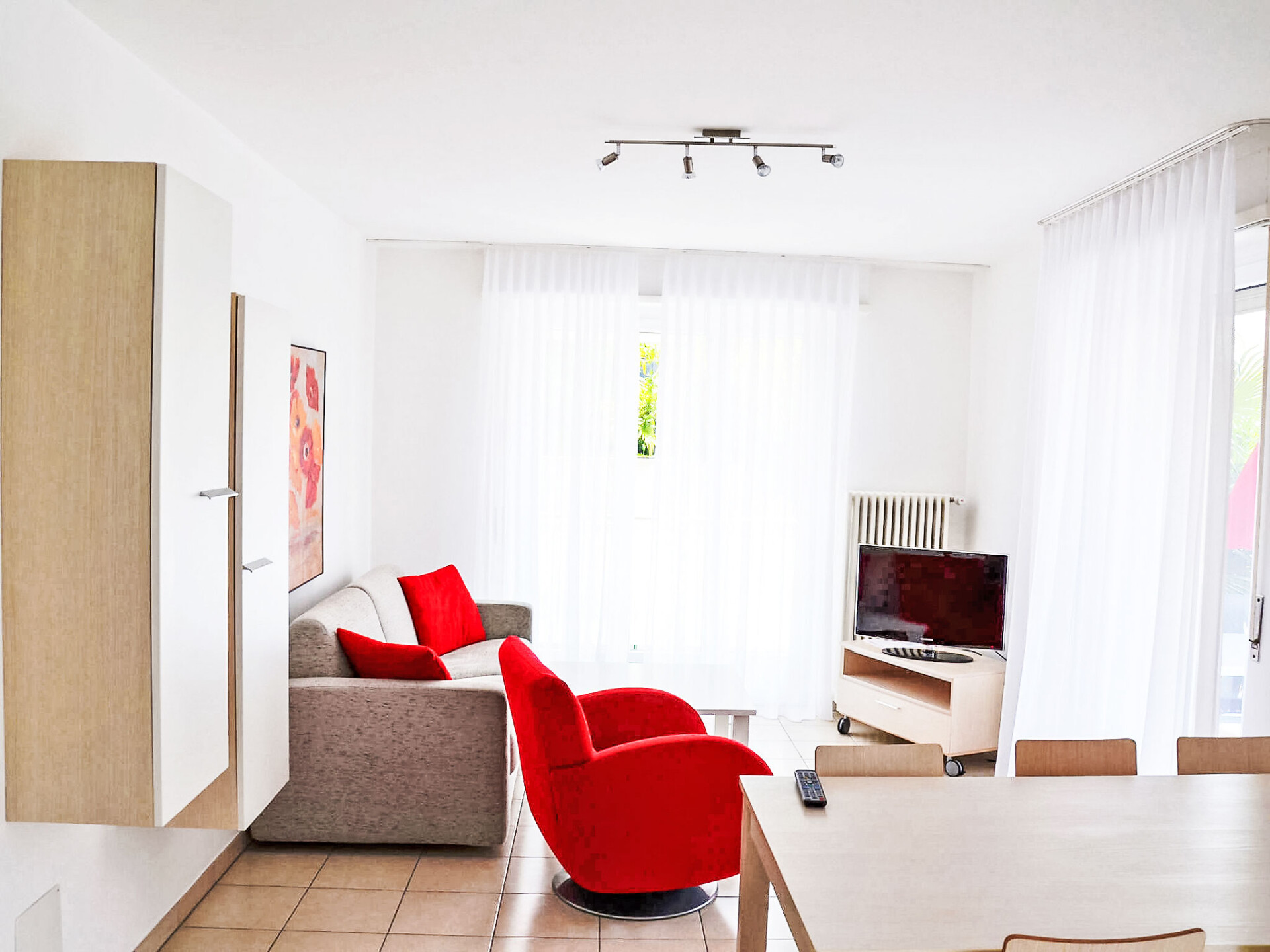 Appartement 3-kamers 84 m2, op de begane grond. Ruim en licht, comfortabel en smaakvol ingericht: open woon-/eetkamer met eettafel, Kabel-TV, Flatscreen TV en radio. Uitgang naar het balkon. 1 2-pers. kamer (2 x 90 cm, lengte 200 cm). Uitgang naar het balkon. 1 kamer met 2 bedden (90 cm, lengte 200 cm). Groot, open keuken (oven, afwasmachine, 4 keramische glas kookplaten, elektrische koffiemachine, pads voor de koffiemachine (Caffitaly) extra) met eettafel. Badkamer, aparte WC. 2 balkons. Balkonmeubilair. Niet rokers woning. Maximaal 1 huisdier/hond toegestaan. NL-00012327