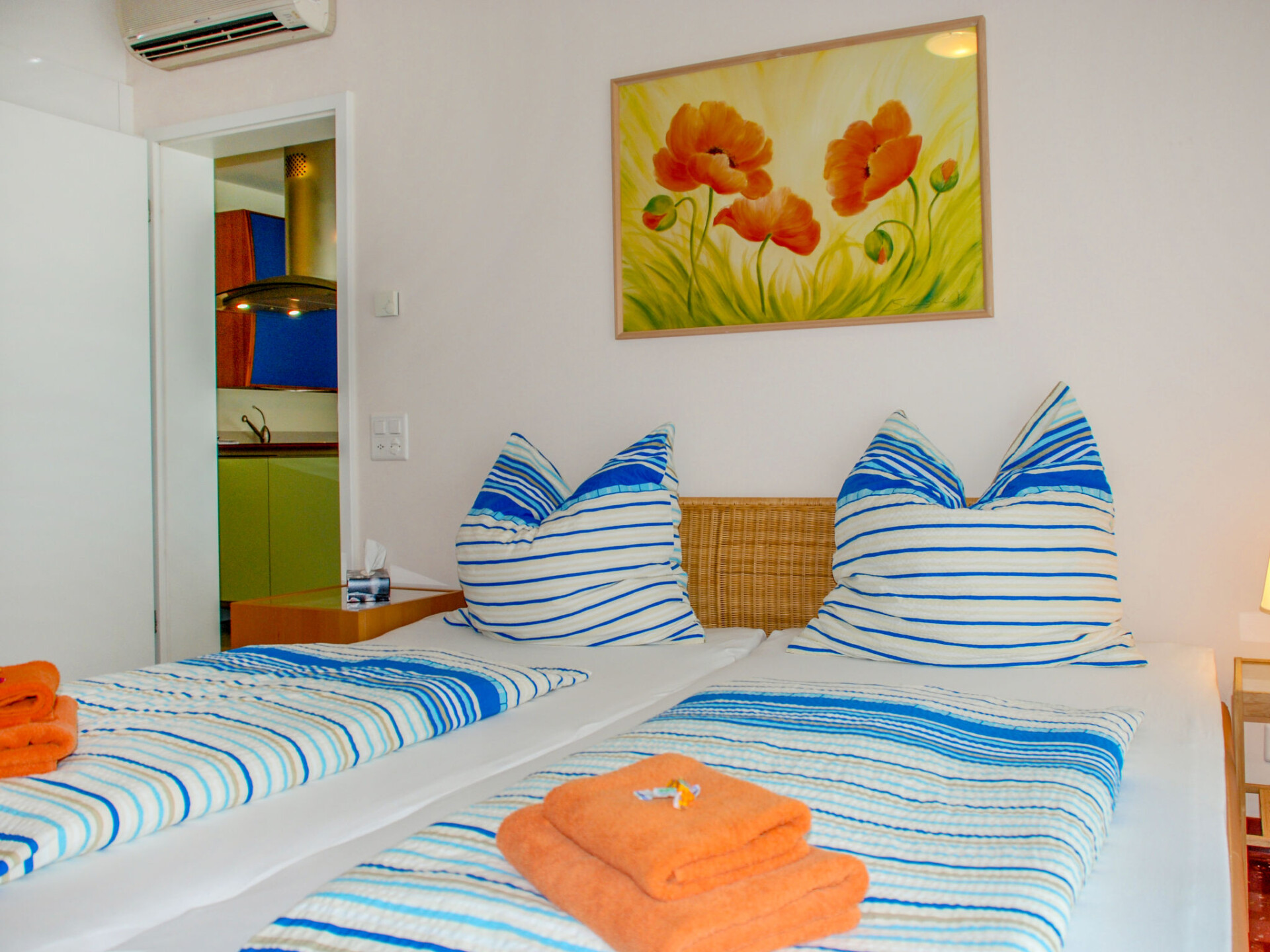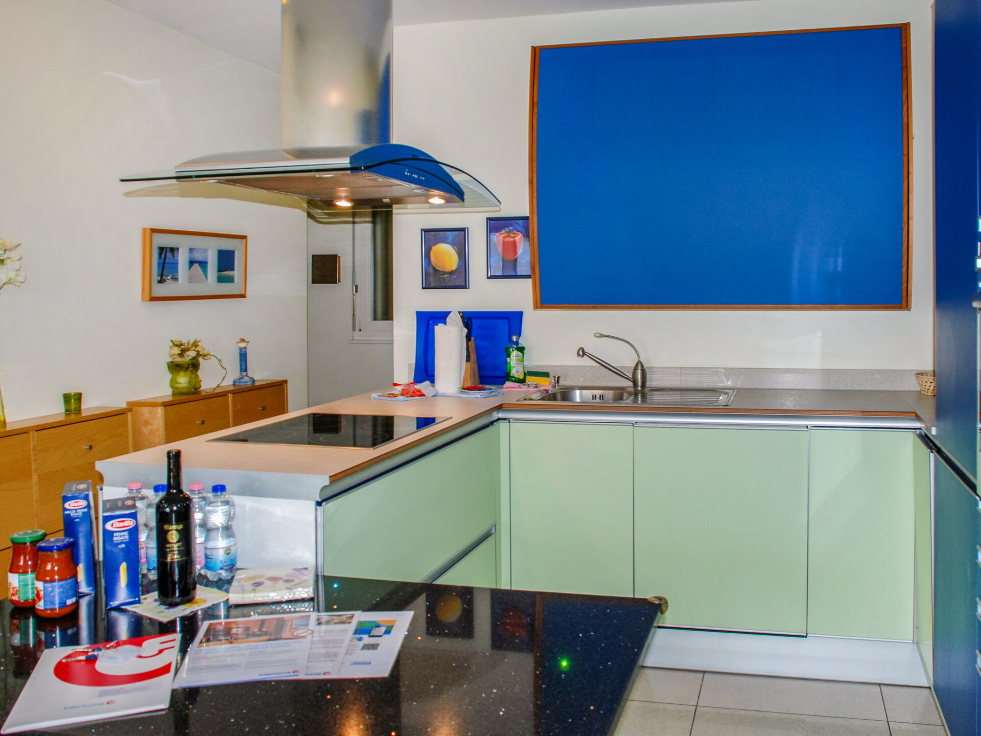 "Residenza Moro", appartement 3-kamers 56 m2 op de 1e verdieping. Ruim en licht, comfortabel en modern ingericht: open woon-/eetkamer met Sat-TV (Flatscreen TV), air-conditioning. Uitgang naar het balkon, naar het terras. 1 2-pers. kamer met 1 2-pers bed (2 x 100 cm, lengte 200 cm), bad/bidet/WC en air-conditioning. Uitgang naar het balkon. 1 kleine kamer met 2 bedden (90 cm, lengte 200 cm). Uitgang naar het balkon. Open keuken (oven, afwasmachine, 4 keramische glas kookplaten, broodrooster, waterkoker, magnetron, diepvriezer, elektrische koffiemachine) met kleine eettafel. Douche/WC. Vloerverwarming. 2 balkons 10 m2. Balkonmeubilair, ligstoelen (2). Beperkt uitzicht op het meer, de bergen en de plaats. Ter beschikking: kinderstoel, kinderbed tot 2 jaar (extra). Internet (WiFi, gratis). Parkeerplaats nr. 4 bij het huis. Niet rokers woning. NL-00004550
